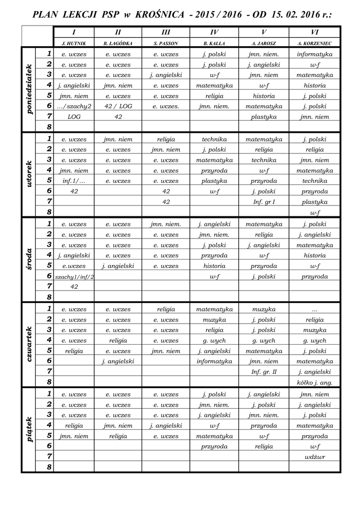 PLAN LEKCJI PSP w KROŚNICA - 2015 / 2016 - OD 15. 02. 2016 r.: III IV V VI J. HUTNIK B. ŁAGÓDKA S. PASSON B. KALLA A. JAROSZ A. KORZENIEC e. wczes e. wczes j. polski jmn. niem. informatyka e. wczes e. wczes j. polski j. angielski w-f e. wczes j. angielski w-f jmn. niem matematyka jmn. niem e. wczes matematyka w-f historia e. wczes e. wczes religia historia j. polski 42 / LOG e. wczes. jmn. niem. matematyka j. polski plastyka jmn. niem 1 e. wczes 2 e. wczes 3 e. wczes 4 j. angielski 5 jmn. niem 6 …/szachy2 7 LOG 8 1 2 3 4 5 6 7 8 piątek czwartek środa poniedziałek II wtorek I 42 e. wczes jmn. niem religia technika matematyka j. polski e. wczes e. wczes jmn. niem j. polski religia religia e. wczes e. wczes e. wczes matematyka technika jmn. niem jmn. niem e. wczes e. wczes przyroda w-f matematyka inf.1/… e. wczes e. wczes plastyka przyroda technika 42 w-f j. polski przyroda Inf. gr I plastyka 42 42 w-f 1 e. wczes 2 e. wczes 3 e. wczes 4 j. angielski 5 e.wczes 6 szachy1/inf/2 7 42 8 e. wczes jmn. niem. j. angielski matematyka j. polski e. wczes e. wczes jmn. niem. religia j. angielski e. wczes e. wczes j. polski j. angielski matematyka e. wczes e. wczes przyroda w-f historia j. angielski e. wczes historia przyroda w-f w-f j. polski przyroda 1 2 3 4 5 6 7 8 e. wczes e. wczes religia matematyka muzyka ... e. wczes e. wczes e. wczes muzyka j. polski religia e. wczes e. wczes e. wczes religia j. polski muzyka e. wczes religia e. wczes g. wych g. wych g. wych religia e. wczes jmn. niem j. angielski matematyka j. polski informatyka jmn. niem matematyka Inf. gr. II j. angielski 1 2 3 4 5 6 7 8 e. wczes e. wczes e. wczes j. polski j. angielski jmn. niem e. wczes e. wczes e. wczes jmn. niem. j. polski j. angielski e. wczes e. wczes e. wczes j. angielski jmn. niem. j. polski religia jmn. niem j. angielski w-f przyroda matematyka jmn. niem religia e. wczes matematyka w-f przyroda przyroda religia w-f j. angielski kółko j. ang. wdżwr