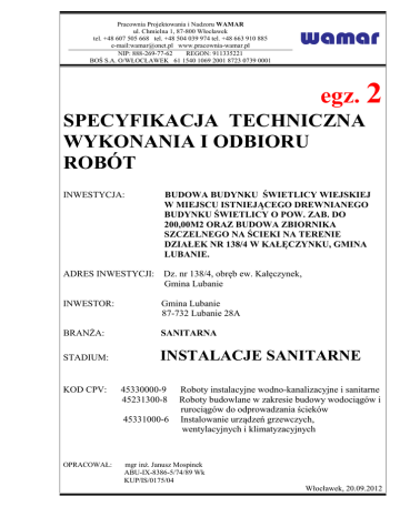 Pracownia Projektowania i Nadzoru WAMAR ul. Chmielna 1, 87-800 Włocławek tel. +48 607 505 668 tel. +48 504 039 974 tel. +48 663 910 885 e-mail:[email protected] www.pracownia-wamar.pl NIP: 888-269-77-62 REGON: 911335221 BOŚ S.A. O/WŁOCŁAWEK 61 1540 1069 2001 8723 0739 0001 egz. 2 SPECYFIKACJA TECHNICZNA WYKONANIA I ODBIORU ROBÓT INWESTYCJA: BUDOWA BUDYNKU ŚWIETLICY WIEJSKIEJ W MIEJSCU ISTNIEJĄCEGO DREWNIANEGO BUDYNKU ŚWIETLICY O POW. ZAB. DO 200,00M2 ORAZ BUDOWA ZBIORNIKA SZCZELNEGO NA ŚCIEKI NA TERENIE DZIAŁEK NR 138/4 W KAŁĘCZYNKU, GMINA LUBANIE. ADRES INWESTYCJI: Dz. nr 138/4, obręb ew. Kałęczynek, Gmina Lubanie INWESTOR: Gmina Lubanie 87-732 Lubanie 28A BRANŻA: SANITARNA STADIUM: INSTALACJE SANITARNE KOD CPV: 45330000-9 45231300-8 45331000-6 OPRACOWAŁ: Roboty instalacyjne wodno-kanalizacyjne i sanitarne Roboty budowlane w zakresie budowy wodociągów i rurociągów do odprowadzania ścieków Instalowanie urządzeń grzewczych, wentylacyjnych i klimatyzacyjnych mgr inż. Janusz Mospinek ABU-IX-8386-5/74/89 Wk KUP/IS/0175/04 Włocławek, 20.09.2012 BUDOWA BUDYNKU ŚWIETLICY WIEJSKIEJ WRAZ Z NIEZBĘDNĄ INFRASTRUKTURĄ NA TERENIE DZIAŁEK NR 138/4 W KAŁĘCZYNKU, GMINA LUBANIE. - INSTALACJE SANITARNE - SST SPIS TREŚCI I. WSTĘP 1. Przedmiot SST. 2. Zakres stosowania SST. 3. Zakres robót objętych SST. 4. Ogólne wymagania. 5. Określenia podstawowe. 6. Ogólne wymagania dotyczące robót. II. MATERIAŁY 1. Wymagania dotyczące materiałów. 2. Materiały III. SPRZĘT IV. TRANSPORT I SKŁADOWANIE V. WYKONYWANIE ROBÓT 1. INSTALACJA WODOCIĄGOWA . 1.1. Montaż rurociągów 1.2. Połączenia gwintowane 1.3. Połączenia zgrzewane 1.4. Tuleje ochronne 1.5. Badania i uruchomienie instalacji 1.6. Wykonanie izolacji ciepłochronnej 2. INSTALACJA PRZECIWPOŻAROWA 3. INSTALACJA KANALIZACYJNA 1. Cięcie rur 2. Łączenie rur i kształtek 3. Prowadzenie przewodów 4. Montaż syfonów odpływowych 5. Wentylowanie instalacji kanalizacyjnej 6. Przyłącza WC 7. Badanie szczelności kanalizacji 4. WYPOSAŻENIE, ARMATURA 5. INSTALACJA GRZEWCZA 6. REGULACJA INSTALACJI. 7. OZNACZENIA. 8. ZAKRES ROBÓT PRZYNALEŻNYCH VI. KONTROLA JAKOŚCI ROBÓT VII. OBMIAR ROBÓT VIII. ODBIÓR ROBÓT IX. PODSTAWA PŁATNOŚCI X. DOKUMENTY Pracownia Projektowania i Nadzoru WAMAR ul. Chmielna 1, 87-800 Włocławek tel. +48 607 505 668 tel. +48 504 039 974 e-mail:[email protected] Str.1 BUDOWA BUDYNKU ŚWIETLICY WIEJSKIEJ WRAZ Z NIEZBĘDNĄ INFRASTRUKTURĄ NA TERENIE DZIAŁEK NR 138/4 W KAŁĘCZYNKU, GMINA LUBANIE. - INSTALACJE SANITARNE - SST SPECYFIKACJA TECHNICZNA BUDOWY BUDYNKU ŚWIETLICY WIEJSKIEJ W MIEJSCU ISTNIEJĄCEGO DREWNIANEGO BUDYNKU ŚWIETLICY O POW. ZAB. DO 200,00M2 ORAZ BUDOWA ZBIORNIKA SZCZELNEGO NA ŚCIEKI NA TERENIE DZIAŁEK NR 138/4 W KAŁĘCZYNKU, GMINA LUBANIE. I. WSTĘP 1. Przedmiot SST. Przedmiotem SST są wymagania techniczne dotyczące wykonania i odbioru robót instalacji sanitarnych związanych z realizacją budowy budynku świetlicy wiejskiej wraz z niezbędną infrastrukturą na terenie dz. nr 138/4 obręb ew. Kałęczynek, gmina Lubanie. 2. Zakres stosowania SST. Szczegółowa specyfikacja techniczna jest stosowana jako dokument przetargowy i kontraktowy przy zleceniu i realizacji robót wymienionych w pkt.1. 3. Zakres robót objętych SST. • • • Instalacja wewnętrzna wody zimnej, ciepłej, Instalacja wewnętrzna kanalizacji sanitarnej, Instalacja grzewcza Roboty, których dotyczy specyfikacja, obejmują wszystkie czynności umożliwiające i mające na celu wykonanie nowej instalacji wodociągowo-kanalizacyjnej, wraz z wyposażeniem . Niniejsza specyfikacja techniczna związana jest z wykonaniem niżej wymienionych robót: Roboty sanitarne wewnętrzne: • Montaż rurociągów, • Montaż armatury, • Montaż urządzeń sanitarnych • Montaż wentylatorów • Badania instalacji, • Wykonanie izolacji termicznej, • Regulacja działania instalacji. • Przeprowadzenie pomiarów i badań wymaganych w specyfikacji technicznej. Wszystkie instalacje mają być wykonane zgodnie z obowiązującymi przepisami, polskimi normami, prawem budowlanym (aktualnie obowiązującym), regułami techniki, warunkami technicznymi wykonania i odbioru oraz muszą być przygotowane do bezusterkowego odbioru przez SANEPID, PIP i PSP. 4. Ogólne wymagania. Pracownia Projektowania i Nadzoru WAMAR ul. Chmielna 1, 87-800 Włocławek tel. +48 607 505 668 tel. +48 504 039 974 e-mail:[email protected] Str.2 BUDOWA BUDYNKU ŚWIETLICY WIEJSKIEJ WRAZ Z NIEZBĘDNĄ INFRASTRUKTURĄ NA TERENIE DZIAŁEK NR 138/4 W KAŁĘCZYNKU, GMINA LUBANIE. - INSTALACJE SANITARNE - SST Wykonawca jest odpowiedzialny za realizację robót zgodnie z dokumentacją projektową, specyfikacją techniczną, poleceniami nadzoru autorskiego i inwestorskiego oraz zgodnie z art. 5, 22, 23 i 28 ustawy Prawo budowlane, „Warunkami technicznymi wykonania i odbioru sieci wodociągowych” COBRTI INSTAL, Warszawa 2001 i „Warunkami technicznymi wykonania i odbioru robót budowlano-montażowych. Tom II Instalacje sanitarne i przemysłowe”. Odstępstwa od projektu mogą dotyczyć jedynie dostosowania instalacji do wprowadzonych zmian konstrukcyjno-budowlanych, lub zastąpienia zaprojektowanych materiałów – w przypadku niemożliwości ich uzyskania – przez inne materiały lub elementy o zbliżonych charakterystykach i trwałości. Wszelkie zmiany i odstępstwa od zatwierdzonej dokumentacji technicznej nie mogą powodować obniżenia wartości funkcjonalnych i użytkowych instalacji, a jeżeli dotyczą zamiany materiałów i elementów określonych w dokumentacji technicznej na inne, nie mogą powodować zmniejszenia trwałości eksploatacyjnej. Roboty montażowe należy realizować zgodnie z „Warunkami technicznymi wykonania i odbioru robót budowlanomontażowych. Tom II Instalacje sanitarne i przemysłowe”, Polskimi Normami, oraz innymi przepisami dotyczącymi przedmiotowej instalacji. Wraz z zawartymi w kosztorysie prze
