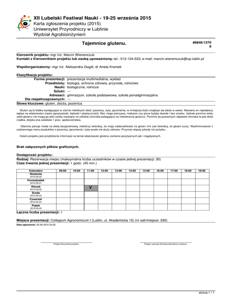 XII Lubelski Festiwal Nauki - 19-25 września 2015 Karta zgłoszenia projektu (2015) Uniwersytet Przyrodniczy w Lublinie Wydział Agrobioinżynierii Tajemnice glutenu. #6846/1370 9 Kierownik projektu: mgr inż. Marcin Wieremczuk Kontakt z Kierownikiem projektu lub osobą upoważnioną: tel.: 512-124-533; e-mail: [email protected] Współorganizatorzy: mgr inż. Aleksandra Gogół, dr Aneta Kramek Klasyfikacja projektu: Forma prezentacji: prezentacja multimedialna, wykład Przedmioty: biologia, ochrona zdrowia, przyroda, rolnictwo Nauki: biologiczne, rolnicze Sztuki: --Adresaci: gimnazjum, szkoła podstawowa, szkoła ponadgimnazjalna Dla niepełnosprawnych: --Słowa kluczowe: gluten, zboża, pszenica Gluten są to białka występujące w ziarnie niektórych zbóż: pszenicy, żyta, jęczmienia, w mniejszej ilości znajduje się także w owsie. Wywiera on największy wpływ na właściwości ciasta (sprężystość, lepkość i plastyczność). Bez niego pieczywo, makaron czy pizza byłyby twarde i bez smaku. Jednak pomimo wielu zalet glutenu nie mogą go jeść osoby cierpiące na celiakię (choroba polegająca na nietolerancji glutenu). Pomimo jej poważnych objawów choroba ta jest dość rzadka, dotyka ona zaledwie 1 proc. społeczeństwa. Obecnie panuje moda na dietę bezglutenową, niektórzy twierdzą, że mają nadwrażliwość na gluten inni zaś twierdzą, że gluten tuczy. Wyeliminowanie z codziennego menu produktów z pszenicy, jęczmienia i żyta wcale nie służy zdrowiu. Przynosi więcej szkody niż pożytku. Celem projektu jest przybliżenie informacji na temat właściwości glutenu zarówno pozytywnych jak i negatywnych. Brak załączonych plików graficznych. Dostępność projektu: Rodzaj: Rezerwacja miejsc (maksymalna liczba uczestników w czasie jednej prezentacji: 30) Czas trwania jednej prezentacji: 1 godz. (45 min.) Kalendarz Niedziela 09:00 10:00 11:00 12:00 13:00 14:00 15:00 16:00 17:00 18:00 19:00 2015-09-20 Poniedziałek 2015-09-21 V Wtorek 2015-09-22 Środa 2015-09-23 Czwartek 2015-09-24 Piątek 2015-09-25 Łączna liczba prezentacji: 1 Miejsce prezentacji: Collegium Agronomicum I (Lublin, ul. Akademicka 15) (nr sali/miejsce: 330) Data zgłoszenia: 02.06.2015 20:35 Podpis Kierownika projektu Podpis i pieczęć Dziekana/Dyrektora Instytutu strona 1 / 1 Powered by TCPDF (www.tcpdf.org)