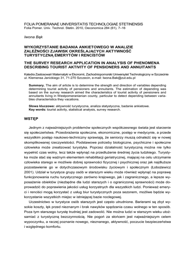 FOLIA POMERANAE UNIVERSITATIS TECHNOLOGIAE STETINENSIS Folia Pomer. Univ. Technol. Stetin. 2010, Oeconomica 284 (61), 7–16 Iwona Bąk WYKORZYSTANIE BADANIA ANKIETOWEGO W ANALIZIE ZALEŻNOŚCI ZJAWISK OKREŚLAJĄCYCH AKTYWNOŚĆ TURYSTYCZNĄ EMERYTÓW I RENCISTÓW THE SURVEY RESEARCH APPLICATION IN ANALYSIS OF PHENOMENA DESCRIBING TOURIST AKTIVITY OF PENSIONERS AND ANNUITANTS Katedra Zastosowań Matematyki w Ekonomii, Zachodniopomorski Uniwersytet Technologiczny w Szczecinie ul. Klemensa Janickiego 31, 71-270 Szczecin, e-mail: [email protected] Summary. The aim of article is to determine the strength and direction of variables depending determining tourist activity of pensioners and annuitants. The estimation of depending was based on the survey research aimed the characteristics of tourist activity of pensioners and annuitants living in Westpomeranianian county, particular to detect depending between variables characteristics they vacations. Słowa kluczowe: aktywność turystyczna, analiza statystyczna, badanie ankietowe. Key words: tourist activity, statistical analysis, survey research. WSTĘP Jednym z najważniejszych problemów społecznych współczesnego świata jest starzenie się społeczeństwa. Przeobrażenia społeczne, ekonomiczne, postęp w medycynie, a przede wszystkim postęp naukowo-techniczny sprawiają, że seniorzy muszą odnaleźć się w nowej skomplikowanej rzeczywistości. Podstawowe potrzeby biologiczne, psychiczne i społeczne człowieka może zrealizować turystyka. Poprzez działalność turystyczną można nie tylko wypełnić czas wolny, lecz także wpłynąć na przedłużenie średniej życia ludzkiego. Turystyka może stać się ważnym elementem rehabilitacji geriatrycznej, mającej na celu utrzymanie człowieka starego w możliwie dobrej sprawności fizycznej i psychicznej oraz jak najdłuższe pozostawienie go w dotychczasowym środowisku życiowym i społecznym (Łobożewicz 2001). Udział w turystyce grupy osób w starszym wieku może również wpłynąć na poprawę funkcjonowania ruchu turystycznego zarówno krajowego, jak i zagranicznego, a lepsze wyposażenie obiektów (niezbędne dla ludzi starszych i o ograniczonej sprawności) może doprowadzić do poprawienia jakości usług korzystnych dla wszystkich ludzi. Ponieważ emeryci i renciści mogą korzystać z usług biur turystycznych poza sezonem, możliwe będzie wykorzystanie wszystkich miejsc w istniejącej bazie noclegowej. Uczestnictwo w turystyce osób starszych jest często utrudnione. Barierami są zbyt wysokie koszty, lęk przed nieznanym i brak nawyków spędzania czasu wolnego w ten sposób. Poza tym starszego turystę trudniej jest zadowolić. Nie można ludzi w starszym wieku utożsamiać z turystyczną bezczynnością. Nie pogoń za słońcem jest najważniejszym celem wypoczynku, a raczej poznanie nowego, nieznanego, aktywność, poczucie bezpieczeństwa i względnego komfortu. 8 I. Bąk Za aktywność turystyczną uznaje się zespół zachowań człowieka odzwierciedlający się w jego aktywnej postawie wobec turystyki uprawianej w czasie wolnym, zakładający zmianę miejsca pobytu (Berbeka i in. 2008). Emeryci i renciści to grupa społeczna dysponująca dość dużymi zasobami wolnego czasu w ciągu całego roku. Przejście na emeryturę lub rentę umożliwiło podróżowanie wielu ludziom. Aktywne spędzanie wolnego czasu wolnego ma wpływ na zachowanie dobrej kondycji fizycznej i profilaktykę wielu chorób. Najczęściej, jak wykazują badania naukowe, aktywność ludzi starszych wynika ze względów zdrowotnych, szczególnie dla zachowania zdrowia bądź jego poprawy (95,5%). Istotne miejsce w hierarchii motywów podejmowania działań rekreacyjnych zajmują względy społeczne – nawiązywanie i podtrzymywanie kontaktów towarzyskich (59,2%). Zdaniem badanych aktywność rekreacyjna ma pozytywny wpływ nie tylko na ich stan zdrowia, ale i na osobowość – są zadowoleni z życia, pełni energii, rozwijają swoje zainteresowania. Zdobyte doświadczenia rekreacyjne przeobrażone w nawyki odgrywają bardzo ważną rolę w profilaktyce gerontologicznej (Napierała 2002). Celem opracowania jest próba określenia natężenia oraz kierunku zależności zmiennych określających aktywność turystyczną emerytów i rencistów. Ocena zależności została przeprowadzona na podstawie badania ankietowego, którego celem była charakterystyka aktywności turystycznej emerytów i rencistów zamieszkujących województwo zachodniopomorskie, a w szczególności wykrycie powiązań pomiędzy zmiennymi charakteryzującymi ich wyjazdy turystyczne. MATERIAŁ I METODA W naukach społecznych powszechnie stosowaną metodą zbierania informacji są badania sondażowe. Ankiety są szeroko stosowane w badaniach dotyczących poziomu życia ludności, rozumianego jako poziom materialnych warunków życia, a także w badaniach jakości życia, rozumianej jako subiektywna ocena sytuacji życiowej respondentów (Ostasiewicz 2004). Badania ankietowe mają wiele zalet, do których można zaliczyć m.in. oszczędność czasu i środków finansowych oraz anonimowość respondenta. Bardzo ważna jest prawidłowa konstrukcja kwestionariusza, a zwłaszcza poprawne i jasne sformułowanie pytań. Kwestionariusz ankietowy powinien zawierać następujące elementy: informację o instytucji prowadzącej badania, informację o celu badania, instrukcje dotyczące sposobu odpowiadania na pytania, pytania, dodatkowe wyjaśnienia (uzasadnienie wyboru określonego respondenta, podziękowania za wypełnienie ankiety, zapewnienie o poufności zebranych informacji itp.). Na potrzeby oceny związków między zmiennymi opisującymi aktywność turystyczną emerytów i rencistów skonstruowano kwestionariusz ankiety, w którym uwzględniono sześć pytań klasyfikacyjnych oraz 12 pytań dotyczących analizowanego zjawiska. W metryce znalazły się pytania o charakterze społeczno-demograficznym, dotyczące rodzaju gru