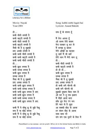 Literacy for a Billion Movie: Nayak Year:2001 Song: kabhi mithi lagati hai Lyricist: Anand Bakshi gks--dHkh ehBh yxrh gS dHkh [kV~Vh yxrh gS dHkh ehBh yxrh gS dHkh [kV~Vh yxrh gS tSlh Hkh gS rw eq>dks gk, vPNh yxrh gS dHkh dHkh ehBh yxrh gS dHkh dHkh [kV~Vh yxrh gS dHkh dHkh ehBh yxrh gS gks--dHkh >wBk yxrk gS dHkh lPpk yxrk gS dHkh >wBk yxrk gS lPpk yxrk gS tSlk Hkh gS rw eq>dks gk, vPNk yxrk gS dHkh dHkh >wBk yxrk gS dHkh dHkh lPpk yxrk gS dHkh dHkh >wBk yxrk gS gk, dHkh dHkh >wBk yxrk gS dHkh dHkh lPpk yxrk gS dHkh dHkh >wBk yxrk gS gk, lp gw¡ ds liuk gw¡ dHkh eSa ;s lkspw Nw ds rq>s ns[kw lp gS ;k dksbZ liuk dHkh eSa ;s lkspw Nw ds rq>s ns[kw lp gS ;k dksbZ liuk eSa rsjk viuk gw¡ vks lue rsjh dle esjk ,rckj rw dj ys eSa cj[kk rw ckny esjh vk¡[kksa dk dkt+y rw t+gk¡ eSa Hkh ogk¡ rsjh tku eSa esjh tku rw gks--dHkh ehBh yxrh gS dHkh [kV~Vh yxrh gS gks gks gks--dHkh >wBk yxrk gS lPpk yxrk gS tSlk Hkh gS rw eq>dks gk, vPNk yxrk gS gks dHkh yxs eksjuh lh dHkh yxs pksjuh lh rq>dks iqdk: fdl uke ls vks dj ns rw ,d b”kkjk eSa nkSM+h vkÅ¡ ;kjk Nk¡o /kwi esjk jax :i Rksjs I;kj ls gS tqM+k vk lcdks NksM+ ds vktk gj ca/ku rksM+ ds vktk lkFk lkFk jgs lax lax ,d nwljs ds fny esa PlanetRead is a tax-exempt, not-for-profit: 501(c) (3) in the United States and 80(G) in India. www.planetread.org [email protected] Page 1 of 2 Literacy for a Billion gks--dHkh ehBh yxrh gS dHkh [kV~Vh yxrh gS dHkh >wBk yxrk gS lPpk yxrk gS tSlk Hkh gS rw eq>dks gk, vPNk yxrk gS dHkh dHkh ehBh yxrh gS dHkh dHkh dHkh dHkh dHkh dHkh dHkh dHkh dHkh dHkh [kV~Vh yxrh gS ehBh yxrh gS >wBk yxrk gS lPpk yxrk gS >wBk yxrk gS gk, Disclaimer: PlanetRead does not own these lyrics and is not using them for any commercial purpose. For over 20 years, PlanetRead has been subtitling Bollywood songs for mass literacy. These lyrics are being offered as part of PlanetRead’s literacy development initiative. PlanetRead is a tax-exempt, not-for-profit: 501(c) (3) in the United States and 80(G) in India. www.planetread.org [email protected] Page 2 of 2