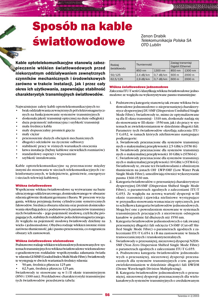 Sposób na kable światłowodowe Kable optotelekomunikacyjne stanowią zabezpieczenie włókien światłowodowych przed niekorzystnym oddziaływaniem zewnętrznych czynników mechanicznych i środowiskowych zarówno w trakcie instalacji, jak i przez cały okres ich użytkowania, zapewniając stabilność charakterystyk transmisyjnych światłowodów. Najwa¿niejsze zalety kabli optotelekomunikacyjnych to: brak oddzia³ywania zewnêtrznych pól elektromagnetycznych na funkcjonowanie systemów transmisyjnych doskona³a jakoæ transmisji optycznej na du¿e odleg³oci du¿a pojemnoæ informacyjna i szybkoæ transmisji ma³a rednica kabla ma³y dopuszczalny promieñ giêcia ma³y ciê¿ar przenoszenie du¿ych obci¹¿eñ mechanicznych d³ugoci odcinków na ¿yczenie odbiorcy stabilnoæ pracy w ró¿nych warunkach otoczenia ³atwa instalacja (bêbny kablowe niewielkich rozmiarów) standardowy osprzêt i wyposa¿enie szybkoæ instalowania. Rodzaj światłowodu 50/125 62,5/125 Włókna światłowodowe wielomodowe Podstawowe rodzaje w³ókien wielomodowych stosowanych w systemach transmisyjnych to w³ókna wiat³owodowe wielomodowe o gradientowym rozk³adzie wspó³czynnika za³amania wiat³a w rdzeniu GI-MMF (Graded-Index Multi Mode Fibre). wiat³owody te wystêpuj¹ w dwóch wariantach rednicy rdzenia: 50 µm, rednica p³aszcza 125 µm 62,5 µm, rednica p³aszcza 125 µm. wiat³owody te stosowane s¹ w I i II oknie transmisyjnym (850 i 1300 nm). Przyk³adowe charakterystyki transmisyjne tych wiat³owodów przedstawia tabela: Tłumienność 850 nm 2,4 dB/km 2,9 dB/km 1300 nm 0,7 dB/km 0,7 dB/km Zasięg transmisji Gigabit Ethernet 850 nm 1300 nm 600 m 2000 m 600 m 2000 m Włókna światłowodowe jednomodowe Zalecenia ITU-T serii G klasyfikuj¹ w³ókna wiat³owodowe jednomodowe ze wzglêdu na wykorzystywane pasmo transmisyjne: 1. Kable optotelekomunikacyjne s¹ przeznaczone miêdzy innymi do stosowania w sieciach telekomunikacyjnych i teleinformatycznych, w kolejnictwie, górnictwie, energetyce i sieciach telewizji kablowej. Włókna światłowodowe Wspó³czesne w³ókna wiat³owodowe s¹ wytwarzane na bazie ultraczystego szk³a kwarcowego, domieszkowanego w obszarze rdzenia g³ównie tlenkami germanu i fluoru. W procesie wyci¹gania, w³ókna przyjmuj¹ formê cylindrycznie symetrycznych falowodów. rednica obszaru rdzenia oraz poziom domieszkowania okrelaj¹ jeden z podstawowych parametrów transmisyjnych wiat³owodu jego pojemnoæ modow¹, czyli liczbê propaguj¹cych, stabilnych rozk³adów pola elektromagnetycznego. Ze wzglêdu na pojemnoæ modow¹ wiat³owody dzielimy na wielo- i jednomodowe. Obydwa rodzaje w³ókien istotnie ró¿ni zarówno t³umiennoæ, jak i pasmo przenoszenia, co rozgranicza obszary ich zastosowañ. Zenon Drabik Telekomunikacja Polska SA OTO Lublin 2. 3. 4. 56 Podstawow¹ kategoriê stanowi¹ tak zwane w³ókna wiat³owodowe jednomodowe o nieprzesuniêtej charakterystyce dyspersyjnej DU-SMF (Dispersion-Unshifted Single Mode Fibre). wiat³owody te, mimo ¿e optymalizowane s¹ dla II okna transmisji - 1310 nm, doskonale nadaj¹ siê do stosowania w III oknie - 1550 nm, jak i do pracy w systemach ze zwielokrotnianiem w dziedzinie d³ugoci fali. Parametry tych wiat³owodów okrelaj¹ zalecenia ITUT G.652, w ramach których zdefiniowano nastêpuj¹ce podkategorie: A. wiat³owody przeznaczone dla systemów transmisyjnych o maksymalnej przep³ywnoci 2,5 GBit/s (STM-16) B. wiat³owody przeznaczone dla systemów transmisyjnych o maksymalnej przep³ywnoci 10 GBit/s (STM-64) C. wiat³owody przeznaczone dla systemów transmisyjnych o maksymalnej przep³ywnoci 10 GBit/s (STM-64). wiat³owody te, zwane te¿ wiat³owodami z obni¿onym t³umieniem na jonach OH− LWP-SMF (Low Water Peak Single Mode Fibre), umo¿liwiaj¹ równie¿ wykorzystanie pasma 1360-1530 nm. Kategoria wiat³owodów o przesuniêtej charakterystyce dyspersyjnej DS-SMF (Dispersion Shifted Single Mode Fibre), o parametrach zgodnych z zaleceniami ITU-T G.653. Ze wzglêdu na zerow¹ wartoæ dyspersji w III oknie transmisji i zjawiska nieliniowe wystêpuj¹ce w przypadku stosowania wzmacniaczy optycznych, jest to schy³kowa kategoria wiat³owodów jednomodowych. Mog¹ byæ one z powodzeniem stosowane w systemach transmisyjnych pracuj¹cych z nierównym odstêpem kana³ów w pamie fal d³u¿szych ni¿ 1550 nm. Kategoria wiat³owodów jednomodowych o tak zwanej przesuniêtej d³ugoci fali odciêcia CS-SMF (Cut-off Shifted Single Mode Fibre) o parametrach zgodnych z zaleceniami ITU-T G.654 A i B ma zastosowanie w liniach transoceanicznych i transkontynentalnych. wiat³owody o przesuniêtej, niezerowej dyspersji NZDSSMF (Non Zero Dispersion Shifted Single Mode Fibre) o parametrach zgodnych z zaleceniami ITU-T G.655: A. Podstawowa kategoria wiat³owodów jednomodowych o przesuniêtej, niezerowej dyspersji przeznaczonych dla systemów transmisyjnych z tzw. gêstym zwielokrotnianiem w dziedzinie d³ugoci fali DWDM (Dense Wavelength Division Multiplexing). B. Kategoria wiat³owodów jednomodowych o przesuniêtej, niezerowej dyspersji przeznaczonych dla wielokana³owych systemów transmisyjnych o zredukowanym Twierdza nr 2/2003 odstêpie miêdzy kana³ami. Wymagania na dyspersjê polaryzacyjn¹ PMD (Polarization Mode Dispersion) dopuszczaj¹ pracê systemu przy przep³ywnoci binarnej 10 Gbit/s na dystansie 400 km. Stabilność charakterystyk transmisyjnych światłowodów Wszelkie odchylenia osi wiat³owodu od linii prostej powoduj¹ zaburzenia propagowanej fali elektromagnetycznej, skutkiem czego czêæ niesionej w rdzeniu wiat³owodu energii jest tracona. Zjawisko to odgrywa ogromn¹ rolê przy okrelaniu sprawnoci wiat³owodu w kablu. Zwykle odchy³ki osi wiat³owodu od linii prostej wyra¿a siê przez jego krzywiznê i klasyfikuje zale¿nie od jej czêstotliwoci przestrzennej na: sta³e lub wolnozmienne o okresie > 10 mm - makrozgiêcia (zgiêcia) szybkozmienne o okresie < 10 mm - mikrozgiêcia Straty na makrozgięciach G³
