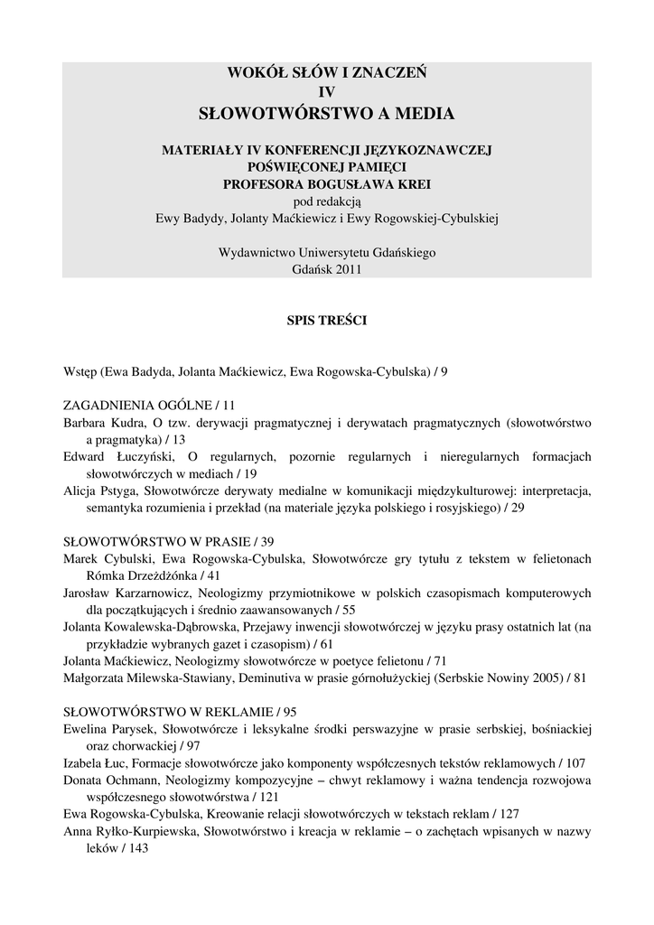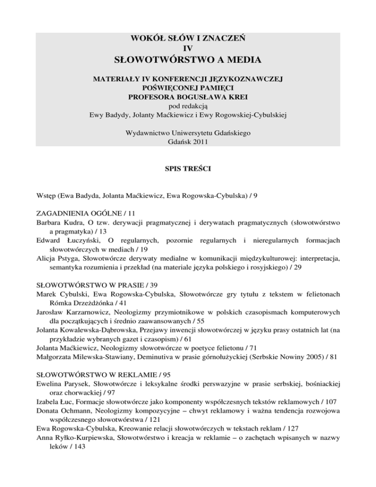 WOKÓŁ SŁÓW I ZNACZEŃ IV SŁOWOTWÓRSTWO A MEDIA MATERIAŁY IV KONFERENCJI JĘZYKOZNAWCZEJ POŚWIĘCONEJ PAMIĘCI PROFESORA BOGUSŁAWA KREI pod redakcją Ewy Badydy, Jolanty Maćkiewicz i Ewy Rogowskiej-Cybulskiej Wydawnictwo Uniwersytetu Gdańskiego Gdańsk 2011 SPIS TREŚCI Wstęp (Ewa Badyda, Jolanta Maćkiewicz, Ewa Rogowska-Cybulska) / 9 ZAGADNIENIA OGÓLNE / 11 Barbara Kudra, O tzw. derywacji pragmatycznej i derywatach pragmatycznych (słowotwórstwo a pragmatyka) / 13 Edward Łuczyński, O regularnych, pozornie regularnych i nieregularnych formacjach słowotwórczych w mediach / 19 Alicja Pstyga, Słowotwórcze derywaty medialne w komunikacji międzykulturowej: interpretacja, semantyka rozumienia i przekład (na materiale języka polskiego i rosyjskiego) / 29 SŁOWOTWÓRSTWO W PRASIE / 39 Marek Cybulski, Ewa Rogowska-Cybulska, Słowotwórcze gry tytułu z tekstem w felietonach Rómka Drzeżdżónka / 41 Jarosław Karzarnowicz, Neologizmy przymiotnikowe w polskich czasopismach komputerowych dla początkujących i średnio zaawansowanych / 55 Jolanta Kowalewska-Dąbrowska, Przejawy inwencji słowotwórczej w języku prasy ostatnich lat (na przykładzie wybranych gazet i czasopism) / 61 Jolanta Maćkiewicz, Neologizmy słowotwórcze w poetyce felietonu / 71 Małgorzata Milewska-Stawiany, Deminutiva w prasie górnołużyckiej (Serbskie Nowiny 2005) / 81 SŁOWOTWÓRSTWO W REKLAMIE / 95 Ewelina Parysek, Słowotwórcze i leksykalne środki perswazyjne w prasie serbskiej, bośniackiej oraz chorwackiej / 97 Izabela Łuc, Formacje słowotwórcze jako komponenty współczesnych tekstów reklamowych / 107 Donata Ochmann, Neologizmy kompozycyjne – chwyt reklamowy i ważna tendencja rozwojowa współczesnego słowotwórstwa / 121 Ewa Rogowska-Cybulska, Kreowanie relacji słowotwórczych w tekstach reklam / 127 Anna Ryłko-Kurpiewska, Słowotwórstwo i kreacja w reklamie – o zachętach wpisanych w nazwy leków / 143 SŁOWOTWÓRSTWO W INTERNECIE I CB-RADIU / 155 Ewa Badyda, Słowotwórcze sposoby deprecjonowania przeciwnika politycznego na forach internetowych na przykładzie nazwiska Tusk / 157 Renata Bizior, Derywaty słowotwórcze typu wysmuklacz w komunikacji internetowej / 167 Anna Brzostek, Akronimy w komunikacji internetowej / 179 Violetta Jaros, Deminutiva i ich funkcje w języku użytkowników CB-radia / 185 Iwona Kaproń-Charzyńska, O nazwach żeńskich typu kobieciara, samochodziara w komunikacji internetowej / 197 Michalina Rutka, Aktywność językowa użytkowników internetowego forum dyskusyjnego miau.pl jako element konsolidujący społeczność przyjaciół kotów / 207 Dorota Suska, Słowotwórstwo internetowe (próba funkcjonalnego opisu derywatów w wybranych gatunkach) / 215 Lucyna Warda-Radys, Przedpisca, przedpiśca, przedpiszca i inne formacje synonimiczne – kilka uwag o świadomości słowotwórczej internautów / 225 WPŁYW MEDIÓW NA SŁOWOTWÓRSTWO WSPÓŁCZESNEJ POLSZCZYZNY / 233 Edward Breza, Imiona typu Andy i Wiki / 235 Marcin Maciołek, Oddziaływanie rzeczywistości elektronicznej na system słowotwórczy polszczyzny / 249 Ewa Czerniakowska, Nazwy miejscowe z formantem -ówka na terenie Warszawy i okolic / 263 Artur Czesak, Celebryt, pasjonata i chuliganie – medialne przesunięcia paradygmatyczne / 279 Beata Milewska, Puchatkopodobny ‘zaledwie podobny do Puchatka’ / 291 Zofia Pomirska, Środki słowotwórcze w dziecięcym humorze językowym (na przykładach z mediów) / 297 Artur Rejter, Uniwerbizmy w języku prasy drugiej połowy XX wieku. Próba analizy diachronicznej / 307 VARIA / 319 Małgorzata Bortliczek, Proste i złożone derywaty przymiotnikowe i rzeczownikowe w adresowanym do dzieci popularnonaukowym dyskursie o dinozaurach / 321 Artur Bracki, Słowotwórstwo w służbie debaty politycznej we współczesnych mediach ukraińskich / 335
