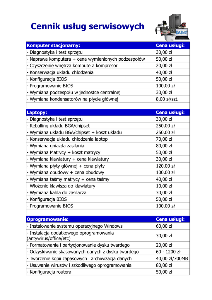 Cennik usług serwisowych Komputer stacjonarny: - Diagnostyka i test sprzętu - Naprawa komputera + cena wymienionych podzespołów - Czyszczenie wnętrza komputera kompresor - Konserwacja układu chłodzenia - Konfiguracja BIOS - Programowanie BIOS - Wymiana podzespołu w jednostce centralnej - Wymiana kondensatorów na płycie głównej Cena usługi: 30,00 zł 50,00 zł 20,00 zł 40,00 zł 50,00 zł 100,00 zł 30,00 zł 8,00 zł/szt. Laptopy: - Diagnostyka i test sprzętu - Reballing układu BGA/chipset - Wymiana układu BGA/chipset + koszt układu - Konserwacja układu chłodzenia laptop - Wymiana gniazda zasilania - Wymiana Matrycy + koszt matrycy - Wymiana klawiatury + cena klawiatury - Wymiana płyty głównej + cena płyty - Wymiana obudowy + cena obudowy - Wymiana taśmy matrycy + cena taśmy - Włożenie klawisza do klawiatury - Wymiana kabla do zasilacza - Konfiguracja BIOS - Programowanie BIOS Cena usługi: 30,00 zł 250,00 zł 250,00 zł 70,00 zł 80,00 zł 50,00 zł 30,00 zł 120,00 zł 100,00 zł 40,00 zł 10,00 zł 30,00 zł 50,00 zł 100,00 zł Oprogramowanie: - Instalowanie systemu operacyjnego Windows - Instalacja dodatkowego oprogramowania (antywirus/office/etc) - Formatowanie i partycjonowanie dysku twardego - Odzyskiwanie skasowanych danych z dysku twardego - Tworzenie kopii zapasowych i archiwizacja danych - Usuwanie wirusów i szkodliwego oprogramowania - Konfiguracja routera Cena usługi: 60,00 zł 30,00 zł 20,00 zł 60 - 1200 zł 40,00 zł/700MB 80,00 zł 50,00 zł