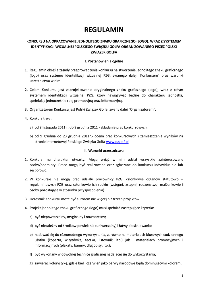 REGULAMIN KONKURSU NA OPRACOWANIE JEDNOLITEGO ZNAKU GRAFICZNEGO (LOGO), WRAZ Z SYSTEMEM IDENTYFIKACJI WIZUALNEJ POLSKIEGO ZWIĄZKU GOLFA ORGANIZOWANEGO PRZEZ POLSKI ZWIĄZEK GOLFA I. Postanowienia ogólne 1. Regulamin określa zasady przeprowadzenia konkursu na stworzenie jednolitego znaku graficznego (logo) oraz systemu identyfikacji wizualnej PZG, zwanego dalej "Konkursem" oraz warunki uczestnictwa w nim. 2. Celem Konkursu jest zaprojektowanie oryginalnego znaku graficznego (logo), wraz z całym systemem identyfikacji wizualnej PZG, który nawiązywad będzie do charakteru jednostki, spełniając jednocześnie rolę promocyjną oraz informacyjną. 3. Organizatorem Konkursu jest Polski Związek Golfa, zwany dalej "Organizatorem". 4. Konkurs trwa: a) od 8 listopada 2011 r. do 8 grudnia 2011 - składanie prac konkursowych, b) od 9 grudnia do 23 grudnia 2011r.- ocena prac konkursowych i zamieszczenie wyników na stronie internetowej Polskiego Związku Golfa www.pzgolf.pl. II. Warunki uczestnictwa 1. Konkurs ma charakter otwarty. Mogą wziąd w nim udział wszystkie zainteresowane osoby/podmioty. Prace mogą byd realizowane oraz zgłaszane do konkursu indywidualnie lub zespołowo. 2. W konkursie nie mogą brad udziału pracownicy PZG, członkowie organów statutowo – regulaminowych PZG oraz członkowie ich rodzin (wstępni, zstępni, rodzeostwo, małżonkowie i osoby pozostające w stosunku przysposobienia). 3. Uczestnik Konkursu może byd autorem nie więcej niż trzech projektów. 4. Projekt jednolitego znaku graficznego (logo) musi spełniad następujące kryteria: c) byd niepowtarzalny, oryginalny i nowoczesny; d) byd niezależny od środków powielania (uniwersalny) i łatwy do skalowania; e) nadawad się do różnorodnego wykorzystania, zarówno na materiałach biurowych codziennego użytku (koperta, wizytówka, teczka, listownik, itp.) jak i materiałach promocyjnych i informacyjnych (plakaty, banery, długopisy, itp.); f) byd wykonany w dowolnej technice graficznej nadającej się do wykorzystania; g) zawierad kolorystykę, gdzie biel i czerwieo jako barwy narodowe będą dominującymi kolorami; 1 h) zawierad element nawiązujący do golfa np. skrzyżowane kije golfowe, piłeczka golfowa, swing golfowy (ilustracja dynamicznego ruchu zamachu kijem); i) byd przygotowanym w wersji polskiej i angielskiej; j) składad się ze znaku graficznego i nazwy „PZG” która powinna byd jego integralną częścią, a w wersji rozszerzonej z nazwy „Polski Związek Golfa”. W przypadku wersji angielskiej projekt powinien składad się analogicznie, jak powyżej z nazw „PGU” oraz „Polish Golf Union”; k) zawierad współczesną, prostą czcionkę. 5. Pracę konkursową należy wykonad: a) w formie kolorowego wydruku w rozmiarze 150 mm x 150 mm na sztywnym podkładzie w formacie A4 (gramatura papieru min. 250 g/m2), b) w formie czarno-białego wydruku w rozmiarze 150 mm x 150 mm na sztywnym podkładzie w formacie A4 (gramatura papieru min. 250 g/m2), c) w wersji elektronicznej zapisanej na płycie CD lub DVD w formacie wektorowym cdr lub eps lub w formatach TIFF i JPG 300 DPI, do którego należy dołączyd opis techniczny dotyczący użytych kolorów i ewentualnie merytoryczny. Wersję elektroniczną pracy należy oznaczyd podając w nazwie pliku imię i nazwisko Autora/Autorów z odpowiednim rozszerzeniem. 6. W Konkursie będą rozpatrywane prace, które zostaną przesłane listem poleconym (decyduje data stempla pocztowego) lub dostarczone osobiście do Biura Polskiego Związku Golfa do dnia 8 grudnia 2011 r. do godz. 17.00 w zamkniętej kopercie na adres Organizatora: Polski Związek Golfa Al. Jerozolimskie 65/79 00-697 Warszawa, z dopiskiem "Konkurs na system identyfikacji wizualnej PZG". 7. Do przesłanej pracy należy obowiązkowo dołączyd podpisaną Kartę Zgłoszeniową, stanowiącą załącznik nr 1 do niniejszego regulaminu. 8. Prace konkursowe niespełniające wymagao, o których mowa w niniejszym regulaminie lub nadesłane po upływie terminu, o którym mowa w pkt. 6, nie będą podlegały ocenie. 9. Nadesłanie lub dostarczenie pracy konkursowej jest równoznaczne z przyjęciem warunków niniejszego regulaminu. 10.Zwycięzca Konkursu zobowiązany będzie w terminie 14 dni od dnia poinformowania go o zwycięstwie w Konkursie do opracowania pozostałych elementów systemu identyfikacji wizualnej przy wykorzystaniu jednolitego znaku graficznego (logo) wyłonionego w Konkursie, który obejmowad będzie dodatkowo następujące elementy: księga znaków oryginalnego znaku graficznego (logo), wzór prezentacji MS Power Point, wzór papieru firmowego - listownik, wzór papieru firmowego – fax, wzór wizytówek, wzór kopert, wzór teczek. 2 11.Zwycięzca Konkursu zobowiązuje się do niezgłaszania żadnych roszczeo względem Organizatora Konkursu z tytułu wykorzystania przez niego nadesłanej pracy konkursowej lub z tytułu jej niewykorzystania albo wykorzystania w ograniczonym zakresie. 12.Koszty przesyłki ponoszą autorzy prac. 13.Nadesłane prace i dokumenty nie podlegają zwrotowi. III. Nagrody 1. Komisja Konkursowa przyzna jedną nagrodę w wysokości 5000 zł brutto. 2. W przypadku, gdy wybrany projekt był realizowany zespołowo, nagroda przyznana zostanie zespołowi w łącznej wysokości 5000 zł brutto. 3. Przyznana nagroda zostanie pomniejszona o ciężary o charakterze publicznoprawnym zgodnie z obowiązującymi przepisami prawa. 4. Organizator Konkursu zastrzega sobie prawo do zakooczenia Konkursu bez jego rozstrzygnięcia. W takim przypadku nagroda nie zostanie przyznana. 5. Zwycięzca Konkursu zostanie powiadomiony listownie lub za pomocą poczty elektronicznej. 6. Nagroda zostanie wypłacona wyłonionemu zwycięzcy konkursu po zawarciu umowy o przeniesienie na Organizatora majątkowych praw autorskich do wybranego systemu identyfikacji wizualnej. Nagroda zostanie wypłacona przelewem na rachunek bankowy wskazany przez zwycięzcę konkursu w terminie 14 dni o