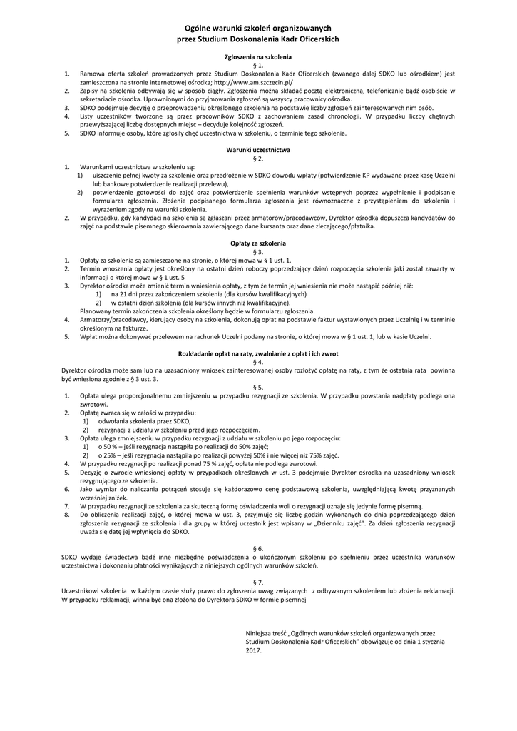 Ogólne warunki szkoleń organizowanych przez Studium Doskonalenia Kadr Oficerskich 1. 2. 3. 4. 5. Zgłoszenia na szkolenia § 1. Ramowa oferta szkoleń prowadzonych przez Studium Doskonalenia Kadr Oficerskich (zwanego dalej SDKO lub ośrodkiem) jest zamieszczona na stronie internetowej ośrodka; http://www.am.szczecin.pl/ Zapisy na szkolenia odbywają się w sposób ciągły. Zgłoszenia można składać pocztą elektroniczną, telefonicznie bądź osobiście w sekretariacie ośrodka. Uprawnionymi do przyjmowania zgłoszeń są wszyscy pracownicy ośrodka. SDKO podejmuje decyzję o przeprowadzeniu określonego szkolenia na podstawie liczby zgłoszeń zainteresowanych nim osób. Listy uczestników tworzone są przez pracowników SDKO z zachowaniem zasad chronologii. W przypadku liczby chętnych przewyższającej liczbę dostępnych miejsc – decyduje kolejność zgłoszeń. SDKO informuje osoby, które zgłosiły chęć uczestnictwa w szkoleniu, o terminie tego szkolenia. Warunki uczestnictwa § 2. 1. 2. 1. 2. 3. 4. 5. Warunkami uczestnictwa w szkoleniu są: 1) uiszczenie pełnej kwoty za szkolenie oraz przedłożenie w SDKO dowodu wpłaty (potwierdzenie KP wydawane przez kasę Uczelni lub bankowe potwierdzenie realizacji przelewu), 2) potwierdzenie gotowości do zajęć oraz potwierdzenie spełnienia warunków wstępnych poprzez wypełnienie i podpisanie formularza zgłoszenia. Złożenie podpisanego formularza zgłoszenia jest równoznaczne z przystąpieniem do szkolenia i wyrażeniem zgody na warunki szkolenia. W przypadku, gdy kandydaci na szkolenia są zgłaszani przez armatorów/pracodawców, Dyrektor ośrodka dopuszcza kandydatów do zajęć na podstawie pisemnego skierowania zawierającego dane kursanta oraz dane zlecającego/płatnika. Opłaty za szkolenia § 3. Opłaty za szkolenia są zamieszczone na stronie, o której mowa w § 1 ust. 1. Termin wnoszenia opłaty jest określony na ostatni dzień roboczy poprzedzający dzień rozpoczęcia szkolenia jaki został zawarty w informacji o której mowa w § 1 ust. 5 Dyrektor ośrodka może zmienić termin wniesienia opłaty, z tym że termin jej wniesienia nie może nastąpić później niż: 1) na 21 dni przez zakończeniem szkolenia (dla kursów kwalifikacyjnych) 2) w ostatni dzień szkolenia (dla kursów innych niż kwalifikacyjne). Planowany termin zakończenia szkolenia określony będzie w formularzu zgłoszenia. Armatorzy/pracodawcy, kierujący osoby na szkolenia, dokonują opłat na podstawie faktur wystawionych przez Uczelnię i w terminie określonym na fakturze. Wpłat można dokonywać przelewem na rachunek Uczelni podany na stronie, o której mowa w § 1 ust. 1, lub w kasie Uczelni. Rozkładanie opłat na raty, zwalnianie z opłat i ich zwrot § 4. Dyrektor ośrodka może sam lub na uzasadniony wniosek zainteresowanej osoby rozłożyć opłatę na raty, z tym że ostatnia rata powinna być wniesiona zgodnie z § 3 ust. 3. § 5. 1. Opłata ulega proporcjonalnemu zmniejszeniu w przypadku rezygnacji ze szkolenia. W przypadku powstania nadpłaty podlega ona zwrotowi. 2. Opłatę zwraca się w całości w przypadku: 1) odwołania szkolenia przez SDKO, 2) rezygnacji z udziału w szkoleniu przed jego rozpoczęciem. 3. Opłata ulega zmniejszeniu w przypadku rezygnacji z udziału w szkoleniu po jego rozpoczęciu: 1) o 50 % – jeśli rezygnacja nastąpiła po realizacji do 50% zajęć; 2) o 25% – jeśli rezygnacja nastąpiła po realizacji powyżej 50% i nie więcej niż 75% zajęć. 4. W przypadku rezygnacji po realizacji ponad 75 % zajęć, opłata nie podlega zwrotowi. 5. Decyzję o zwrocie wniesionej opłaty w przypadkach określonych w ust. 3 podejmuje Dyrektor ośrodka na uzasadniony wniosek rezygnującego ze szkolenia. 6. Jako wymiar do naliczania potrąceń stosuje się każdorazowo cenę podstawową szkolenia, uwzględniającą kwotę przyznanych wcześniej zniżek. 7. W przypadku rezygnacji ze szkolenia za skuteczną formę oświadczenia woli o rezygnacji uznaje się jedynie formę pisemną. 8. Do obliczenia realizacji zajęć, o której mowa w ust. 3, przyjmuje się liczbę godzin wykonanych do dnia poprzedzającego dzień zgłoszenia rezygnacji ze szkolenia i dla grupy w której uczestnik jest wpisany w „Dzienniku zajęć”. Za dzień zgłoszenia rezygnacji uważa się datę jej wpłynięcia do SDKO. § 6. SDKO wydaje świadectwa bądź inne niezbędne poświadczenia o ukończonym szkoleniu po spełnieniu przez uczestnika warunków uczestnictwa i dokonaniu płatności wynikających z niniejszych ogólnych warunków szkoleń. § 7. Uczestnikowi szkolenia w każdym czasie służy prawo do zgłoszenia uwag związanych z odbywanym szkoleniem lub złożenia reklamacji. W przypadku reklamacji, winna być ona złożona do Dyrektora SDKO w formie pisemnej Niniejsza treść „Ogólnych warunków szkoleń organizowanych przez Studium Doskonalenia Kadr Oficerskich” obowiązuje od dnia 1 stycznia 2017.