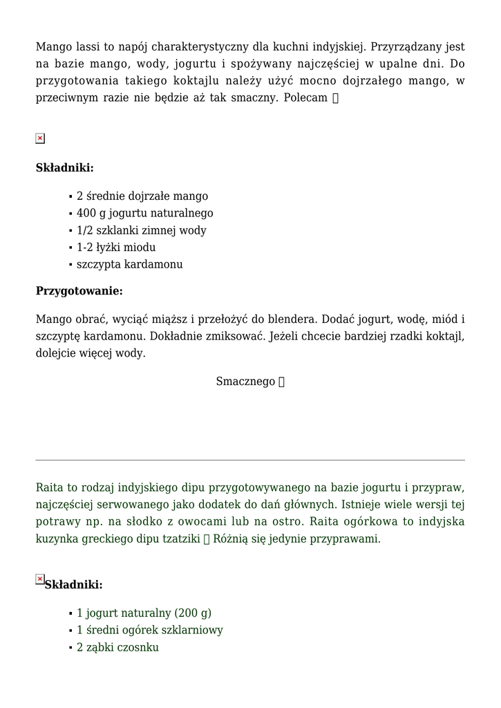 Mango lassi,Raita z ogórkiem,Indyjskie rybne