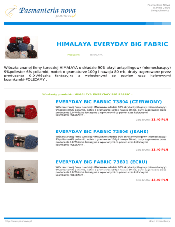 Pasmanteria NOVA ul.Polna 24/30 Świętochłowice HIMALAYA EVERYDAY BIG FABRIC Producent: HIMALAYA Włóczka znanej firmy tureckiej HIMALAYA o składzie 90% akryl antypilingowy (niemechacący) 9%poliester 6% poliamid, motek o gramaturze 100g i nawoju 80 mb, druty sugerowane przez producenta 9,0.Włóczka fantazyjna z wplecionymi co pewien czas kolorowymi kosmkamki-POLECAMY . Warianty produktu HIMALAYA EVERYDAY BIG FABRIC : EVERYDAY BIC FABRIC 73804 (CZERWONY) Włóczka znanej firmy tureckiej HIMALAYA o składzie 90% akryl antypilingowy (niemechacący) 9%poliester 6% poliamid, motek o gramaturze 100g i nawoju 80 mb, druty sugerowane przez producenta 9,0.Włóczka fantazyjna z wplecionymi co pewien czas kolorowymi kosmkamki-POLECAMY . Cena brutto: 13,40 PLN EVERYDAY BIC FABRIC 73806 (JEANS) Włóczka znanej firmy tureckiej HIMALAYA o składzie 90% akryl antypilingowy (niemechacący) 9%poliester 6% poliamid, motek o gramaturze 100g i nawoju 80 mb, druty sugerowane przez producenta 9,0.Włóczka fantazyjna z wplecionymi co pewien czas kolorowymi kosmkamki-POLECAMY . Cena brutto: 13,40 PLN EVERYDAY BIG FABRIC 73801 (ECRU) Włóczka znanej firmy tureckiej HIMALAYA o składzie 90% akryl antypilingowy (niemechacący) 9%poliester 6% poliamid, motek o gramaturze 100g i nawoju 80 mb, druty sugerowane przez producenta 9,0.Włóczka fantazyjna z wplecionymi co pewien czas kolorowymi kosmkamki-POLECAMY . Cena brutto: http://www.pasnova.pl 13,40 PLN sklep internetowy Pasmanteria NOVA ul.Polna 24/30 Świętochłowice EVERYDAY BIG FABRIC 73802 (BEŻ) Włóczka znanej firmy tureckiej HIMALAYA o składzie 90% akryl antypilingowy (niemechacący) 9%poliester 6% poliamid, motek o gramaturze 100g i nawoju 80 mb, druty sugerowane przez producenta 9,0.Włóczka fantazyjna z wplecionymi co pewien czas kolorowymi kosmkamki-POLECAMY . Cena brutto: 13,40 PLN EVERYDAY BIG FABRIC 73803 (POPIEL JASNY) Włóczka znanej firmy tureckiej HIMALAYA o składzie 90% akryl antypilingowy (niemechacący) 9%poliester 6% poliamid, motek o gramaturze 100g i nawoju 80 mb, druty sugerowane przez producenta 9,0.Włóczka fantazyjna z wplecionymi co pewien czas kolorowymi kosmkamki-POLECAMY . Cena brutto: 13,40 PLN EVERYDAY BIG FABRIC 73805 (MORSKI) Włóczka znanej firmy tureckiej HIMALAYA o składzie 90% akryl antypilingowy (niemechacący) 9%poliester 6% poliamid, motek o gramaturze 100g i nawoju 80 mb, druty sugerowane przez producenta 9,0.Włóczka fantazyjna z wplecionymi co pewien czas kolorowymi kosmkamki-POLECAMY . Cena brutto: 13,40 PLN EVERYDAY BIG FABRIC 73807 (GRANAT) Włóczka znanej firmy tureckiej HIMALAYA o składzie 90% akryl antypilingowy (niemechacący) 9%poliester 6% poliamid, motek o gramaturze 100g i nawoju 80 mb, druty sugerowane przez producenta 9,0.Włóczka fantazyjna z wplecionymi co pewien czas kolorowymi kosmkamki-POLECAMY . Cena brutto: 13,40 PLN EVERYDAY BIG FABRIC 73808 (CZARNY) Włóczka znanej firmy tureckiej HIMALAYA o składzie 90% akryl antypilingowy (niemechacący) 9%poliester 6% poliamid, motek o gramaturze 100g i nawoju 80 mb, druty sugerowane przez producenta 9,0.Włóczka fantazyjna z wplecionymi co pewien czas kolorowymi kosmkamki-POLECAMY . Cena brutto: 13,40 PLN EVERYDAY BIG FABRIC 73809 (BRĄZ) Włóczka znanej firmy tureckiej HIMALAYA o składzie 90% akryl antypilingowy (niemechacący) 9%poliester 6% poliamid, motek o gramaturze 100g i nawoju 80 mb, druty sugerowane przez producenta 9,0.Włóczka fantazyjna z wplecionymi co pewien czas kolorowymi kosmkamki-POLECAMY . Cena brutto: http://www.pasnova.pl 13,40 PLN sklep internetowy