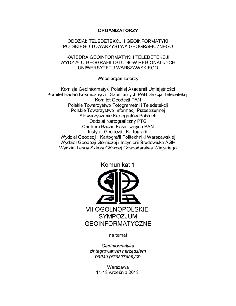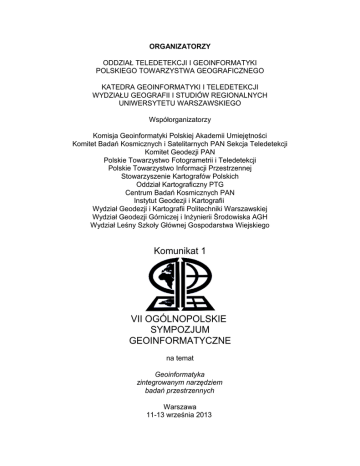 ORGANIZATORZY ODDZIAŁ TELEDETEKCJI I GEOINFORMATYKI POLSKIEGO TOWARZYSTWA GEOGRAFICZNEGO KATEDRA GEOINFORMATYKI I TELEDETEKCJI WYDZIAŁU GEOGRAFII I STUDIÓW REGIONALNYCH UNIWERSYTETU WARSZAWSKIEGO Współorganizatorzy Komisja Geoinformatyki Polskiej Akademii Umiejętności Komitet Badań Kosmicznych i Satelitarnych PAN Sekcja Teledetekcji Komitet Geodezji PAN Polskie Towarzystwo Fotogrametrii i Teledetekcji Polskie Towarzystwo Informacji Przestrzennej Stowarzyszenie Kartografów Polskich Oddział Kartograficzny PTG Centrum Badań Kosmicznych PAN Instytut Geodezji i Kartografii Wydział Geodezji i Kartografii Politechniki Warszawskiej Wydział Geodezji Górniczej i Inżynierii Środowiska AGH Wydział Leśny Szkoły Głównej Gospodarstwa Wiejskiego Komunikat 1 VII OGÓLNOPOLSKIE SYMPOZJUM GEOINFORMATYCZNE na temat Geoinformatyka zintegrowanym narzędziem badań przestrzennych Warszawa 11-13 września 2013 O SYMPOZJUM Zapraszamy na kolejne VII OGÓLNOPOLSKIE SYMPOZJUM GEOINFORMATYCZNE Pierwsze Sympozjum zorganizowane zostało w 2001 roku w Wysowej, przez Klub Teledetekcji Środowiska Polskiego Towarzystwa Geograficznego, przy współpracy Zakładu Teledetekcji Środowiska Wydziału Geografii i Studiów Regionalnych Uniwersytetu Warszawskiego, Komisji Geoinformatyki Polskiej Akademii Umiejętności, Komisji Teledetekcji Komitetu Badań Kosmicznych i Satelitarnych PAN, Instytutu Geografii i Przestrzennego Zagospodarowania PAN, Polskiego Towarzystwa Fotogrametrii i Teledetekcji i Polskiego Towarzystwa Informacji Przestrzennej. Spełniło ono znakomicie rolę forum wymiany poglądów naukowych i wiedzy praktycznej oraz zaowocowało zacieśnieniem kontaktów wielu środowisk zajmujących się geoinformatyką, zarówno na polu zawodowym jak i prywatnym. W następnych latach do grona organizatorów dołączyli: Akademia Górniczo-Hutnicza, Politechnika Krakowska, Stowarzyszenie Kartografów Polskich, Instytut Geodezji i Kartografii, Stowarzyszenie Geodetów Polskich, Instytut Geografii i Gospodarki Przestrzennej Uniwersytetu Jagiellońskiego. Na Sympozjum tym uzgodniono, że spotkania tego typu będą odbywały się, co dwa lata i będą organizowane przez jednego lub dwóch organizatorów głównych przy wsparciu pozostałych organizacji. Wyrażamy przekonanie, że zechcecie Państwo spotkać się na kolejnym VII OGÓLNOPOLSKIM SYMPOZJUM GEOINFORMATYCZNYM, aby podzielić się swoimi doświadczeniami w zakresie wiedzy teoretycznej, metodyki i praktycznych zastosowań szeroko rozumianej GEOINFORMATYKI. Konfrontacja doświadczeń i prezentacja różnych zagadnień przestrzennych przyczyni się do integracji narzędzi wykorzystywanych przez teledetekcję, systemy informacji geograficznej, fotogrametrię, geodezję i kartografię. Do uczestnictwa w VII Sympozjum zapraszamy pracowników nauki, praktyków, pracowników administracji, którzy na co dzień zajmują się problematyką związaną z geoinformatyką i geoinformacją, a także studentów i doktorantów, którzy w przyszłości będą zajmowali się problematyką geoinformatyczną. W ramach Sympozjum na sesjach plenarnych zostaną zaprezentowane referaty przedstawiające dorobek ostatnich dwóch lat w zakresie nauki i praktyki, w których geoinformatyka odgrywa istotną rolę. Dlatego zapraszamy autorów do zaprezentowania referatów metodycznych z zakresu samej geoinformatyki, takich jak modele danych przestrzennych, modelowanie i analizy przestrzenne, infrastruktury geoinformacyjne, a także z zakresów: – fotogrametrii (dot. problemów integracji danych skaningu laserowego i danych fotogrametrycznych, automatyzacji opracowań fotogrametrycznych, weryfikacji jakości ortofotomapy, pola zastosowań zdjęć z bezzałogowych środków latających oraz fotogrametrii bliskiego zasięgu); – teledetekcji (np. nowe teledetekcyjne technologie lotnicze i satelitarne, monitoring środowiska, europejskie programy: „Copernicus”, „Geoland” i in., metody przetwarzania obrazów, w tym klasyfikacja i detekcja zmian na zdjęciach satelitarnych różnej rozdzielczości przestrzennej i czasowej); – kartografii (dot. automatyzacji generalizacji kartograficznej, współczesnych form map, kartografii mobilnej, mapy jako interfejsu i form wizualizacji w Internecie oraz kartografii tematycznej); – informacji przestrzennej (dot. zrządzania informacją przestrzenną, INSPIRE, geoportali w Polsce, uporządkowania sfery danych referencyjnych z uwzględnieniem harmonizacji i metadanych); – zastosowań geoinformatyki w naukach o Ziemi: geografii, geologii, geofizyce, hydrologii, górnictwie, ochronie środowiska, itp. Przewidziane są również sesje posterowe poprzedzane krótkimi wystąpieniami uczestników. Teksty prezentacji posterowych będą drukowane na równi z referatami wygłaszanymi. Liczymy na tradycyjne zainteresowanie Sympozjum, zapewnimy przyjemną i koleżeńską atmosferę oraz dobre warunki obrad. KOMITET NAUKOWY • • • • • • • • • • • • • Prof. dr hab. Jan R. Olędzki – Przewodniczący Komitetu Naukowego Sympozjum, Przewodniczący Oddziału Teledetekcji i Geoinformatyki PTG, Wiceprzewodniczący Komisji Geoinformatyki PAU, Przewodniczący Sekcji Teledetekcji Komitetu Badań Kosmicznych i Satelitarnych PAN Dr hab. inż. Joanna Bac-Bronowicz – Przewodnicząca Stowarzyszenia Kartografów Polskich Dr Marek Baranowski – Przewodniczący Oddziału Kartograficznego PTG, Dyrektor Instytutu Geodezji i Kartografii Dr hab. inż. Krzysztof Będkowski – Wydział Leśny Szkoły Głównej Gospodarstwa Wiejskiego Dr hab. inż. Elżbieta Bielecka – Komitet Geodezji PAN, Wojskowa Akademia Techniczna Prof. dr hab. inż. Aleksandra Bujakiewicz - Przewodnicząca Polskiego Towarzystwa Fotogrametrii i Teledetekcji, Komitet Geodezji PAN Prof. dr hab. inż. Tadeusz Chrobak – Przewodniczący Komisji Geoinformatyki PAU, Wiceprzewodniczący Komitetu Geodezji PAN Prof. dr hab. Katarzyna Dąbrowska-Zielińska – Instytut Geod