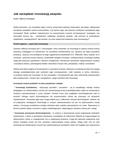 Jak zarządzać innowacją zespołu Autor: Marcin Kowalski Każdy kierownik, czy menadżer staje w końcu przed dość istotnym dylematem, jak lepiej i efektywniej zarządzać zespołem swoich pracowników. Czy oprócz tego, jest jeszcze możliwość zarządzania jego innowacją? Wiele spotkań nastawionych na poszukiwanie nowych innowacyjnych rozwiązań, czy pomysłów kończy się… umówieniem kolejnego spotkania zespołu. Jak kończyć je konkretnymi ustaleniami, rozwiązaniami? Jak sprawić, by nasz zespół był kreatywny oraz innowacyjny? Punkt wyjścia – czym jest innowacja Autorem definicji innowacji jest J. Schumpeter, który stwierdził, że innowacja to istotna zmiana funkcji produkcji, polegająca na odmiennym niż uprzednio kombinowaniu tzn. łączeniu ze sobą czynników produkcji. Jeszcze inne podejście do tego zagadnienia przedstawił G.S. Altshuller, który uważał, że w innowacji zachodzi proces twórczy i podkreślał związek innowacji z kreatywnością. Innowacja według niego jest złożonym zjawiskiem i zbiorem umiejętności, odmiennym sposobem organizowania, syntezy i wyrażania wiedzy, postrzegania świata i tworzenia nowych idei, perspektyw, reakcji i produktów. Ważne jest także pojęcie innowacyjności w wymiarze procesu. Nieznany wcześniej produkt lub usługa danego przedsiębiorstwa jest wynikiem jego innowacyjności. Jeśli zostanie w końcu wdrożony, w praktyce stanie się innowacją. W tym przypadku, innowacyjność jest więc zdolnością zastosowania aktu kreatywności, nowych idei, wynalazków, czego wynikiem jest innowacja. Innowacje można podzielić na dwa zasadnicze rodzaje: * Innowację produktową - dotyczącą wyrobów i procesów - są to wszelkiego rodzaju zmiany polegające na udoskonaleniu wyrobu już wytwarzanego przez przedsiębiorstwo, bądź na rozszerzeniu struktury asortymentowej o nowy produkt. Produkt nowy pod względem technologicznym jest to produkt, którego cechy technologiczne lub przeznaczenie różnią się znacząco od uprzednio wytwarzanych. Innowacje tego typu mogą wiązać się z całkowicie nowymi technologiami, opierać się na połączeniu istniejących technologii w nowych zastosowaniach lub też na wykorzystaniu nowej wiedzy. Innowacja produktowa została wdrożona jeśli została wprowadzona na rynek. Stosowany tu termin produkt należy rozumieć w ujęciu marketingowym, obejmującym zarówno towary jak i usługi. * Innowacje procesowe (technologiczne) - to zmiany w stosowanych przez organizację metodach wytwarzania, a także w sposobach docierania z produktem do odbiorców. Metody te mogą polegać na dokonywaniu zmian w urządzeniach lub w organizacji produkcji, mogą też stanowić połączenie tych dwóch rodzajów zmian lub być wynikiem wykorzystania nowej wiedzy. Mogą mieć one na celu produkcje lub dostarczenie nowych lub udoskonalonych produktów, które nie mogłyby być wytworzone str. 1 czy też dostarczone przy pomocy metod konwencjonalnych. Celem tych metod może być także zwiększenie efektywności produkcji lub dostarczenie istniejących produktów. Co raz częściej można dostrzec 6 podstawowych obszarów innowacji w biznesie. Są to przede wszystkim: PRODUKT TECHNOLOGIA LOGISTYKA INNOWACJA MODELE BIZNESOWE USŁUGI MARKETING Źródło: Harvard Business Press, 2009 Ostatnio wielu ekspertów zwraca jednak uwagę na to, że zdolność firm do innowacji - tj. wykorzystanie nowych pomysłów, aby stworzyć nowe lub ulepszone produkty bądź procesy - zależy od ich potencjału innowacyjnego. Z kolei ten potencjał zależy zarówno od przedsiębiorcy np. właściciela, członków Zarządu, jak i od pracowników firmy oraz ich kwalifikacji, doświadczenia i postaw, a także od wielu innych czynników poza firmą. Wybrane metody i techniki zarządzania innowacją zespołu Przedstawię, kilka moim zdaniem najciekawszych i najskuteczniejszych metod, które mają wpływ na proces zarządzania innowacją zespołu pracowników. Możemy tutaj wyróżnić 4 podstawowe grupy technik: 1. Metody i techniki wykorzystania twórczego myślenia zespołu • Burza mózgów - to chyba najbardziej znana technika tworzenia i generowania pomysłów, nazywana jest również techniką Osborna (od nazwiska twórcy). Ta technika ma pomóc przezwyciężyć warunki negatywnie wpływające na powstawanie pomysłów. Proces wykorzystania tej techniki polega, aby w pierwszej kolejności sformułować problem (jasno i zwięźle). Następnym str. 2 krokiem jest zebranie zespołu pracowników, którzy wezmą udział w burzy mózgów. W grupie musi być wybrana osoba, która będzie prowadziła sesję i zapisywała pomysły. Sesja powinna przebiegać według bardzo określonych zasad: zapisywanie pomysłów w widocznym miejscu (np. na kartce flipchartu, tablicy,slajdzie) ich ilość jest ważniejsza od jakości, pomysły powinny być zgłaszane w sposób zwięzły, nie wolno ich oceniać, należy wyznaczyć określony czas na sesję burzy mózgów – 15, 20 minut. Po zebraniu pomysłów następuje sesja ich wartościowania. Uczestnicy spotykają się po kilku dniach, by je ocenić i dodać ewentualnie nowe. • Dyskusja 66 - jest to technika trochę podobna do burzy mózgów. Sama jej nazwa pochodzi ze sposobu pracy nad poszukiwaniem innowacyjnych rozwiązań, pomysłów. Ilość osób w zespole i czas ich pracy jest umowna. Jakie są podstawowe zasady: grupę pracowników należy podzielić na sześcioosobowe zespoły, w każdym zespole, prowadzący przez sześć minut prowadzi burzę mózgów, po uzgodnionym czasie zespoły spotykają się, prezentują swoje pomysły, ostatnim elementem jest wspólna dyskusja (obu zespołów). Zaletą tej techniki jest to, że można wprowadzić efekt pewnego współzawodnictwa między pracownikami. • Dyskusja 635 - jest to technika zbliżona do wcześniejszej. Zasady są następujące: grupę pracowników dzieli się na sześcioosobowe zespoły, które siadają w kołach na sali, k