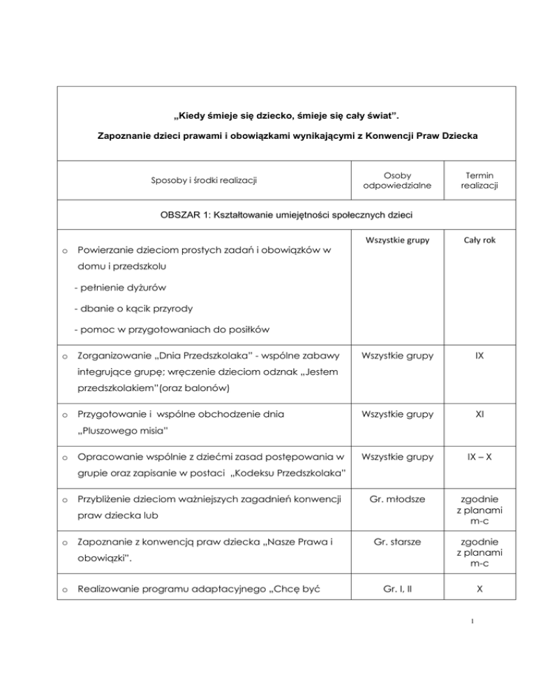„Kiedy śmieje się dziecko, śmieje się cały świat”. Zapoznanie dzieci prawami i obowiązkami wynikającymi z Konwencji Praw Dziecka Sposoby i środki realizacji Osoby odpowiedzialne Termin realizacji OBSZAR 1: Kształtowanie umiejętności społecznych dzieci o Wszystkie grupy Cały rok Wszystkie grupy IX Wszystkie grupy XI Wszystkie grupy IX – X Gr. młodsze zgodnie z planami m-c Gr. starsze zgodnie z planami m-c Gr. I, II X Powierzanie dzieciom prostych zadań i obowiązków w domu i przedszkolu - pełnienie dyżurów - dbanie o kącik przyrody - pomoc w przygotowaniach do posiłków o Zorganizowanie „Dnia Przedszkolaka” - wspólne zabawy integrujące grupę; wręczenie dzieciom odznak „Jestem przedszkolakiem”(oraz balonów) o Przygotowanie i wspólne obchodzenie dnia „Pluszowego misia” o Opracowanie wspólnie z dziećmi zasad postępowania w grupie oraz zapisanie w postaci „Kodeksu Przedszkolaka” o Przybliżenie dzieciom ważniejszych zagadnień konwencji praw dziecka lub o Zapoznanie z konwencją praw dziecka „Nasze Prawa i obowiązki”. o Realizowanie programu adaptacyjnego „Chcę być 1 dzielnym przedszkolakiem” o Pasowanie na przedszkolaka dzieci z młodszych grup Gr. I, II X - XI OBSZAR 3: Wspomaganie rozwoju mowy dzieci o Przybliżenie znaczenia pojęć: dobro, prawda, miłość Wszystkie grupy zgodnie z planami m-c Wszystkie grupy zgodnie z planami m-c piękno, przyjaźń koleżeństwo w oparciu o literaturę dziecięcą oraz własne doświadczenia i spostrzeżenia dzieci.. o Wykorzystywanie bajek terapeutycznych w celu zapoznania dzieci, jak mogą radzić sobie w sytuacjach trudnych emocjonalnie. OBSZAR 5: Wychowanie zdrowotne i kształtowanie sprawności fizycznej dzieci. o Udział w Programie Przedszkolnym Edukacji Gr. V XI K. Żmojda, IX – VI Antynikotynowej „Czyste powietrze wokół nas” o Realizowanie programu „Akademia zdrowego przedszkolaka” o Udział w olimpijce organizowanej przez SP nr 2 oraz A. Meina Gr. V IV – V Przedszkole Samorządowe nr 53 o Prowadzenie zajęć ruchowych we wszystkich grupach Wszystkie grupy wiekowych. o Organizowanie zabaw i zajęć ruchowych o ogrodzie przedszkolnym z wykorzystaniem przyborów Wszystkie grupy zgodnie z planami m-c zgodnie z planami m-c 2 gimnastycznych. OBSZAR 6: Wdrażanie dzieci do dbałości o bezpieczeństwo własne oraz innych. o Realizacja programu „bezpieczny przedszkolak” o Ukazanie skutków nieprzestrzegania zasad K. Żmojda Wszystkie grupy bezpieczeństwa w oparciu o przykłady z literatury zgodnie z planami m-c dziecięcej (do wyboru): − „Kąpiel”, „Skończyły się wakacje”, „Zima, lód, łyżwy”, „Ostrożnie z zapałkami”, „Grzybowy weekend”, „Ogród pełen niespodzianek”, „Dziś Twoich przeprosin nie przyjmuję” – A. Mikulska − „Znajomy taty”, „Bazie”, „M. Wiśniewska-Koszela − „Fatalna pomyłka” - D. Rozwens − „Pierwsze spotkanie” - N. Gruszka − „Niegrzeczny pisklak” - M. Królikowski OBSZAR 7: Wychowanie przez sztukę – dziecko widzem i aktorem o Wzbudzanie emocji poprzez udział w przedstawieniach Wszystkie grupy inscenizowanych bezpośrednio przez aktorów. raz w miesiącu OBSZAR 9 Wychowanie przez sztukę – różne formy plastyczne. o Tworzenie plakatu „Jesteśmy szczęśliwi” – praca zbiorowa Wszystkie grupy I – II Wszystkie grupy VI poszczególnych grup (wyeksponowanie w holu przedszkolnym) o Prezentacja prac plastycznych „Moje marzenie” w 3 trakcie festynu rodzinnego dnia rodziny połączona z aukcją prac. o Zorganizowanie na łamach przedszkolnej gazetki konkursu plastycznego „Śmieje się dziecko, śmieje się J.Zajczyk V D.Łukjańczuk cały świat” lub („O uśmiech dziecka”) OBSZAR 14 Kształtowanie gotowości do nauki czytania i pisania. o Słuchanie fragmentów książki „Król Maciuś pierwszy” J. Gr. starsze Korczaka oraz opowiadania „Prawa dziecka” H. Hajzak o Czytanie przez rodziców literatury dziecięcej w cyklu Wszystkie grupy „Poczytaj mi mamo, poczytaj mi tato” zgodnie z planami m-c zgodnie z planami m-c OBSZAR 15. Wychowanie rodzinne, obywatelskie i patriotyczne. o Przygotowanie prezentacji multimedialnej „Jesteśmy przedszkolakami znamy swoje prawa i obowiązki” K. Petelczyc, A. Meina V – VI będącej podsumowaniem całorocznej pracy „Powiedz mi, a zapomnę, pokaż, a zapamiętam. pozwól zrobić, a zrozumiem”. Poznawanie otaczającego świata na drodze doświadczeń. Sposoby i środki realizacji Osoby odpowiedzialne Termin realizacji OBSZAR 1: Kształtowanie umiejętności społecznych dzieci o Opracowanie wspólnie z dziećmi zasad zachowania się Grupy IV, V IX - XII podczas spacerów i wycieczek. 4 OBSZAR 3: Wspomaganie rozwoju mowy dzieci o Słuchanie utworów literatury dziecięcej dotyczącej Wszystkie grupy przyrody nieożywionej np.: − „Jedna srebrna kropla” – H. Bechlerowa − „U króla Baruby” – P. Szarzec − „Razem ze słonkiem” – M. Kownacka − „Czy śnieg jest czysty?” – H. Zdzitowiecka − „O ciekawym wróbelku” – J. Duszyńska − „Żywioły w przedszkolu – powietrze, woda, ogień” – G. Zgodnie z planami mies. Walter OBSZAR 4: Wspieranie dzieci w rozwijaniu czynności intelektualnych o Poznawanie w trakcie doświadczeń właściwości Wszystkie grupy Zgodnie z planami mies. Grupy realizujące program Akademia Zdrowego Przedszkolaka Zgodnie z programem Wszystkie grupy Zgodnie z planami mies. powietrza, np.: − rozszerzalność powietrza pod wpływem temperatury (balon i podgrzewana butelka) − − wpływ powietrza na spalanie (odcięcie dopł. pow.) obserwowanie zachowania przedmiotów wystawionych na działanie wiatru (spadochron, wiatraczki, samoloty, latawce, balony, itp.) − hodowanie pleśniaków - „Zdrowa i niezdrowa żywność”, zwracanie uwagi na wpływ powietrza oraz innych czynników na powstawanie pleśni o Sprawdzanie cech wody poprzez: − zmianę stanów s