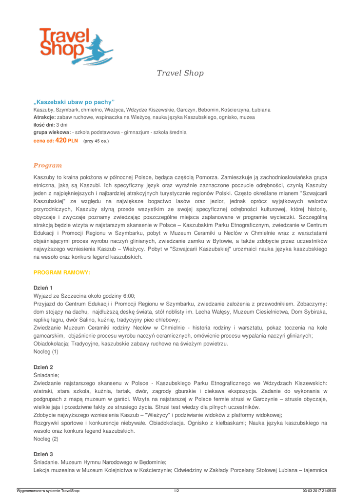Travel Shop „Kaszebski ubaw po pachy” Kaszuby, Szymbark, chmielno, Wieżyca, Wdzydze Kiszewskie, Garczyn, Bebomin, Kościerzyna, Łubiana Atrakcje: zabaw ruchowe, wspinaczka na Wieżycę, nauka języka Kaszubskiego, ognisko, muzea ilość dni: 3 dni grupa wiekowa: - szkoła podstawowa - gimnazjum - szkoła średnia cena od: 420 PLN (przy 45 os.) Program Kaszuby to kraina położona w północnej Polsce, będąca częścią Pomorza. Zamieszkuje ją zachodniosłowiańska grupa etniczna, jaką są Kaszubi. Ich specyficzny język oraz wyraźnie zaznaczone poczucie odrębności, czynią Kaszuby jeden z najpiękniejszych i najbardziej atrakcyjnych turystycznie regionów Polski. Często określane mianem "Szwajcarii Kaszubskiej" ze względu na największe bogactwo lasów oraz jezior, jednak oprócz wyjątkowych walorów przyrodniczych, Kaszuby słyną przede wszystkim ze swojej specyficznej odrębności kulturowej, której historię, obyczaje i zwyczaje poznamy zwiedzając poszczególne miejsca zaplanowane w programie wycieczki. Szczególną atrakcją będzie wizyta w najstarszym skansenie w Polsce – Kaszubskim Parku Etnograficznym, zwiedzanie w Centrum Edukacji i Promocji Regionu w Szymbarku, pobyt w Muzeum Ceramiki u Neclów w Chmielnie wraz z warsztatami objaśniającymi proces wyrobu naczyń glinianych, zwiedzanie zamku w Bytowie, a także zdobycie przez uczestników najwyższego wzniesienia Kaszub – Wieżycy. Pobyt w "Szwajcarii Kaszubskiej" urozmaici nauka języka kaszubskiego na wesoło oraz konkurs legend kaszubskich. PROGRAM RAMOWY: Dzień 1 Wyjazd ze Szczecina około godziny 6:00; Przyjazd do Centrum Edukacji i Promocji Regionu w Szymbarku, zwiedzanie założenia z przewodnikiem. Zobaczymy: dom stojący na dachu, najdłuższą deskę świata, stół noblisty im. Lecha Wałęsy, Muzeum Ciesielnictwa, Dom Sybiraka, replikę łagru, dwór Salino, kuźnię, tradycyjny piec chlebowy; Zwiedzanie Muzeum Ceramiki rodziny Neclów w Chmielnie - historia rodziny i warsztatu, pokaz toczenia na kole garncarskim, objaśnienie procesu wyrobu naczyń ceramicznych, omówienie procesu wypalania naczyń glinianych; Obiadokolacja; Tradycyjne, kaszubskie zabawy ruchowe na świeżym powietrzu. Nocleg (1) Dzień 2 Śniadanie; Zwiedzanie najstarszego skansenu w Polsce - Kaszubskiego Parku Etnograficznego we Wdzydzach Kiszewskich: wiatraki, stara szkoła, kuźnia, tartak, dwór, zagrody gburskie i ciekawa ekspozycja. Zadanie do wykonania w podgrupach z mapą muzeum w garści. Wizyta na najstarszej w Polsce fermie strusi w Garczynie – strusie obyczaje, wielkie jaja i przedziwne fakty ze strusiego życia. Strusi test wiedzy dla pilnych uczestników. Zdobycie najwyższego wzniesienia Kaszub – "Wieżycy" i podziwianie widoków z platformy widokowej; Rozgrywki sportowe i konkurencje niebywałe. Obiadokolacja. Ognisko z kiełbaskami; Nauka języka kaszubskiego na wesoło oraz konkurs legend kaszubskich. Nocleg (2) Dzień 3 Śniadanie. Muzeum Hymnu Narodowego w Będominie; Lekcja muzealna w Muzeum Kolejnictwa w Kościerzynie; Odwiedziny w Zakłady Porcelany Stołowej Lubiana – tajemnica Wygenerowane w systemie TravelShop 1/2 03-03-2017 21:05:09 produkcji pięknych filiżanek i talerzy, zwiedzanie zakładów z przewodnikiem i możliwość zakupienia upominku w sklepie firmowym po bardzo atrakcyjnych cenach; Planowany powrót do Szczecina około godziny 21:00. Cena zawiera Transport autokarem, 2 noclegi, 2 śniadania, 2 obiadokolacje, realizację programu , bilety wstępu do atrakcji wymienionych w programie, opiekę i komentarz pilota Travel Shop, miejsca gratis dla 4 Opiekunów (przy 45 uczestnikach), ubezpieczenie NNW i KL, podatek VAT. CENA NIE ZAWIERA: Ewentualnego obiadu w drodze powrotnej +20 PLN/os. Dodatkowe informacje UWAGI: *Cena zostały ustalona dla grup liczących co najmniej 45 pełnopłatnych uczestników, **Cena dla grupy wyjeżdżającej ze Szczecina, ***Kolejność zwiedzania może ulec zmianie – wszelkie potencjalne zmiany wprowadzone będą po konsultacji z grupą; Treść oferty nie stanowi oferty handlowej w rozumieniu art 66 § 1 kodeksu cywilnego oraz innych właściwych przepisów prawnych. Wygenerowane w systemie TravelShop 2/2 03-03-2017 21:05:09
