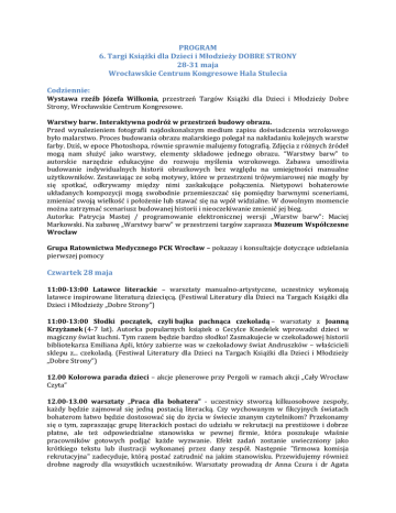 PROGRAM 6. Targi Książki dla Dzieci i Młodzieży DOBRE STRONY 28-31 maja Wrocławskie Centrum Kongresowe Hala Stulecia Codziennie: Wystawa rzeźb Józefa Wilkonia, przestrzeń Targów Książki dla Dzieci i Młodzieży Dobre Strony, Wrocławskie Centrum Kongresowe. Warstwy barw. Interaktywna podróż w przestrzeń budowy obrazu. Przed wynalezieniem fotografii najdoskonalszym medium zapisu doświadczenia wzrokowego było malarstwo. Proces budowania obrazu malarskiego polegał na nakładaniu kolejnych warstw farby. Dziś, w epoce Photoshopa, równie sprawnie malujemy fotografią. Zdjęcia z różnych źródeł mogą nam służyć jako warstwy, elementy składowe jednego obrazu. “Warstwy barw” to autorskie narzędzie edukacyjne do rozwoju myślenia wzrokowego. Zabawa umożliwia budowanie indywidualnych historii obrazkowych bez względu na umiejętności manualne użytkowników. Zestawiając ze sobą motywy, które w przestrzeni trójwymiarowej nie mogły by się spotkać, odkrywamy między nimi zaskakujące połączenia. Nietypowi bohaterowie układanych kompozycji mogą swobodnie przemieszczać się pomiędzy barwnymi sceneriami, zmieniać swoją wielkość i położenie lub stawać się na wpół widzialne. W dowolnym momencie można zatrzymać scenariusz budowanej historii i nieoczekiwanie zmienić jej bieg. Autorka: Patrycja Mastej / programowanie elektronicznej wersji „Warstw barw”: Maciej Markowski. Na zabawę „Warstwy barw” w przestrzeni targów zaprasza Muzeum Współczesne Wrocław Grupa Ratownictwa Medycznego PCK Wrocław – pokazay i konsultajcje dotyczące udzielania pierwszej pomocy Czwartek 28 maja 11:00-13:00 Latawce literackie – warsztaty manualno-artystyczne, uczestnicy wykonają latawce inspirowane literaturą dziecięcą. (Festiwal Literatury dla Dzieci na Targach Książki dla Dzieci i Młodzieży „Dobre Strony”) 11:00-13:00 Słodki początek, czyli bajka pachnąca czekoladą – warsztaty z Joanną Krzyżanek (4-7 lat). Autorka popularnych książek o Cecylce Knedelek wprowadzi dzieci w magiczny świat kuchni. Tym razem będzie bardzo słodko! Zasmakujecie w czekoladowej historii bibliotekarza Emiliana Apli, który zabierze was w czekoladowy świat Andruszków – właścicieli sklepu z... czekoladą. (Festiwal Literatury dla Dzieci na Targach Książki dla Dzieci i Młodzieży „Dobre Strony”) 12.00 Kolorowa parada dzieci – akcje plenerowe przy Pergoli w ramach akcji „Cały Wrocław Czyta” 12.00-13.00 warsztaty „Praca dla bohatera” - uczestnicy stworzą kilkuosobowe zespoły, każdy będzie zajmował się jedną postacią literacką. Czy wychowanym w fikcyjnych światach bohaterom łatwo będzie dostosować się do życia w świecie znanym czytelnikom? Przekonamy się o tym, zapraszając grupę literackich postaci do udziału w rekrutacji na prestiżowe i dobrze płatne, ale też odpowiedzialne stanowiska w pewnej firmie, która poszukuje właśnie pracowników gotowych podjąć każde wyzwanie. Efekt zadań zostanie uwieczniony jako krótkiego tekstu lub ilustracji wykonanej przez dany zespół. Następnie "firmowa komisja rekrutacyjna" zadecyduje, którą postać zatrudnić na jakim stanowisku. Przewidujemy również drobne nagrody dla wszystkich uczestników. Warsztaty prowadzą dr Anna Czura i dr Agata Zarzycka z Pracowni Literatury oraz Kultury Dziecięcej i Młodzieżowej przy Instytucie Filologii Angielskiej Uniwersytetu Wrocławskiego. 12.20-13.30 Konferencja Wrocławskiego Centrum Doskonalenia Nauczycieli – popularyzacja działań w ramach projektu „Czytajmy razem”, który ma na celu rozwijanie czytelnictwa poprzez ścisłą współpracę nauczycieli bibliotekarzy, wydawnictw, dzieci i rodziców. 13.00-14.00 – wielkoformatowe warsztaty plastyczne inspirowane książką „Fruwajka” Piotra Sommera (Wydawnictwo Warstwy), prowadzenie Katarzyna Bury / Tekturowo . Kim jest i jak wygląda Fruwajka? Gdzie mieszka? Jakie są jej obyczaje? Czy ma jakieś upodobania? Spróbujemy odpowiedzieć na te pytania twórczym działaniem! 13.30-15.00 Warsztaty z mistrzami ilustracji - Tomasz Broda (4-7 lat). Warsztaty plastyczne z twórcą lalek i masek z przedmiotów codziennego użytku. (Festiwal Literatury dla Dzieci na Targach Książki dla Dzieci i Młodzieży „Dobre Strony”) 13.45 - 15.00 Spektakl „Klik. Nie żyjesz. Cyberprzestrzeń na co dzień” Scenariusz : Michał Grzebieniak Reżyseria : Marek Oliwa Powszechny dostęp do sieci jest przecież czymś oczywistym. Czy zdajemy sobie jednak sprawę, jakie są ciemne strony tego zjawiska? Krzywda wyrządzona w wirtualnym świecie może doprowadzić do tragedii w świecie rzeczywistym.Nasz spektakl jest przestrogą dla młodych widzów. Ostrzega przed niebezpieczeństwami, jakie daje pozorna anonimowość i wolność w sieci. Uświadamia również, że nawet w cyberprzestrzeni należy zachowywać się etycznie i przyzwoicie. Fabuła jest oparta na motywach Opowieści Wigilijnej. Podobnie jak Ebenezer Scroodge nasz młody bohater wyruszy w niesamowitą podróż przez zakamarki cyberprzestrzeni, aby zmierzyć się z demonami, które sam powołał dożycia. 15.00-16.00 Bajanie to nie lada sztuka – warsztaty opowiadania z użyciem kości literackich (od 3 lat), Festiwal Literatury dla Dzieci na Targach Książki dla Dzieci i Młodzieży „Dobre Strony” 15.30 Teatr na pudełkach – warsztaty dla nauczycieli. Prowadzenie Małgorzata Gaj, Wydawnictwo AsKier. 16.00 – 18.00 Bajarze czytają bajki Piątek 29 maja 11.00-12.00 Bajanie to nie lada sztuka – warsztaty opowiadania z użyciem kości literackich (od 3 lat). Festiwal Literatury dla Dzieci na Targach Dobre Strony 11.00-12.30 Warsztaty z mistrzami ilustracji (4-7 lat) – Ewa Kozyra-Pawlak. Podczas warsztatów wykonamy niezwykłe pieski z kartonów (Festiwal Literatury dla Dzieci na Targach Książki dla Dzieci i Młodzieży „Dobre Strony”) 12.00-13.00 Grafika dla młodych- warsztaty. Tworzenie grafiki ze stempli, 