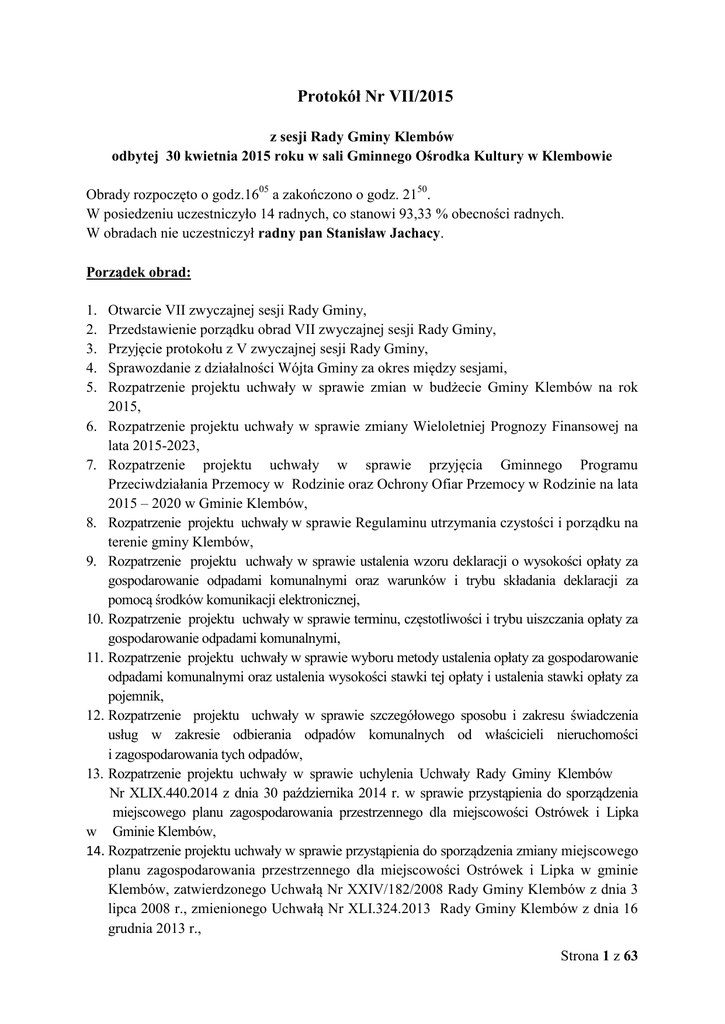 Protokół Nr VII/2015 z sesji Rady Gminy Klembów odbytej 30 kwietnia 2015 roku w sali Gminnego Ośrodka Kultury w Klembowie Obrady rozpoczęto o godz.1605 a zakończono o godz. 2150. W posiedzeniu uczestniczyło 14 radnych, co stanowi 93,33 % obecności radnych. W obradach nie uczestniczył radny pan Stanisław Jachacy. Porządek obrad: 1. 2. 3. 4. 5. Otwarcie VII zwyczajnej sesji Rady Gminy, Przedstawienie porządku obrad VII zwyczajnej sesji Rady Gminy, Przyjęcie protokołu z V zwyczajnej sesji Rady Gminy, Sprawozdanie z działalności Wójta Gminy za okres między sesjami, Rozpatrzenie projektu uchwały w sprawie zmian w budżecie Gminy Klembów na rok 2015, 6. Rozpatrzenie projektu uchwały w sprawie zmiany Wieloletniej Prognozy Finansowej na lata 2015-2023, 7. Rozpatrzenie projektu uchwały w sprawie przyjęcia Gminnego Programu Przeciwdziałania Przemocy w Rodzinie oraz Ochrony Ofiar Przemocy w Rodzinie na lata 2015 – 2020 w Gminie Klembów, 8. Rozpatrzenie projektu uchwały w sprawie Regulaminu utrzymania czystości i porządku na terenie gminy Klembów, 9. Rozpatrzenie projektu uchwały w sprawie ustalenia wzoru deklaracji o wysokości opłaty za gospodarowanie odpadami komunalnymi oraz warunków i trybu składania deklaracji za pomocą środków komunikacji elektronicznej, 10. Rozpatrzenie projektu uchwały w sprawie terminu, częstotliwości i trybu uiszczania opłaty za gospodarowanie odpadami komunalnymi, 11. Rozpatrzenie projektu uchwały w sprawie wyboru metody ustalenia opłaty za gospodarowanie odpadami komunalnymi oraz ustalenia wysokości stawki tej opłaty i ustalenia stawki opłaty za pojemnik, 12. Rozpatrzenie projektu uchwały w sprawie szczegółowego sposobu i zakresu świadczenia usług w zakresie odbierania odpadów komunalnych od właścicieli nieruchomości i zagospodarowania tych odpadów, 13. Rozpatrzenie projektu uchwały w sprawie uchylenia Uchwały Rady Gminy Klembów Nr XLIX.440.2014 z dnia 30 października 2014 r. w sprawie przystąpienia do sporządzenia miejscowego planu zagospodarowania przestrzennego dla miejscowości Ostrówek i Lipka w Gminie Klembów, 14. Rozpatrzenie projektu uchwały w sprawie przystąpienia do sporządzenia zmiany miejscowego planu zagospodarowania przestrzennego dla miejscowości Ostrówek i Lipka w gminie Klembów, zatwierdzonego Uchwałą Nr XXIV/182/2008 Rady Gminy Klembów z dnia 3 lipca 2008 r., zmienionego Uchwałą Nr XLI.324.2013 Rady Gminy Klembów z dnia 16 grudnia 2013 r., Strona 1 z 63 15. Rozpatrzenie projektu uchwały w sprawie nadania nazwy drodze wewnętrznej położonej w miejscowości Wola Rasztowska, gmina Klembów, 16. Ustosunkowanie się Rady Gminy do pisma Wojewody Mazowieckiego z dnia 27 marca 2015 r., 17. Informacja z działalności Gminnego Ośrodka Pomocy Społecznej za rok 2014, 18. Interpelacje radnych i odpowiedzi na interpelacje, 19. Sprawy różne i wolne wnioski, 20. Zamknięcie obrad VII zwyczajnej sesji Rady Gminy. Ad. 1. Otwarcia VII zwyczajnej sesji Rady Gminy dokonał Przewodniczący Rady Gminy pan Tadeusz Wojda. Przewodniczący Rady Gminy pan Tadeusz Wojda powitał wszystkich zebranych na sesji. Przewodniczący Rady Gminy pan Tadeusz Wojda stwierdził, że na sesji obecnych jest 14 radnych, jest quorum a zatem podejmowane uchwały będą miały moc wiążącą. Ad. 2. Przewodniczący Rady Gminy pan Tadeusz Wojda przedstawił porządek obrad VII zwyczajnej sesji. Przewodniczący Rady Gminy pan Tadeusz Wojda zapytał czy radni mają pytania bądź uwagi do odczytanego porządku obrad. Radna pani Jadwiga Szewczyk: „Ja chciałabym wnieść o zmianę porządku obrad, poprzez dodanie do porządku dodatkowego punktu. Myślę, że byłoby dobrym miejscem po punkcie szóstym, czyli po rozpatrzeniu projektu uchwały w sprawie zmiany Wieloletniej Prognozy Finansowej na lata 2015-2023. Zależy mi na tym i wnioskuję o to, aby dodać punkt, na który czekaliśmy właśnie, widzę, że jest on tu nieujęty, a pan Przewodniczący o nim wiedział, bo prowadziliśmy w tym zakresie korespondencję. Chodzi o inwestycje, których projekty wykonano, a które do chwili obecnej nie weszły do wykonania. Dostaliśmy od pana Wójta informacje już w tym zakresie, natomiast ten problem miał być przedyskutowany na sesji i właśnie wnoszę o ujęcie takiego punktu. Ja go mogę nawet przedyktować, bo o takie pisaliśmy do prezydium: Analiza informacji odnośnie projektów inwestycyjnych, ujętych w budżetach Gminy Klembów w latach 2004 – 2014 oraz zleconych do wykonania przez Wójta Gminy Klembów za lata 2004 – 2014 a niewdrożonych do wykonania do chwili obecnej.” Przewodniczący Rady Gminy pan Tadeusz Wojda zapytał Wójta, czy ten punkt jest w stanie dzisiaj omówić. Wójt Rafał Mathiak odpowiedział, że ten punkt był omówiony na Komisji Rewizyjnej, więc może omówić. Zaproponował omówienie tego zagadnienia w sprawach różnych. Radna pani Jadwiga Szewczyk: „Znaczy tak, na Komisji Rewizyjnej był tylko, było wspomniane, że mamy tylko do ujęcia ten punkt, natomiast myśmy go nie analizowali, nie omawiali, tutaj jest problem taki, że w zasadzie ja oczekuję, że też decyzję odpowiednią Strona 2 z 63 podejmie Rada Gminy, nie tylko pan Wójt omówi, bo to Rada Gminy pilnuje całokształtu działalności i wydawanych pieniędzy przez Gminę Klembów.” Radna pani Dorota Marcinkowska: „A ja składam wniosek przeciwny, dlatego, że ja na dzisiaj nie jestem przygotowana, nie mam tych materiałów a też chciałabym brać udział w tej dyskusji, i wnoszę o to, żeby i owszem, taki punkt znalazł się, ale na następnej sesji, żebyśmy wszyscy to wiedzieli. Ja chciałabym też pracować na określonych materiałach. Ja nie byłam na posiedzeniu Komisji Rewizyjnej, nie muszę też pamiętać, co było na poprzedniej sesji. Dlatego też wnoszę, żeby ująć to w punkcie i owszem, ale na następną sesję, żeby to był odrębny punkt porządku obrad.” Radna pani Jadwiga Szewczyk: