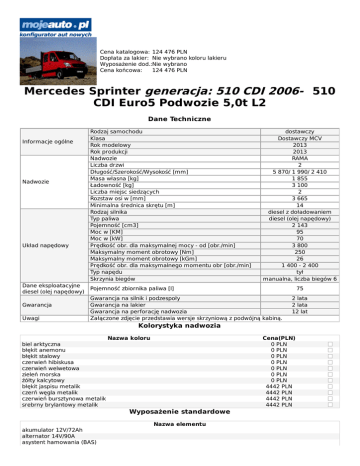 Cena katalogowa: 124 476 PLN Dopłata za lakier: Nie wybrano koloru lakieru Wyposażenie dod.:Nie wybrano Cena końcowa: 124 476 PLN Mercedes Sprinter generacja: 510 CDI 2006- 510 CDI Euro5 Podwozie 5,0t L2 Dane Techniczne Informacje ogólne Nadwozie Układ napędowy Dane eksploatacyjne diesel (olej napędowy) Gwarancja Uwagi Rodzaj samochodu Klasa Rok modelowy Rok produkcji Nadwozie Liczba drzwi Długość/Szerokość/Wysokość [mm] Masa własna [kg] Ładowność [kg] Liczba miejsc siedzących Rozstaw osi w [mm] Minimalna średnica skrętu [m] Rodzaj silnika Typ paliwa Pojemność [cm3] Moc w [KM] Moc w [kW] Prędkość obr. dla maksymalnej mocy - od [obr./min] Maksymalny moment obrotowy [Nm] Maksymalny moment obrotowy [kGm] Prędkość obr. dla maksymalnego momentu obr [obr./min] Typ napędu Skrzynia biegów dostawczy Dostawczy MCV 2013 2013 RAMA 2 5 870/ 1 990/ 2 410 1 855 3 100 2 3 665 14 diesel z doładowaniem diesel (olej napędowy) 2 143 95 70 3 800 250 26 1 400 - 2 400 tył manualna, liczba biegów 6 Pojemność zbiornika paliwa [l] 75 Gwarancja na silnik i podzespoły Gwarancja na lakier Gwarancja na perforację nadwozia Załączone zdjęcie przedstawia wersje skrzyniową z podwójną kabiną. 2 lata 2 lata 12 lat Kolorystyka nadwozia Nazwa koloru Cena(PLN) 0 PLN 0 PLN 0 PLN 0 PLN 0 PLN 0 PLN 0 PLN 4442 PLN 4442 PLN 4442 PLN 4442 PLN biel arktyczna błękit anemonu błękit stalowy czerwień hibiskusa czerwień welwetowa zieleń morska źółty kalcytowy błękit jaspisu metalik czerń węgla metalik czerwień bursztynowa metalik srebrny brylantowy metalik Wyposażenie standardowe Nazwa elementu akumulator 12V/72Ah alternator 14V/90A asystent hamowania (BAS) belka przeciwnajazdowa tylna boczne listwy ochronne centralny zamek sterowany falami radiowymi dwudrożne głośniki z przodu filtr cząstek stałych filtr paliwa z separatorem wody hamulce tarczowe na przedniej i tylnej osi immobiliser instalacja elektryczna 12V kierunkowskazy boczne w obudowach lusterek zewnętrznych klin pod koła koło zapasowe kontrolka informująca o awarii oświetlenia pojazdu kontrolka informująca o braku płynu w spryskiwaczu lusterka zewnętrzne regulowane mechanicznie z dodatkowymi lusterkami szerokokątnymi mocowanie koła zapasowego na końcu ramy napinacze pasów bezpieczeństwa dla przednich foteli narzędzia ogumienie 195/75 R16 C ogumienie letnie osłony przeciwsłoneczne kierowcy i pasażera poduszka powietrzna kierowcy półka nad przednią szybą przygotowanie do montażu modułu PSM przygotowanie do montażu radia przygotowanie do montażu świateł pozycyjnych bocznych reflektory z przezroczystymi szkłami regulacja zasięgu reflektorów resor piórowy poprzeczny z przodu resory tylne paraboliczne schowki na desce rozdzielczej siedzenie kierowcy w pełni regulowane stabilizator osi przedniej i tylnej system stabilizacji toru jazdy ADAPTIVE ESP szyby przednie sterowane elektrycznie tapicerka materiałowa czarna "Brasao" trzypunktowe pasy bezpieczeństwa (dla wszystkich miejsc) układ hamulcowy hydrauliczny dwuobwodowy układ hamulcowy wyposażony w układy ABS i EBV wspomaganie układu kierowniczego wyłącznik główny napięcia zagłówek regulowany dla siedzenia kierowcy i pasażera zderzak przedni ze zintegrowanym stopniem złącze rozruchowe (dodatkowy biegun dodatni) Wyposażenie dodatkowe Lista wyposażenia dodatkowego [A50] oś przednia wzmocniona [BE2] składana dźwignia hamulca ręcznego [C17] resory tylne obniżające wysokość krawędzi ramy [C21] resory tylne dwustopniowe [C33] wzmocnione resory tylne [C42] stabilizator tylnej osi pod ramą [C43] wzmocniony stabilizator tylej osi pod ramą [C45] wzmocniony stabilizator przedniej osi [C47] amortyzatory wzmocnione [C57] boczne belki przeciw najazdowe [C71] belka przeciw najazdowa tylna [C72] zderzaki do lakierowania [C94] rezygnacja z zderzaka przedniego [CF2] Pakiet A [CF3] Pakiet B [CF4] Pakiet C [CF5] Pakiet D [CL1] regulowana kolumna kierownicy w dwóch płaszczyznach [CL4] kierownica wielofunkcyjna z komputerem pokładowym [CM9] boczne listwy ochronne białe [CT1] tłumiki drgań [E07] asystent ruszania [E28] akumulator dodatkowy [E36] przekaźnik oddzielający przy dodatkowym akumulatorze Cena 920 PLN 180 PLN 677 PLN 493 PLN 493 PLN 606 PLN 737 PLN 451 PLN 363 PLN 1068 PLN 571 PLN 758 PLN -102 PLN 1057 PLN 1991 PLN 1857 PLN 2477 PLN 405 PLN 1307 PLN 499 PLN 293 PLN 325 PLN 849 PLN 363 PLN [E43] gniazdo wtykowe przyczepy, 13 stykowe [E46] gniazdo elektryczne 12V [E57] przygotowanie do montażu gniazda do haka holowniczego [ED3] antena sieci GSM, GPS, UMTS [ED4] akumulator AGM 12V 95Ah [ED5] parametrowany moduł specjalny [EE8] akumulator 12V/100Ah [EH4] zestaw głośnomówiący komfortowy [ET5] zestaw głośnomówiący standardowy [EV3] przygotowanie do montażu platformy załadunkowej [EV9] przygotowanie do podłączenia urządzeń przenośnych [F35] okno w tylnej ścianie kabiny [F46] spryskiwacze reflektorów [F49] ogrzewana szyba przednia [F61] lusterko wsteczne wewnętrzne [F66] schowek zamykany [FF8] wneka 1-DIN z przodu w podsufitce [FJ1] pokrywa schowka na środku deski rozdzielczej [FK1] osłona chłodnicy lakierowana na kolor (MB 9678) [FK3] atrapa chłodnicy chromowana [FR7] przygotowanie elektryczne do pomocy cofania [FR9] przygotowanie do montażu kamery cofania wraz z montażem [FY1] alarm antywłamaniowy EDW II, syrena z akumulatora [FY7] kluczyk z trzema przyciskami [FZ4] alarm antywłamaniowy EDW II [FZ5] alarm antywłamaniowy [FZ8] komfortowe otwieranie i zamykanie pilotem [FZ9] dwa dodatkowe klucze do pojazdu [G40] automatyczna skrzynia biegów [GK4] przygotowanie do montażu chłodnicy oleju skrzyni biegów [H04] izolacja cieplna przestrzeni kierowcy [H12] dodatkowe ogrzewanie wodne [H15] ogrzewanie siedzenia pasażera [H16] ogrzewanie siedzenia kierowcy [H20] szyby pojazdu przyciemniane [H21] szyby przyciemniane, szyba czołowa z filtrem [H81] filtr przeciwpyłkowy [HH2] dogrzewacz elektryczny PTC