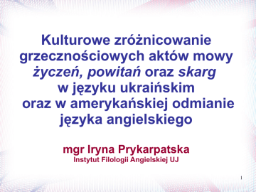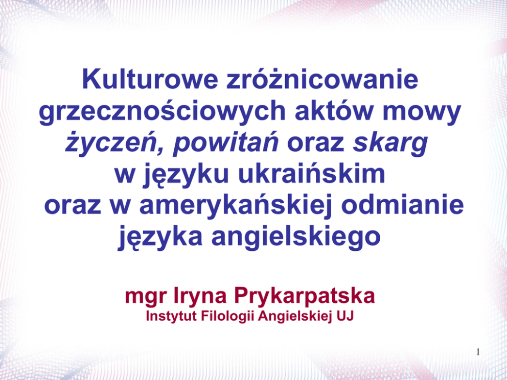Kulturowe zróżnicowanie grzecznościowych aktów mowy życzeń, powitań oraz skarg w języku ukraińskim oraz w amerykańskiej odmianie języka angielskiego mgr Iryna Prykarpatska Instytut Filologii Angielskiej UJ 1 Cel badania 1. Wykazanie różnic kulturowych w werbalnej realizacji grzecznościowych aktów mowy: życzeń, powitań oraz skarg w komunikacji bezpośredniej Amerykanów i Ukraińców. 2. Wytłumaczenie zidentyfikowanych różnic przez odwołanie sie do wartości kultury amerykańskiej i ukraińskiej ujętych w modelach kultury Halla i Hofstede. 2 Przesłanki do sformułowania hipotez badawczych Wynikają one z podstawowych założeń pragmatyki międzykulturowej, w obszarze której mieści się niniejsze badanie, a które zostały sformułowanych przez Annę Wierzbicką (2003): W różnych społeczeństwach oraz społecznościach ludzie mówią inaczej; różnice w sposobach mówienia są głębokie i systematyczne. Odzwierciedlają one różne wartości kulturowe oraz wynikające z nich odmienne hierarchie wartości; różne sposoby mówienia, różne style komunikacyjne, które można wytłumaczyć i zrozumieć przez odwołanie się do niezależnie ustalonych wartości oraz priorytetów kulturowych. (Wierzbicka, 2003:69) 3 Założenia badawcze Kultura jest kategorią nadrzędną, która determinuje wszystkie działania człowieka, w tym także komunikację werbalną (Hall). Grzeczność jest uniwersalną nadrzędną kategorią interakcji interpersonalnej również zróżnicowaną kulturowo. Hipotezy badawcze Różnice w systemie wartości kultury amerykańskiej i ukraińskiej skutkują odmiennymi zachowaniami komunikacyjnymi Amerykanów i Ukraińców. Kulturowo motywowane różnice w komunikacji werbalnej Amerykanów i Ukraińców będą najbardziej widoczne w zrytualizowanych grzecznościowych aktach mowy, które najpełniej realizują normy społeczne. Przedmiot badania Badaniem objęto trzy różne grzecznościowe akty mowy (akty illokucyjne): • Życzenie, w którym nadawca przekazuje odbiorcy swoje przyjazne uczucia i wyraża empatię (spełnia ono funkcję interpersonalną, ekspresywną, poetycką). Realizuje ono grzeczność pozytywną. • Powitanie, które umożliwia nawiązywanie oraz podtrzymywanie kontaktu (spełnia ono funkcję fatyczną, personalną, interpersonalną). Realizuje ono grzeczność pozytywną. • Skarga, w której nadawca przekazuje odbiorcy swoją negatywną opinię o popełnionej przez niego społecznie niedopuszczalnej czynności (SNC) i zmusza go do naprawy zaistniałej sytuacji. Zagrażając twarzy interlokutorów (FTA), realizuje ona grzeczność negatywną. Spełnia funkcję interpersonalną. 6 Metody zbierania danych empirycznych • obserwacja naturalna (etap wstępny) • obserwacja uczestnicząca • Skonstruowany przez autorkę badania kwestionariusz • Próbka reprezentatywna - respondeńci – native speakers i rodzimi użytkownicy swoich kultur - są zróżnicowani ze względu na wiek, miejśce zamieszkania, wykonywany zawód • Całkowita ilość respondentów – 188; 90 Amerykanów oraz 98 Ukraińców, • w tym 96 kobiet i 98 mężczyzn 7 Baza danych empirycznych 2350 formuły językowe 1146 formuły językowe realizujące życzenia 376 formuły językowe realizujące powitania 828 formuły językowe realizujące skargi 8 Metoda analizy danych empirycznych • Formuła jest strukturą leksykalno-syntaktyczną o pewnym znaczeniu semantycznym • Operatory wewnętrzne są to środki leksykalne o funkcji modyfikującej • Posunięcie (ang. move), które jest realizowane za pomocą formuł językowych, stanowi strukturalną jednostkę dyskursu o określonej funkcji • Posunięcie podstawowe stanowi rdzeń aktu mowy • Posunięcia dodatkowe towarzyszą posunięciom podstawowym i modyfikują ich moc illokucyjną. Ze względu na ich zewnętrzną pozycję wobec posunięć podstawowych nazywamy je operatorami zewnętrznymi • Wzorzec powstaje w konsekwencji łączenia się ze sobą różnych typów posunięć, które są realizowane przez odmienne formuły językowe 9 Metoda analizy danych empirycznych • Analiza ilościowa • Analiza jaĸościowa Definicja Kultury wg Geerta Hofstede Kultura jest kolektywnym zaprogramowaniem umysłu, które warunkuje zachowania członków danej grupy kulturowej i odróżnia ich od członków innej grupy (Hofstede et. al..2007:160) 11 Wymiary kultury wg modeli G. Hofstede i E. Halla • Dystans wobec władzy (PD) - może być niski lub wysoki; wyznacza się w jaki sposób mniej władni członkowie społeczeństwa odbierają fakt nierównomiernie rozdzielonej władzy; • Kolektywizm vs indywidualizm (IDV) - mierzy stopień spokrewnienia jednostki z grupą; W kulturach indywidualistycznych ludzie dbają o siebie samych i o swoją najbliższą rodzinę; w kulturach kolektywistycznych jako członkowie grupy wewnętrznej lub kolektywu dbają o nich w zamian za lojalność); • Męskość vs żeńskość (MAS) – w kulturach męskich dominującymi wartościami są sukces, pieniądze i rzeczy, natomiast w żeńskich –troska o innych i jakość życia; • Unikanie niepewności (UA) - mierzy stopień zagrożenia przez dwuznaczność i niepewność nowych sytuacji; • Kontekst (wysoki vs niski) – odnosi się do relacji pomiędzy ilością informacji bezpośrednio zawartą w wypowiedzi i w kontekście komunikacyjnym, która jest potrzebna dla prawidłowego odczytania przekazu); • Monochroniczność vs polichroniczność - dotyczy rozumienia czasu. W kulturach monochronicznych czas jest towarem, obowiązują zasady przestrzegania ścisłego harmonogramu i wykonywania jednej czynności w określonym czasie. W kulturach polichronicznych czas jest raczej konceptem filozoficznym, zasady dokładnego 12 planowania oraz przestrzegania ścisłego harmonogramu nie obowiązują; ludzie mogą wykonywać kilka czynności naraz. Model kultury Ukraińskiej vs Amerykańskiej Wymiary Ukraina USA Indywidual