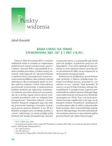 PPunkty widzenia Jakub Kawałek Kilka uwag na temat stosowania art. 187 § 1 pkt 3 k.p.c. Ustawa z dnia 10 września 2015 r. o zmianie niektórych ustaw w związku ze wspieraniem polubownych metod rozwiązywania sporów1 z dniem 1 stycznia 2016 r. wprowadziła do systemu polskiej procedury cywilnej szereg rozwiązań zmierzających do upowszechnienia w społeczeństwie pozasądowych metod rozwiązywania konfliktów, jako szybszej i tańszej alternatywy dla rozstrzygania spraw na drodze sądowej. Jednym z celów ustawodawcy pozostawało wytworzenie w społeczeństwie polskim możliwie jak najwyższej świadomości istnienia procedur służących porozumieniu się w drodze ugody jeszcze przed wytoczeniem powództwa oraz we wstępnej fazie postępowania2. Natomiast jednym z instrumentów służących osiągnięciu tego celu stało się poszerzenie katalogu wymogów formalnych pozwu poprzez dodanie3 w art. 187 § 1 Kodeksu postępowania cywilnego punktu 3, o treści: „informację, czy strony podjęły próbę mediacji lub innego pozasądowego sposobu rozwiązania sporu, a w przypadku gdy takich prób nie podjęto, wyjaśnienie przyczyn ich niepodjęcia”. Czas, który upłynął od wprowadzenia w życie opisanej zmiany, pozwala już na przedstawienie kilku uwag związanych ze stosowaniem nowego przepisu. Podstawowym problemem, przed którym staje praktyka w obliczu dodatkowego wymogu formalnego pozwu, pozostaje to, czy stanowi on tzw. „istotny” brak formalny. To znaczy czy jest to brak formalny, którego nieuzupełnienie w postępowaniu naprawczym4 uniemożliwia nadanie sprawie dalszego biegu i prowadzić musi do zwrotu pozwu. Konstrukcja przepisu art. 130 § 1 k.p.c. nie może pozostawiać bowiem wątpliwości co do tego, że do kategorii braków formalnych skutkujących zwrotem pisma zaliczać należy wyłącznie takie braki formalne, które uniemożliwiają nadanie sprawie dalszego biegu. Kwestia ta jest jednolicie rozumiana zarówno w orzecznictwie sądów powszechnych, jak i Sądu Najwyższego5. Dz.U. z 2015 r. poz. 1595. Uzasadnienie projektu ustawy, Sejm RP VII kadencji, nr druku 3432, http://www.sejm.gov.pl/sejm7.nsf/druk. xsp?nr=3432 (dostęp: 24 lutego 2016 r.). 3 Art. 1 pkt 13 ustawy. 4 Art. 130–1303 k.p.c. 5 Uchwała SN z 17 lipca 2014 r., III CZP 43/14, OSNC 2015, nr 5, poz. 57. 1 2 90 6/2016 Możliwość wpływu zaistnienia przedprocesowych prób polubownego zakończenia sporu oraz ewentualnych przyczyn braku takich działań na możliwość rozpoznania sprawy już na pierwszy rzut oka budzi poważną wątpliwość. W świetle art. 15–46 k.p.c. brak jest takiego wpływu na właściwość sądu. W świetle art. 47 k.p.c. na skład sądu. Przepisy ustawy z dnia 28 lipca 2005 r. o kosztach sądowych w sprawach cywilnych6 również nie wprowadzają różnicy w wysokości kosztów sądowych w zakresie opłaty od pozwu dla osób, które skorzystały z próby pozasądowego rozwiązania sporu. Jednocześnie oczywisty być musi brak takiego wpływu na merytoryczne rozstrzygnięcie. Próba uprzedniego polubownego rozwiązania konfliktu na tle praw majątkowych nie ma bowiem i nie może mieć jakiegokolwiek wpływu na rozstrzygnięcie o zasadności wniesionego powództwa. Wszystko to prowadzi do wstępnego wniosku, że norma wprowadzona wskazanym przepisem jest pozbawiona efektywnej normy sankcjonującej7 i ma przede wszystkim charakter wprowadzającej w sposób niewiążący pewną dobrą praktykę – czyli stanowi to, co w teorii prawa zwykło określać się mianem lex imperfecta, a w odniesieniu do norm prawa międzynarodowego jako soft law8. Uzasadnienie projektu ustawy zresztą wprost wskazuje ten właśnie aspekt, podkreślając, że rozległe instrumentarium służące upowszechnieniu pozasądowych form rozwiązywania sporów wprowadzane zostaje równolegle z wdrożeniem do polskiego porządku prawnego dyrektywy Parlamentu Europejskiego i Rady 2013/11/UE z dnia 21 maja 2013 r. w sprawie Kilka uwag na temat stosowania... alternatywnych metod rozstrzygania sporów konsumenckich oraz zmiany rozporządzenia (WE) nr 2006/2004 i dyrektywy 2009/22/WE (dyrektywa w sprawie ADR w sporach konsumenckich9). Analizując uzasadnienie projektu ustawy, jedyne nawiązanie do ewentualnego skutku praktycznego nowelizacji odnajdziemy w kontekście art. 103 § 2 k.p.c., który również został zmieniony z dniem 1 stycznia 2016 r. Obecnie wśród przyczyn umożliwiających obciążenie strony kosztami procesu niezależnie od wyniku sprawy10 przewidziano bowiem – jako wprost wskazany przykład niesumiennego i oczywiście niewłaściwego postępowania – oczywiście nieuzasadnioną odmowę poddania się mediacji11. W uzasadnieniu projektu ustawy szeroko omówiono ten aspekt wyjątku od zasady odpowiedzialności za wynik procesu. Podkreślono – z powołaniem się na pkt 13 preambuły dyrektywy Parlamentu Europejskiego i Rady 2008/52/WE z 21 maja 2008 r. w sprawie niektórych aspektów mediacji w sprawach cywilnych i handlowych12 – że ogólna zasada dobrowolności mediacji nie wyklucza zastosowania rozwiązań częściowo ograniczających tę dobrowolność, co pozwala na przyjęcie, że nieuzasadniona odmowa podjęcia mediacji może się spotkać z pewnymi negatywnymi konsekwencjami. Wprowadzoną możliwość wskazano jako przykład takiego rozwiązania. Jednocześnie potwierdzono jednak, wynikające z treści art. 1838 § 3 k.p.c.13, prawo strony do odmowy mediacji bez podawania przyczyn oraz zasadę dyskrecjonalnej władzy sądu w zakresie orzekania o kosztach procesu. Tekst jedn. Dz.U. z 2014 r. poz. 1025 z późn. zm. Z. Ziembiński, Teoria prawa, Warszawa–Poznań 1973, s. 29. 8 R. Kwiecień, Miejsce umów międzynarodowych w porządku prawnym państwa polskiego, Wydawnictwo Sejmowe, Warszawa 2000, s. 41. 9 Dz. Urz. UE L 165 z 18 czerwca 2013 r., s. 63. 10 Art. 103 § 1 k.p.c. 11 Uprzednio: „(...) nieusprawiedliwionej odmowy poddania się mediacji, na którą strona uprzednio w