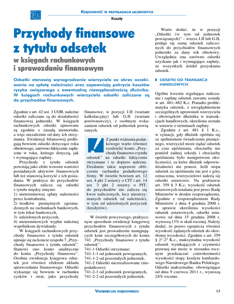 Księgowość w przykładach liczbowych Koszty Przychody finansowe z tytułu odsetek w księgach rachunkowych i sprawozdaniu finansowym Odsetki stanowią wynagrodzenie wierzyciela za okres oczeki wania na spłatę należności oraz zapewniają pokrycie kosztów ryzyka związanego z ewentualną niewypłacalnością dłużnika. W księgach rachunkowych wierzyciela odsetki zaliczane są do przychodów finansowych. Zgodnie z art. 42 ust. 3 UOR, należne odsetki zaliczane są do działalności finansowej jednostki. W księgach rachunkowych odsetki ujmowane są zgodnie z zasadą memoriału, a więc niezależnie od daty ich otrzy mania. Ewidencji bilansowej podle gają bowiem odsetki dotyczące roku obrotowego, zarówno faktycznie zapła cone w roku, którego dotyczą, jak i wymagające zapłaty. Przychody z tytułu odsetek powstają jako efekt wzrostu wartości posiadanych aktywów finansowych lub też stanowią korzyść z ich posia dania. W praktyce do przychodów finansowych zalicza się odsetki z tytułu między innymi: 1) nieterminowej spłaty należności przez kontrahenta, 2) środków pieniężnych zgroma dzonych na rachunkach bankowych, w tym lokat bankowych, 3) udzielonych pożyczek, 4) nieterminowych wypłat należnej wspólnikom dywidendy. W księgach rachunkowych przy chody finansowe z tytułu odsetek ujmuje się na koncie zespołu 7 „Przy chody finansowe z tytułu odsetek”. Stanowi ono konto analityczne do konta „Przychody finansowe”. Osobna ewidencja księgowa odse tek jest również efektem układu sprawozdania finansowego. Odsetki wykazuje się bowiem w rachunku zysków i strat, jako przychody finansowe, w pozycji J.II (wariant kalkulacyjny) lub G.II (wariant porównawczy), z osobnym wska zaniem odsetek od jednostek powią zanych. Z punkt widzenia podat kowego warto również rozdzielić konto „Przy chody finansowe z tytułu odsetek” na odsetki faktycznie otrzymane i te dopiero należne. Działanie takie usprawni obli czenie rachunku podatkowego firmy. W świetle bowiem art. 12 ust. 4 pkt 2 ustawy o CIT i art. 14 ust. 3 pkt 2 ustawy o PIT, do przychodów nie zalicza się kwot naliczonych, lecz nieotrzy manych odsetek od należności, w tym od udzielonych pożyczek (kredytów). W świetle powyższego, praktycz nym sposobem ewidencji księgowej przychodów finansowych z tytułu odsetek jest prowadzenie następują cych kont szczegółowych do konta 741 „Przychody finansowe z tytułu odsetek”: 741-1 Odsetki otrzymane: 741-1-1 od jednostek powiązanych, 741-1-2 od pozostałych jednostek, 741-2 Odsetki niezrealizowane (nie podatkowe): 741-2-1 od jednostek powiązanych, 741-2-2 od pozostałych jednostek. Vademecum księgowego Warto dodać, że w pozycji „Odsetki (w tym od jednostek powiązanych)” – wiersz J.II lub G.II, podaje się sumę odsetek zaliczo nych do przychodów finansowych jednostki za dany rok obrotowy. Uwzględnia ona zarówno odsetki uzyskane jak i wymagające zapłaty, ze wszystkich źródeł pozyskania odsetek. z ODSETKI OD TRANSAKCJI HANDLOWYCH Ogólne kwestie regulujące nalicza nie i zapłatę odsetek zawarte zostały w art. 481–482 K.c. Ponadto proble matyka odsetek, z uwzględnieniem szczególnych uprawnień wierzyciela i obowiązków dłużnika w transak cjach handlowych, określona została w ustawie o terminach zapłaty. Zgodnie z art. 481 § 1 K.c., w sytuacji, gdy dłużnik opóźnia się ze spełnieniem świadczenia pienięż nego, wierzyciel może żądać odsetek za czas opóźnienia, chociażby nie poniósł żadnej szkody i chociażby opóźnienie było następstwem oko liczności, za które dłużnik odpowie dzialności nie ponosi. Jeśli stopa odsetek za opóźnienie nie jest z góry oznaczona, wierzycielowi należą się odsetki ustawowe. Na podstawie art. 359 § 3 K.c, wysokość odsetek ustawowych ustalana jest przez Radę Ministrów w drodze rozporządzenia. Zgodnie z rozporządzeniem Rady Ministrów z dnia 4 grudnia 2008 r. w sprawie określenia wysokości odsetek ustawowych, odsetki usta wowe od dnia 15 grudnia 2008 r. wynoszą 13% w skali rocznej. Należy dodać, że prawo ogranicza również wysokość żądanych odsetek do okre ślonej wysokości. Zgodnie z art. 359 § 21-23 K.c., maksymalna wysokość odsetek wynikających z czynności prawnej nie może w stosunku rocz nym przekraczać czterokrotności wysokości stopy kredytu lombardo wego Narodowego Banku Polskiego. Odsetki maksymalne, obowiązujące od dnia 9 czerwca 2011 r., wynoszą 24% rocznie. 17 Księgowość w przykładach liczbowych Koszty Naliczanie odsetek w świetle ustawy o ter minach zapłaty jest pra wem a nie obowiąz kiem wierzyciela. Odstąpienie od naliczania odsetek nie wiąże się więc z żadnymi konsekwencjami prawnymi, gdyż wierzyciel rezy gnuje po prostu z możliwości dochodzenia odsetek za zwłokę w spełnieniu swojego świadczenia. Odsetki naliczane są od dnia nastę pującego po umówionym terminie płatności, aż do dnia zapłaty. Zgod nie z art. 5–7 ustawy o terminach zapłaty: 1) gdy strony w umowie przewi działy termin zapłaty dłuższy niż 30 dni, wierzyciel może żądać odsetek ustawowych za okres począwszy od 31 dnia po spełnieniu swojego świad czenia niepieniężnego i doręczeniu dłużnikowi faktury lub rachunku – do dnia zapłaty, ale nie dłuższy niż do dnia wymagalności świadczenia pieniężnego, 2) jeżeli termin zapłaty nie został określony w umowie, wierzycielowi, bez wezwania, przysługują odsetki ustawowe za okres począwszy od 31 dnia po spełnieniu świadczenia niepieniężnego – do dnia zapłaty, ale nie dłuższy niż do dnia wymagal ności świadczenia pieniężnego; przy czym za dzień wymagalności świad czenia pieniężnego uważa się dzień określony w pisemnym wezwaniu dłużnika do zapłaty, w szczególności w doręczonej dłużnikowi fakturze lub rachunku, 3) gdy dłużnik, w terminie określo nym w umowie albo pisemnym wezwaniu dłużnika do zapłaty, nie dokona zapłaty na r
