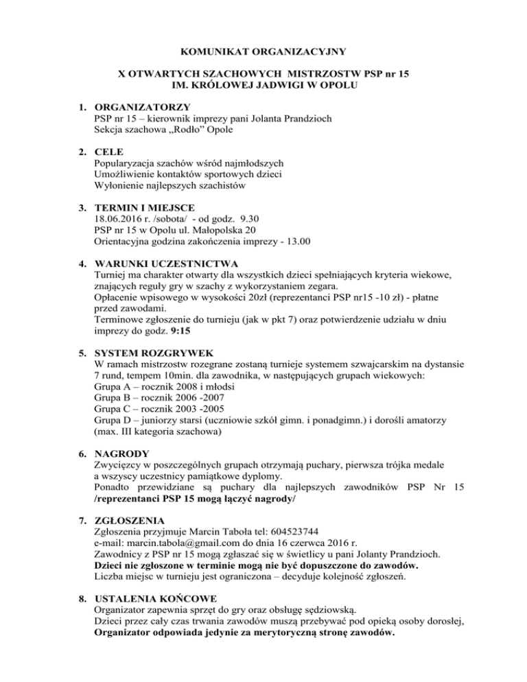 KOMUNIKAT ORGANIZACYJNY X OTWARTYCH SZACHOWYCH MISTRZOSTW PSP nr 15 IM. KRÓLOWEJ JADWIGI W OPOLU 1. ORGANIZATORZY PSP nr 15 – kierownik imprezy pani Jolanta Prandzioch Sekcja szachowa „Rodło” Opole 2. CELE Popularyzacja szachów wśród najmłodszych Umożliwienie kontaktów sportowych dzieci Wyłonienie najlepszych szachistów 3. TERMIN I MIEJSCE 18.06.2016 r. /sobota/ - od godz. 9.30 PSP nr 15 w Opolu ul. Małopolska 20 Orientacyjna godzina zakończenia imprezy - 13.00 4. WARUNKI UCZESTNICTWA Turniej ma charakter otwarty dla wszystkich dzieci spełniających kryteria wiekowe, znających reguły gry w szachy z wykorzystaniem zegara. Opłacenie wpisowego w wysokości 20zł (reprezentanci PSP nr15 -10 zł) - płatne przed zawodami. Terminowe zgłoszenie do turnieju (jak w pkt 7) oraz potwierdzenie udziału w dniu imprezy do godz. 9:15 5. SYSTEM ROZGRYWEK W ramach mistrzostw rozegrane zostaną turnieje systemem szwajcarskim na dystansie 7 rund, tempem 10min. dla zawodnika, w następujących grupach wiekowych: Grupa A – rocznik 2008 i młodsi Grupa B – rocznik 2006 -2007 Grupa C – rocznik 2003 -2005 Grupa D – juniorzy starsi (uczniowie szkół gimn. i ponadgimn.) i dorośli amatorzy (max. III kategoria szachowa) 6. NAGRODY Zwycięzcy w poszczególnych grupach otrzymają puchary, pierwsza trójka medale a wszyscy uczestnicy pamiątkowe dyplomy. Ponadto przewidziane są puchary dla najlepszych zawodników PSP Nr 15 /reprezentanci PSP 15 mogą łączyć nagrody/ 7. ZGŁOSZENIA Zgłoszenia przyjmuje Marcin Taboła tel: 604523744 e-mail: [email protected] do dnia 16 czerwca 2016 r. Zawodnicy z PSP nr 15 mogą zgłaszać się w świetlicy u pani Jolanty Prandzioch. Dzieci nie zgłoszone w terminie mogą nie być dopuszczone do zawodów. Liczba miejsc w turnieju jest ograniczona – decyduje kolejność zgłoszeń. 8. USTALENIA KOŃCOWE Organizator zapewnia sprzęt do gry oraz obsługę sędziowską. Dzieci przez cały czas trwania zawodów muszą przebywać pod opieką osoby dorosłej, Organizator odpowiada jedynie za merytoryczną stronę zawodów.