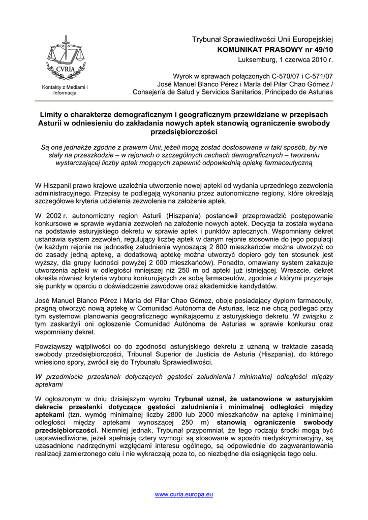 Trybunał Sprawiedliwości Unii Europejskiej KOMUNIKAT PRASOWY nr 49/10 Luksemburg, 1 czerwca 2010 r. Kontakty z Mediami i Informacja Wyrok w sprawach połączonych C-570/07 i C-571/07 José Manuel Blanco Pérez i María del Pilar Chao Gómez / Consejería de Salud y Servicios Sanitarios, Principado de Asturias Limity o charakterze demograficznym i geograficznym przewidziane w przepisach Asturii w odniesieniu do zakładania nowych aptek stanowią ograniczenie swobody przedsiębiorczości Są one jednakże zgodne z prawem Unii, jeżeli mogą zostać dostosowane w taki sposób, by nie stały na przeszkodzie – w rejonach o szczególnych cechach demograficznych – tworzeniu wystarczającej liczby aptek mogących zapewnić odpowiednią opiekę farmaceutyczną W Hiszpanii prawo krajowe uzależnia utworzenie nowej apteki od wydania uprzedniego zezwolenia administracyjnego. Przepisy te podlegają wykonaniu przez autonomiczne regiony, które określają szczegółowe kryteria udzielenia zezwolenia na założenie aptek. W 2002 r. autonomiczny region Asturii (Hiszpania) postanowił przeprowadzić postępowanie konkursowe w sprawie wydania zezwoleń na założenie nowych aptek. Decyzja ta została wydana na podstawie asturyjskiego dekretu w sprawie aptek i punktów aptecznych. Wspomniany dekret ustanawia system zezwoleń, regulujący liczbę aptek w danym rejonie stosownie do jego populacji (w każdym rejonie na jednostkę zaludnienia wynoszącą 2 800 mieszkańców można utworzyć co do zasady jedną aptekę, a dodatkową aptekę można utworzyć dopiero gdy ten stosunek jest wyższy, dla grupy ludności powyżej 2 000 mieszkańców). Ponadto, omawiany system zakazuje utworzenia apteki w odległości mniejszej niż 250 m od apteki już istniejącej. Wreszcie, dekret określa również kryteria wyboru konkurujących ze sobą farmaceutów, zgodnie z którymi przyznaje się punkty w oparciu o doświadczenie zawodowe oraz akademickie kandydatów. José Manuel Blanco Pérez i María del Pilar Chao Gómez, oboje posiadający dyplom farmaceuty, pragną otworzyć nową aptekę w Comunidad Autónoma de Asturias, lecz nie chcą podlegać przy tym systemowi planowania geograficznego wynikającemu z asturyjskiego dekretu. W związku z tym zaskarżyli oni ogłoszenie Comunidad Autónoma de Asturias w sprawie konkursu oraz wspomniany dekret. Powziąwszy wątpliwości co do zgodności asturyjskiego dekretu z uznaną w traktacie zasadą swobody przedsiębiorczości, Tribunal Superior de Justicia de Asturia (Hiszpania), do którego wniesiono spory, zwrócił się do Trybunału Sprawiedliwości. W przedmiocie przesłanek dotyczących gęstości zaludnienia i minimalnej odległości między aptekami W ogłoszonym w dniu dzisiejszym wyroku Trybunał uznał, że ustanowione w asturyjskim dekrecie przesłanki dotyczące gęstości zaludnienia i minimalnej odległości między aptekami (tzn. wymóg minimalnej liczby 2800 lub 2000 mieszkańców na aptekę i minimalnej odległości między aptekami wynoszącej 250 m) stanowią ograniczenie swobody przedsiębiorczości. Niemniej jednak, Trybunał przypomniał, że tego rodzaju środki mogą być usprawiedliwione, jeżeli spełniają cztery wymogi: są stosowane w sposób niedyskryminacyjny, są uzasadnione nadrzędnymi względami interesu ogólnego, są odpowiednie do zagwarantowania realizacji zamierzonego celu i nie wykraczają poza to, co niezbędne dla osiągnięcia tego celu. www.curia.europa.eu Trybunał stwierdził, po pierwsze, że przesłanki dotyczące gęstości zaludnienia i minimalnej odległości między aptekami w rejonie stosowane są z wyłączeniem dyskryminacji ze względu na przynależność państwową Po drugie, Trybunał doszedł do wniosku, że celem ograniczeń o charakterze demograficznym i geograficznym przewidzianych w asturyjskim dekrecie jest zapewnienie pewnego i należytej jakości zaopatrzenia ludności w produkty lecznicze. Co za tym idzie, cel ten stanowi nadrzędny wzgląd interesu ogólnego, który może uzasadniać przepisy, takie jak przepisy będące przedmiotem sporu przed sądem krajowym. Ponadto, Trybunał stwierdził, że przepisy asturyjskie są odpowiednie do zapewnienia osiągnięcia tego celu. Trybunał uznał bowiem, że nie można wykluczyć, iż w braku jakichkolwiek uregulowań farmaceuci skupiliby się w miejscowościach uważanych za atrakcyjne, tak że niektóre inne, mniej atrakcyjne miejscowości, ucierpiałyby z powodu zbyt małej liczby farmaceutów mogących zapewnić pewną i należytej jakości opiekę farmaceutyczną. Niemniej jednak, Trybunał dokonał analizy spójności asturyjskich przepisów w świetle celu polegającego na zapewnieniu pewnego i należytej jakości zaopatrzenia ludności w produkty lecznicze. W tym względzie Trybunał zauważył, że jednolite stosowanie narzuconych przez asturyjski dekret podstawowych wymogów – a mianowicie liczby 2800 mieszkańców i odległości 250 m między aptekami – grozi tym, że nie zapewni się odpowiedniego dostępu do opieki farmaceutycznej w rejonach posiadających określone szczególne cechy demograficzne. Z jednej strony bowiem, jednolite stosowanie przesłanki minimalnej liczby 2800 mieszkańców na niektórych obszarach wiejskich, w których ludność jest zazwyczaj rozproszona i mniej liczna może prowadzić do tego, że niektórzy zainteresowani mieszkańcy znajdą się poza rozsądnym zasięgiem lokalnym apteki i zostaną tym samym pozbawieni odpowiedniego dostępu do opieki farmaceutycznej. Z drugiej strony, w niektórych silnie zagęszczonych skupiskach ludności ścisłe stosowanie wymogu minimalnej odległości 250 m między aptekami może doprowadzić to sytuacji, w której przewidziany dla pojedynczej apteki rewir obejmowałby ponad 2 800 mieszkańców. Trybunał przypomniał przy tym, że asturyjski dekret wdraża przepisy krajowe. Tymczasem, Trybunał zwrócił uwagę, że przepisy krajowe przewidują określone środki dostosowawcze, 