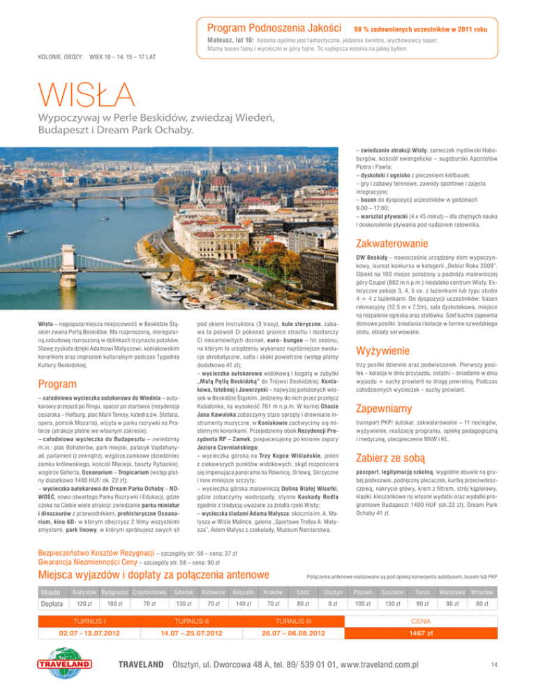 Program Podnoszenia Jakości 98 % zadowolonych uczestników w 2011 roku Mateusz, lat 10: Kolonia ogólnie jest fantastyczna, jedzenie świetne, wychowawcy super. Mamy basen fajny i wycieczki w góry fajne. To najlepsza kolonia na jakiej byłem. KOLONIE, OBOZY: WIEK 10 – 14, 15 – 17 LAT WISŁA Wypoczywaj w Perle Beskidów, zwiedzaj Wiedeń, Budapeszt i Dream Park Ochaby. – zwiedzanie atrakcji Wisły: zameczek myśliwski Habsburgów, kościół ewangelicko – augsburski Apostołów Piotra i Pawła; – dyskoteki i ognisko z pieczeniem kiełbasek; – gry i zabawy terenowe, zawody sportowe i zajęcia integracyjne; – basen do dyspozycji uczestników w godzinach 9.00 – 17.00; – warsztat pływacki (4 x 45 minut) – dla chętnych nauka i doskonalenie pływania pod nadzorem ratownika. Zakwaterowanie Wisła – najpopularniejsza miejscowość w Beskidzie Śląskim zwana Perłą Beskidów. Ma rozproszoną, nieregularną zabudowę rozrzuconą w dolinkach trzynastu potoków. Sławę zyskała dzięki Adamowi Małyszowi, koniakowskim koronkom oraz imprezom kulturalnym podczas Tygodnia Kultury Beskidzkiej. Program – całodniowa wycieczka autokarowa do Wiednia – autokarowy przejazd po Ringu, spacer po starówce (rezydencja cesarska – Hofburg, plac Marii Teresy, katedra św. Stefana, opera, pomnik Mozarta), wizyta w parku rozrywki na Praterze (atrakcje płatne we własnym zakresie); – całodniowa wycieczka do Budapesztu – zwiedzimy m.in.: plac Bohaterów, park miejski, pałacyk Vajdahunyad, parlament (z zewnątrz), wzgórze zamkowe (dziedziniec zamku królewskiego, kościół Macieja, baszty Rybackie), wzgórze Gellerta, Oceanarium – Tropicarium (wstęp płatny dodatkowo 1400 HUF/ ok. 22 zł); – wycieczka autokarowa do Dream Parku Ochaby – NOWOŚĆ, nowo otwartego Parku Rozrywki i Edukacji, gdzie czeka na Ciebie wiele atrakcji: zwiedzanie parku miniatur i dinozaurów z przewodnikiem, prehistoryczne Oceanarium, kino 6D- w którym obejrzysz 2 filmy wszystkimi zmysłami, park linowy, w którym spróbujesz swych sił pod okiem instruktora (3 trasy), kule sferyczne, zabawa ta pozwoli Ci pokonać granice strachu i dostarczy Ci niesamowitych doznań, euro- bungee – hit sezonu, na którym to urządzeniu wykonasz najróżniejsze ewolucje akrobatyczne, salta i skoki powietrzne (wstęp płatny dodatkowo 41 zł); – wycieczka autokarowa widokową i bogatą w zabytki „Małą Pętlą Beskidzką” do Trójwsi Beskidzkiej: Koniakowa, Istebnej i Jaworzynki – najwyżej położonych wiosek w Beskidzie Śląskim. Jedziemy do nich przez przełęcz Kubalonka, na wysokość 761 m n.p.m. W kurnej Chacie Jana Kawuloka zobaczymy stare sprzęty i drewniane instrumenty muzyczne, w Koniakowie zachwycimy się misternymi koronkami. Przejedziemy obok Rezydencji Prezydenta RP – Zamek, pospacerujemy po koronie zapory Jeziora Czerniańskiego; – wycieczka górska na Trzy Kopce Wiślańskie, jeden z ciekawszych punktów widokowych, skąd rozpościera się imponująca panorama na Równicę, Orłową, Skrzyczne i inne mniejsze szczyty; – wycieczka górska malowniczą Dolina Białej Wisełki, gdzie zobaczymy wodospady, słynne Kaskady Rodła zgodnie z tradycją uważane za źródła rzeki Wisły; – wycieczka śladami Adama Małysza: skocznia im. A. Małysza w Wiśle Malince, galeria „Sportowe Trofea A. Małysza”, Adam Małysz z czekolady, Muzeum Narciarstwa; DW Beskidy – nowocześnie urządzony dom wypoczynkowy, laureat konkursu w kategorii „Debiut Roku 2009”. Obiekt na 100 miejsc położony u podnóża malowniczej góry Czupel (882 m n.p.m.) niedaleko centrum Wisły. Estetyczne pokoje 3, 4, 5 os. z łazienkami lub typu studio 4 + 4 z łazienkami. Do dyspozycji uczestników: basen rekreacyjny (12,5 m x 7,5m), sala dyskotekowa, miejsce na rozpalenie ogniska oraz stołówka. Szef kuchni zapewnia domowe posiłki: śniadania i kolacje w formie szwedzkiego stołu, obiady serwowane. Wyżywienie trzy posiłki dziennie oraz podwieczorek. Pierwszy posiłek – kolacja w dniu przyjazdu, ostatni – śniadanie w dniu wyjazdu + suchy prowiant na drogę powrotną. Podczas całodziennych wycieczek – suchy prowiant. Zapewniamy transport PKP/ autokar, zakwaterowanie – 11 noclegów, wyżywienie, realizację programu, opiekę pedagogiczną i medyczną, ubezpieczenie NNW i KL. Zabierz ze sobą paszport, legitymację szkolną, wygodne obuwie na grubej podeszwie, podręczny plecaczek, kurtkę przeciwdeszczową, nakrycie głowy, krem z filtrem, strój kąpielowy, klapki, kieszonkowe na własne wydatki oraz wydatki programowe Budapeszt 1400 HUF (ok.22 zł), Dream Park Ochaby 41 zł. Bezpieczeństwo Kosztów Rezygnacji – szczegóły str. 58 – cena: 37 zł Gwarancja Niezmienności Ceny – szczegóły str. 58 – cena: 90 zł Miejsca wyjazdów i dopłaty za połączenia antenowe Miasto Dopłata Białystok Bydgoszcz Częstochowa 120 zł 100 zł 70 zł Połączenia antenowe realizowane są pod opieką konwojenta autobusem, busem lub PKP Gdańsk Katowice Koszalin Kraków Łódź Olsztyn Poznań Szczecin Toruń 130 zł 70 zł 140 zł 70 zł 80 zł 0 zł 100 zł 130 zł 90 zł TURNUS I TURNUS II TURNUS III CENA 02.07 - 13.07.2012 14.07 – 25.07.2012 26.07 – 06.08.2012 1467 zł TRAVELAND Olsztyn, ul. Dworcowa 48 A, tel. 89/ 539 01 01, www.traveland.com.pl Warszawa Wrocław 90 zł 80 zł 14