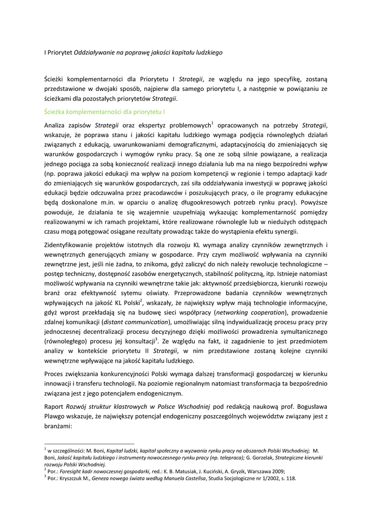 I Priorytet Oddziaływanie na poprawę jakości kapitału ludzkiego Ścieżki komplementarności dla Priorytetu I Strategii, ze względu na jego specyfikę, zostaną przedstawione w dwojaki sposób, najpierw dla samego priorytetu I, a następnie w powiązaniu ze ścieżkami dla pozostałych priorytetów Strategii. Ścieżka komplementarności dla priorytetu I Analiza zapisów Strategii oraz ekspertyz problemowych1 opracowanych na potrzeby Strategii, wskazuje, że poprawa stanu i jakości kapitału ludzkiego wymaga podjęcia równoległych działao związanych z edukacją, uwarunkowaniami demograficznymi, adaptacyjnością do zmieniających się warunków gospodarczych i wymogów rynku pracy. Są one ze sobą silnie powiązane, a realizacja jednego pociąga za sobą koniecznośd realizacji innego działania lub ma na niego bezpośredni wpływ (np. poprawa jakości edukacji ma wpływ na poziom kompetencji w regionie i tempo adaptacji kadr do zmieniających się warunków gospodarczych, zaś siła oddziaływania inwestycji w poprawę jakości edukacji będzie odczuwalna przez pracodawców i poszukujących pracy, o ile programy edukacyjne będą doskonalone m.in. w oparciu o analizę długookresowych potrzeb rynku pracy). Powyższe powoduje, że działania te się wzajemnie uzupełniają wykazując komplementarnośd pomiędzy realizowanymi w ich ramach projektami, które realizowane równolegle lub w niedużych odstępach czasu mogą potęgowad osiągane rezultaty prowadząc także do wystąpienia efektu synergii. Zidentyfikowanie projektów istotnych dla rozwoju KL wymaga analizy czynników zewnętrznych i wewnętrznych generujących zmiany w gospodarce. Przy czym możliwośd wpływania na czynniki zewnętrzne jest, jeśli nie żadna, to znikoma, gdyż zaliczyd do nich należy rewolucje technologiczne – postęp techniczny, dostępnośd zasobów energetycznych, stabilnośd polityczną, itp. Istnieje natomiast możliwośd wpływania na czynniki wewnętrzne takie jak: aktywnośd przedsiębiorcza, kierunki rozwoju branż oraz efektywnośd sytemu oświaty. Przeprowadzone badania czynników wewnętrznych wpływających na jakośd KL Polski2, wskazały, że największy wpływ mają technologie informacyjne, gdyż wprost przekładają się na budowę sieci współpracy (networking cooperation), prowadzenie zdalnej komunikacji (distant communication), umożliwiając silną indywidualizację procesu pracy przy jednoczesnej decentralizacji procesu decyzyjnego dzięki możliwości prowadzenia symultanicznego (równoległego) procesu jej konsultacji3. Ze względu na fakt, iż zagadnienie to jest przedmiotem analizy w kontekście priorytetu II Strategii, w nim przedstawione zostaną kolejne czynniki wewnętrzne wpływające na jakośd kapitału ludzkiego. Proces zwiększania konkurencyjności Polski wymaga dalszej transformacji gospodarczej w kierunku innowacji i transferu technologii. Na poziomie regionalnym natomiast transformacja ta bezpośrednio związana jest z jego potencjałem endogenicznym. Raport Rozwój struktur klastrowych w Polsce Wschodniej pod redakcją naukową prof. Bogusława Plawgo wskazuje, że największy potencjał endogeniczny poszczególnych województw związany jest z branżami: 1 w szczególności: M. Boni, Kapitał ludzki, kapitał społeczny a wyzwania rynku pracy na obszarach Polski Wschodniej; M. Boni, Jakośd kapitału ludzkiego i instrumenty nowoczesnego rynku pracy (np. telepraca); G. Gorzelak, Strategiczne kierunki rozwoju Polski Wschodniej. 2 Por.: Foresight kadr nowoczesnej gospodarki, red.: K. B. Matusiak, J. Kucioski, A. Gryzik, Warszawa 2009; 3 Por.: Kryszczuk M., Geneza nowego świata według Manuela Castellsa, Studia Socjologiczne nr 1/2002, s. 118. 1. województwo lubelskie – nauka i szkolnictwo wyższe, branże „rolnicze” czyli produkcja ekologicznej żywności, przetwórstwo spożywcze, odnawialne źródła energii; 2. województwo podkarpackie - przemysł lotniczy i technologie informatyczne oraz przemysł spożywczy i turystyka; 3. województwo podlaskie – branża spożywcza (głównie mleczarska), drzewna (w tym meblarstwo), maszynowa i turystyczna; 4. województwo świętokrzyskie - branże związane z surowcami naturalnymi (przemysł cementowy, wapienniczy, gipsowy, wyroby ceramiczne), przemysłem spożywczym (głównie mięsny i mleczarski), przetwórstwem owocowo-warzywnym, przemysłem metalurgicznym i branża stalowa; 5. województwo warmiosko-mazurskie - rolnictwo, turystyka, przemysł spożywczy oraz przemysł meblarski.4 Poszukiwanie przewag konkurencyjnych wykorzystujących ww. endogeniczny potencjał regionu wskazuje przyszłe trendy gospodarcze regulujące zapotrzebowanie na regionalne kadry. Mając na uwadze, że rozwój ww. branż istotnych dla poszczególnych województw wymaga dostarczenia na rynek pracy określonych kompetencji, inwestycja w rozwój kierunków technicznych i inżynieryjnych powinna stanowid najistotniejszy projekt inwestycji w KL Polski Wschodniej. Realizacja projektów związanych z rozwojem kierunków technicznych i inżynieryjnych polega na inwestycji w modernizację i / lub rozszerzenie zakresu kierunków studiów, wprowadzanie innowacyjnych metod nauczania oraz podniesienie wartości merytorycznej dostarczanej wiedzy poprzez aktualizację treści materiałów w oparciu o opisy przypadków i najświeższe publikacje. Celem wdrażania projektu istotnego jest podniesienie jakości kształcenia na kierunkach strategicznych dla województw PW i dostarczenie na rynek pracy odpowiednio wykwalifikowanych kadr niezbędnych do rozwijania potencjału endogenicznego tych województw. Działania takie przyczynią się do poprawy jakości KL co będzie podstawą do budowania przewagi konkurencyjnej PW i zarazem wzrostu gospodarczego na tym obszarze. 4 B. Plawgo (red.nauk.): Rozwój struktur klastrowych w Polsce Wschodniej, Warszawa 2007 r. 1. Granty i stypendia dla kadry naukowej 2. Projekty inwestycyjne na uczelniach wyższ