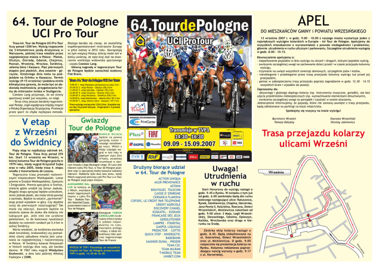 64. Tour de Pologne UCI Pro Tour 13 września 2007 r. w godz. 9.00 – 10.00 z naszego miasta wystartuje jeden z największych wyścigów kolarskich w Europie - 64 Tour de Pologne. Apelujemy do wszystkich mieszkańców o wyrozumiałość z powodu niedogodności i problemów, głównie utrudnienia w ruchu ulicznym i parkowaniu. Szczególne utrudnienia wystąpią w godz. 8.00 – 10.15. Równocześnie apelujemy o: - nieparkowanie pojazdów w dniu wyścigu na ulicach i drogach, którymi pojedzie wyścig, - zwrócenie szczególnej uwagi na zachowanie dzieci przed i w czasie przejazdu kolumny wyścigu, - trzymanie na uwięzi wszystkich zwierząt domowych, szczególnie psów i kotów, - niewbieganie i przebieganie przez trasę przejazdu kolumny wyścigu tuż przed jej przejazdem, - pomoc w zabezpieczeniu trasy przejazdu poprzez zagrodzenie w godz. 12.30 – 14.15 wszystkich bram i wjazdów do posesji. Trasa 64. Tour de Pologne UCI Pro Tour: 9.09.07 1. etap Warszawa (drużynowo na czas) 3 km 10.09.07 2. etap Płońsk - Olsztyn 202,4 km 11.09.07 3. etap Ostróda - Gdańsk 192,2 km 12.09.07 4. etap Chojnice - Poznań 242,3 km 13.09.07 5. etap Września - Świdnica 255,7 km 14.09.07 6. etap Dzierżoniów - Jelenia Góra 181,2 km 15.09.07 7. etap Jelenia Góra - Karpacz 147,7 km Zapraszamy do: - aktywnego i głośnego dopingu kolarzy (np. instrumenty muzyczne, gwizdki), ale bez użycia przedmiotów niebezpiecznych (np. wymachiwanie elementami dmuchanymi), - zwrócenia szczególnej uwagi na porządek i czystość w swoim otoczeniu. Jednocześnie informujemy, że pojazdy, które nie zostaną usunięte z trasy przejazdu, będą odholowane na parkingi na koszt właściciela. Trasa wyścigu ma łącznie 1224,5 km. Znajdzie się na niej 16 premii lotnych, 14 górskich i 4 premie specjalne. Spotkajmy się wszyscy na trasie wyścigu! Gwiazdy Tour de Pologne Trasa przejazdu kolarzy ulicami Wrześni YN ESZ OPI JANA ŁA PAW II A ICZ IEW NK SIE K RYNE KA LI SK A SK AW CŁ O WR A Zbiórka ekip kolarzy nastąpi o godz. 8.45. Będą zlokalizowane na ul. Kościelnej, Dzieci Wrzesińskich oraz ul. Mickiewicza. O godz. 9.05 rozpocznie się prezentacja kolarzy na Rynku. Kolumna reklamowa poprzedzająca wyścig wyruszy o godz. 9.17 z ul. Harcerskiej. AJA 3M INA OP Start Honorowy do wyścigu nastąpi o godz. 9.45 z Rynku. W związku z tym już od godz. 6.00 zamknięte będą dla ruchu kołowego następujące ulice: Ratuszowa, Rynek, Sienkiewicza, Chopina, Harcerska, Jana Pawła II, Kościelna, Rzeczna, Dzieci Wrzesińskich, Mickiewicza natomiast od godz. 9.00 ulice: 3 Maja, Legii Wrzesińskiej, Słowackiego, Szkolna, Opieszyn, Kaliska, Wrocławska oraz droga w kierunku na Środę. CH ACTION UNIQUA AG2R PREVOYANCE ASTANA BOUYGUES TELECOM CAISSE D`EPARGNE CERAMICA FLAMINIA COFIDIS, LE CREDIT PAR TELEPHONE CREDIT AGRICOLE DISCOVERY CHANEL EUSKATEL - EUSKADI FRANCAISE DES JEUX GEROLSTEINER LAMPRE - FONDITAL GASPOL LIQUIGAS PREDICTOR - LOTTO QUICK STEP - INNERGETIC RABOBANK SAUNIER DUVAL - PRODIR TEAM CSC TEAM MILRAM T-MOBILE TEAM UNIBET.COM Uwaga! Utrudnienia w ruchu J Drużyny biorące udział w 64. Tour de Pologne KIE Wyścig w TVP1 Transmisję ze wszystkich etapów 64 Tour de Pologne przeprowadzi TVP1 w godz. 14.30 do 16.30. Starosta Wrzesiński Dionizy Jaśniewicz IŃS Szwajcar Fabien Cancellara to aktualny mistrz świata w jeździe indywidualnej na czas, zwycięzca prologu i etapu, a także kilkudniowy lider podczas tegorocznego Tour de France Burmistrz Wrześni Tomasz Kałużny ES RZ II W Alessandro Ballan to kolejny as z Włoch, zwycięzca dwóch tegorocznych imprez z cyklu Pro Tour – Dookoła Flandrii i Vatenfall Classic, przed rokiem trzeci w Tour de Pologne. APEL LEG Piąty etap to najdłuższy odcinek 64. Tour de Pologne. Trasa liczy ponad 255 km. Start 13 września we Wrześni, w której kolumna Tour de Pologne gościła w 1979 roku, kiedy wygrał Krzysztof Sujka oraz w roku 2005, kiedy trasa 4. etapu wiodła z Inowrocławia do Leszna. Tegoroczna trasa prowadzi malowniczymi miasteczkami Wielkopolski. Lotne premie w Środzie Wielkopolskiej, Gostyniu i Żmigrodzie. Premia specjalna w Śremie, mieście gdzie urodził się Zenon Jaskuła. Długość etapu sprzyjać będzie ucieczkom, teren jednak płaski, ale może silnie powiać z zachodu. Będzie to ostatni „sprinterski” etap przed wjazdem w góry. Czy dojdzie tutaj do pierwszych rozstrzygnięć? Tak może się zdarzyć, bowiem będzie to ostatnia szansa do ataku dla kolarzy nie lubiących gór. Jeśli nikt nie ucieknie peletonowi, to do końcowej rywalizacji dojdzie na czterech rundach po 5,4 km w samej Świdnicy. Warto wiedzieć, że świdnicka starówka obok toruńskiej, krakowskiej czy poznańskiej starej zabudowy miasta jest uznawana za najpiękniejszą i najcenniejszą w Polsce. W Świdnicy kolarze finiszowali w historii wyścigu dwa razy, ale bardzo dawno. W 1967 roku wygrał Władysław Kozłowski, a dwa lata później Mikołaj Fadiejew z ZSRR. do MIESZKAŃCÓW GMINY i POWIATU WRZESIŃSKIEGO Dlatego bardzo się cieszę, że zostaliśmy współorganizatorami mistrzostw Europy w piłce nożnej w 2012 roku. Skorzystają na tym wszyscy Polacy, którzy może też w końcu uwierzą, że nasz kraj stać na stworzenie wielkiego widowiska sportowego - uważa Czesław Lang. Główną nagrodą w tegorocznym Tour de Pologne będzie samochód osobowy Fiat Bravo. D a n ilo D i L uca będzie na pewno gwiazdą numer 1 naszego narodowego touru. Włoch z ekipy Liquigas wygrał w tym roku w pięknym stylu Giro d’Italia, wcześniej triumfował w słynnym klasyku Liege-Bastogne-Liege. Di Luca jest liderem cyklu Pro Tour, w Tour de Pologne pojedzie więc w specjalnej białej koszulce należnej liderowi. Podobnie było dwa lata temu, kiedy Włoch wygrywał pierwszy cykl Pro Tour a w Tour de Pologne zajął piąte miejsce. WIEŚCI z RATUSZA 17/2007 O V etap z Wrześni do Świdnicy 1 września 2007 r. IEG Trasa 64. Tour de Pologne UCI Pro Tour liczy ponad 1200 km. Wyścig