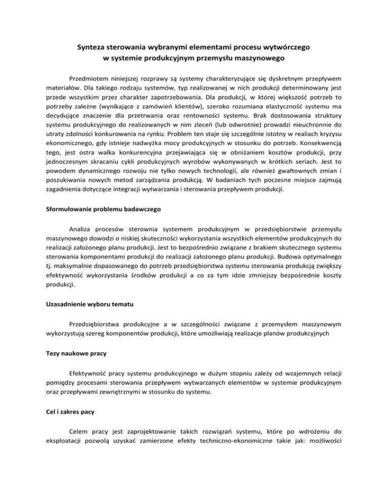 Synteza sterowania wybranymi elementami procesu wytwórczego w