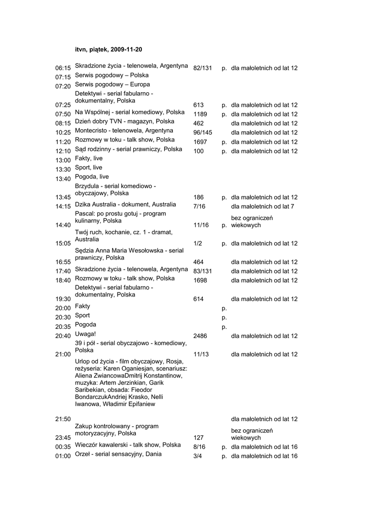 itvn, piątek, 2009-11-20 06:15 Skradzione życia - telenowela, Argentyna 07:15 Serwis pogodowy – Polska 07:20 Serwis pogodowy – Europa Detektywi - serial fabularno dokumentalny, Polska 07:25 07:50 Na Wspólnej - serial komediowy, Polska 08:15 Dzień dobry TVN - magazyn, Polska 10:25 Montecristo - telenowela, Argentyna 11:20 Rozmowy w toku - talk show, Polska 12:10 Sąd rodzinny - serial prawniczy, Polska 13:00 Fakty, live 13:30 Sport, live 13:40 Pogoda, live Brzydula - serial komediowo obyczajowy, Polska 13:45 14:15 Dzika Australia - dokument, Australia Pascal: po prostu gotuj - program kulinarny, Polska 14:40 Twój ruch, kochanie, cz. 1 - dramat, Australia 15:05 Sędzia Anna Maria Wesołowska - serial prawniczy, Polska 16:55 17:40 Skradzione życia - telenowela, Argentyna 18:40 Rozmowy w toku - talk show, Polska Detektywi - serial fabularno dokumentalny, Polska 19:30 20:00 Fakty 20:30 Sport 20:35 Pogoda 20:40 Uwaga! 39 i pół - serial obyczajowo - komediowy, Polska 21:00 Urlop od życia - film obyczajowy, Rosja, reżyseria: Karen Oganiesjan, scenariusz: Aliena ZwiancowaDmitrij Konstantinow, muzyka: Artem Jerzinkian, Garik Saribekian, obsada: Fieodor BondarczukAndriej Krasko, Nelli Iwanowa, Władimir Epifaniew 82/131 p. dla małoletnich od lat 12 613 1189 462 96/145 1697 100 p. dla małoletnich od lat 12 p. dla małoletnich od lat 12 dla małoletnich od lat 12 dla małoletnich od lat 12 p. dla małoletnich od lat 12 p. dla małoletnich od lat 12 186 p. dla małoletnich od lat 12 7/16 dla małoletnich od lat 7 11/16 bez ograniczeń p. wiekowych 1/2 p. dla małoletnich od lat 12 464 83/131 1698 dla małoletnich od lat 12 dla małoletnich od lat 12 dla małoletnich od lat 12 614 dla małoletnich od lat 12 p. p. p. 2486 dla małoletnich od lat 12 11/13 dla małoletnich od lat 12 21:50 dla małoletnich od lat 12 Zakup kontrolowany - program motoryzacyjny, Polska 23:45 00:35 Wieczór kawalerski - talk show, Polska 01:00 Orzeł - serial sensacyjny, Dania 127 8/16 3/4 bez ograniczeń wiekowych p. dla małoletnich od lat 16 p. dla małoletnich od lat 16 Detektywi - serial fabularno dokumentalny, Polska 01:55 02:25 Superwizjer 02:50 Montecristo - telenowela, Argentyna Sędzia Anna Maria Wesołowska - serial prawniczy, Polska 03:40 04:25 Rozmowy w toku - talk show, Polska 05:15 Fakty 05:45 Sport 05:50 Pogoda 05:55 Uwaga! 614 866 96/145 p. dla małoletnich od lat 12 p. dla małoletnich od lat 16 p. dla małoletnich od lat 12 464 1698 2486 p. dla małoletnich od lat 12 p. dla małoletnich od lat 12 p. p. p. p. dla małoletnich od lat 12 7/16 16/17 p. dla małoletnich od lat 7 dla małoletnich od lat 12 11/13 p. dla małoletnich od lat 12 12/41 dla małoletnich od lat 12 366 424 bez ograniczeń wiekowych dla małoletnich od lat 12 dla małoletnich od lat 12 itvn, sobota, 2009-11-21 06:15 Dzika Australia - dokument, Australia 06:45 Podróże z Meteo - Zielona Góra, Polska 39 i pół - serial obyczajowo - komediowy, Polska 07:05 Polisa na szczęście - serial obyczajowy, Czechy 07:45 Kaczki - film musical, Polska 1983, reżyseria: Aleksander Oczko , scenariusz: Aleksander Oczko , muzyka: Jacek Mikuła, 08:45 09:00 Dzień dobry TVN - magazyn, Polska 11:15 Co za tydzień - magazyn, Polska Pascal: po prostu gotuj - program kulinarny, Polska 11:40 Maja w ogrodzie - magazyn, Polska 12:05 12:30 Magiel Towarzyski - magazyn, Polska 13:00 Fakty, live 13:25 Sport, live 13:35 Pogoda, live Droga do Avonlea - serial obyczajowy, Kanada 13:40 Droga do Avonlea - serial obyczajowy, Kanada 14:30 Sekrety i Skarby III Rzeszy Taśma z Kopenhagi 15:30 Uwaga! Pirat - program motoryzacyjny, Polska 15:55 16:35 Ten jeden dzień - talk show, Polska 17:00 Miasto Kobiet - magazyn, Polska Szymon Majewski Show - program rozrywkowy, Polska 17:50 1/9 10/16 bez ograniczeń wiekowych bez ograniczeń wiekowych dla małoletnich od lat 12 41/91 dla małoletnich od lat 7 42/91 dla małoletnich od lat 7 2/10 dla małoletnich od lat 12 12/16 11/14 2/8 6/8 dla małoletnich od lat 12 p. dla małoletnich od lat 12 dla małoletnich od lat 12 10/14 p. dla małoletnich od lat 12 18:45 19:30 20:00 20:25 20:30 20:40 21:00 22:30 00:20 39 i pół - serial obyczajowo - komediowy, Polska Grzeszni i bogaci - serial komediowy, Polska Fakty Sport Pogoda Uwaga! Mam talent - program rozrywkowy, Polska Twój ruch, kochanie, cz. 2 - dramat, Australia Sekrety i Skarby III Rzeszy Taśma z Kopenhagi 11/13 p. dla małoletnich od lat 12 4 dla małoletnich od lat 12 p. p. p. 2487 dla małoletnich od lat 12 11/13 dla małoletnich od lat 12 2 dla małoletnich od lat 12 2/10 Grzeszni i bogaci - serial komediowy, Polska p. dla małoletnich od lat 12 00:45 4 01:10 Naznaczony - serial tajemnicy, Polska 11/13 Desant pod Dieppe wojenny, Kanada 01:55 1/2 Urlop od życia - film obyczajowy, Rosja, reżyseria: Karen Oganiesjan, scenariusz: Aliena ZwiancowaDmitrij Konstantinow, muzyka: Artem Jerzinkian, Garik Saribekian, obsada: Fieodor BondarczukAndriej Krasko, Nelli Iwanowa, Władimir Epifaniew p. dla małoletnich od lat 12 p. dla małoletnich od lat 16 03:30 05:20 Fakty 05:45 Pogoda 05:55 Uwaga! p. dla małoletnich od lat 12 p. p. p. dla małoletnich od lat 12 2487 p. dla małoletnich od lat 12 itvn, niedziela, 2009-11-22 06:15 Co za tydzień - magazyn, Polska 424 Magiel Towarzyski magazyn, Polska 06:35 10/16 Zuzanna i chłopcy - film obyczajowy, Polska 1961, reżyseria: Stanisław Możdżeński , scenariusz: Janusz Chudzyński , muzyka: Andrzej Trzaskowski , obsada: Ewa Krzyżewska , Adam Hanuszkiewicz, Tadeusz Pluciński p. dla małoletnich od lat 12 p. dla małoletnich od lat 12 07:10 p. dla małoletnich od lat 12 Grzeszni i bogaci - serial komediowy, Polska 08:35 09:00 Dzień dobry TVN - magazyn, Polska Kawa na ławę - program publicystyczny, Polska 11:15 4 367 11/17 p. dla małoletnich od lat 12 dla małoletnich od lat 12 dla małoletnich od lat 12 12:00 12:30 13:00 13:25 13:35 13:40 14:30 JAZDA POLSKA - program motoryzacyjny, Polska Gadżet - magazyn, Polska Fakty