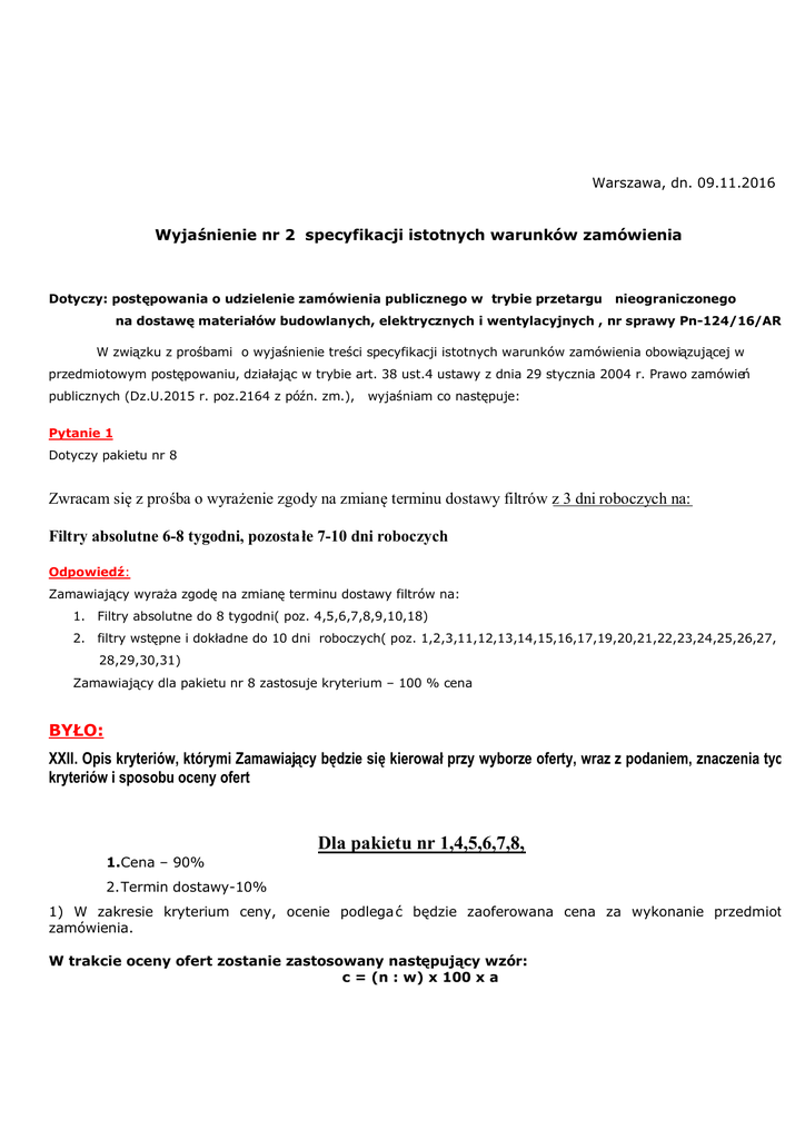 Warszawa, dn. 09.11.2016 Wyjaśnienie nr 2 specyfikacji istotnych warunków zamówienia Dotyczy: postępowania o udzielenie zamówienia publicznego w trybie przetargu nieograniczonego na dostawę materiałów budowlanych, elektrycznych i wentylacyjnych , nr sprawy Pn-124/16/AR W związku z prośbami o wyjaśnienie treści specyfikacji istotnych warunków zamówienia obowiązującej w przedmiotowym postępowaniu, działając w trybie art. 38 ust.4 ustawy z dnia 29 stycznia 2004 r. Prawo zamówień publicznych (Dz.U.2015 r. poz.2164 z późn. zm.), wyjaśniam co następuje: Pytanie 1 Dotyczy pakietu nr 8 Zwracam się z prośba o wyrażenie zgody na zmianę terminu dostawy filtrów z 3 dni roboczych na: Filtry absolutne 6-8 tygodni, pozostałe 7-10 dni roboczych Odpowiedź: Zamawiający wyraża zgodę na zmianę terminu dostawy filtrów na: 1. Filtry absolutne do 8 tygodni( poz. 4,5,6,7,8,9,10,18) 2. filtry wstępne i dokładne do 10 dni roboczych( poz. 1,2,3,11,12,13,14,15,16,17,19,20,21,22,23,24,25,26,27, 28,29,30,31) Zamawiający dla pakietu nr 8 zastosuje kryterium – 100 % cena BYŁO: XXII. Opis kryteriów, którymi Zamawiający będzie się kierował przy wyborze oferty, wraz z podaniem, znaczenia tych kryteriów i sposobu oceny ofert Dla pakietu nr 1,4,5,6,7,8, 1.Cena – 90% 2. Termin dostawy-10% 1) W zakresie kryterium ceny, ocenie podlega ć będzie zaoferowana cena za wykonanie przedmiotu zamówienia. W trakcie oceny ofert zostanie zastosowany następujący wzór: c = (n : w) x 100 x a gdzie: c – ilość punktów obliczona dla kryterium cena oferty n – najniższa wartość z zaoferowanych ofert w – wartość z oferty badanej a – waga kryterium – cena oferty (a = 90%) oferowany terminu dostawy. 2) W zakresie kryterium terminu dostawy, ocenie podlega ć będzie Zamawiający zastrzega, że termin dostawy nie może dłuższy niż: - do 3 dni roboczych Jeżeli wykonawca poda dłuższy termin dostawy, Zamawiający uzna tą ofertę jako niezgodna ze siwz, podlegająca odrzuceniu na podstawie art. 89 ust. 1 pkt. 2 upzp. W trakcie oceny ofert zostanie zastosowany następujący wzór arytmetyczny: g = (w : n) x 100 x b gdzie: g – ilość punktów obliczona dla kryterium termin dostawy w – wartość z oferty badanej n – najwyższa wartość z zaoferowanych ofert b – waga kryterium – termin dostawy (b = 10%) Termin dostawy: do 3 dni roboczych - 3 dni robocze - 0 pkt. - 2 dni robocze – 10 pkt. Dla pakietu nr 2,3 3.Cena – 90% 4. Termin dostawy-10% 1) W zakresie kryterium ceny, ocenie podlegać będzie oferowana przez wykonawcę cena przedmiotu zamówienia. W trakcie oceny ofert zostanie zastosowany następujący wzór: c = (n : w) x 100 x a gdzie: c – ilość punktów obliczona dla kryterium cena oferty n – najniższa wartość z zaoferowanych ofert w – wartość z oferty badanej a – waga kryterium – cena oferty (a = 90%) za wykonanie 2) W zakresie kryterium terminu dostawy, ocenie podlega ć będzie zaproponowana przez wykonawcę przewidywana długość terminu dostawy. Zamawiający zastrzega, że termin dostawy nie może dłuższy niż: - do 10 dni roboczych Jeżeli wykonawca poda dłuższy termin dostawy, Zamawiający uzna tą ofertę jako niezgodna ze siwz, podlegająca odrzuceniu na podstawie art. 89 ust. 1 pkt. 2 upzp W trakcie oceny ofert zostanie zastosowany następujący wzór arytmetyczny: g = (w : n) x 100 x b gdzie: g – ilość punktów obliczona dla kryterium termin dostawy w – wartość z oferty badanej n – najwyższa wartość z zaoferowanych ofert b – waga kryterium – termin dostawy (b = 10%) Termin dostawy: do 10 dni roboczych - 10 dni robocze - 0 pkt. - 5 dni robocze – 10 pkt. Za najkorzystniejszą ofertę Zamawiający uzna ofertę, która uzyska największą sumę punktów z ww. kryteriów oraz będzie spełniała warunki zawarte w SIWZ. Jeżeli nie będzie można wybrać oferty najkorzystniejszej z uwagi na to, że dwie lub więcej ofert przedstawia taki sam bilans ceny i innych kryteriów oceny ofert, Zamawiający spośród tych ofert wybierze ofertę z najniższą ceną. JEST: XXII. Opis kryteriów, którymi Zamawiający będzie się kierował przy wyborze oferty, wraz z podaniem, znaczenia tych kryteriów i sposobu oceny ofert Dla pakietu nr 1,4,5,6,7, 1. Cena – 90% 2. Termin dostawy-10% 1) W zakresie kryterium ceny, ocenie podlega ć będzie zaoferowana cena za wykonanie przedmiotu zamówienia. W trakcie oceny ofert zostanie zastosowany następujący wzór: c = (n : w) x 100 x a gdzie: c – ilość punktów obliczona dla kryterium cena oferty n – najniższa wartość z zaoferowanych ofert w – wartość z oferty badanej a – waga kryterium – cena oferty (a = 90%) oferowany terminu dostawy. 2) W zakresie kryterium terminu dostawy, ocenie podlega ć będzie Zamawiający zastrzega, że termin dostawy nie może dłuższy niż: - do 3 dni roboczych Jeżeli wykonawca poda dłuższy termin dostawy, Zamawiający uzna tą ofertę jako niezgodna ze siwz, podlegająca odrzuceniu na podstawie art. 89 ust. 1 pkt. 2 upzp. W trakcie oceny ofert zostanie zastosowany następujący wzór arytmetyczny: g = (w : n) x 100 x b gdzie: g – ilość punktów obliczona dla kryterium termin dostawy w – wartość z oferty badanej n – najwyższa wartość z zaoferowanych ofert b – waga kryterium – termin dostawy (b = 10%) Termin dostawy: do 3 dni roboczych - 3 dni robocze - 0 pkt. - 2 dni robocze – 10 pkt. Dla pakietu nr 2,3 1.Cena – 90% 2.Termin dostawy-10% 1) W zakresie kryterium ceny, ocenie podlegać będzie oferowana przez wykonawcę cena przedmiotu zamówienia. za wykonanie W trakcie oceny ofert zostanie zastosowany następujący wzór: c = (n : w) x 100 x a gdzie: c – ilość punktów obliczona dla kryterium cena oferty n – najniższa wartość z zaoferowanych ofert w – wartość z oferty badanej a – waga kryterium – cena oferty (a = 90%) 2) W zakresie kryterium terminu dostawy, ocenie podlega ć będzie zapropono