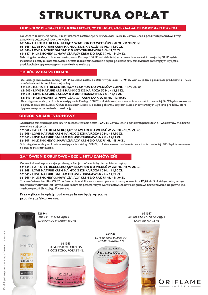 STRUKTURA OPŁAT ODBIÓR W BIURACH REGIONALNYCH, W FILIACH, ODDZIA¸ACH I KIOSKACH RUCHU Do ka˝dego zamówienia poni˝ej 100 PP doliczona zostanie opłata w wysokoÊci - 5,90 zł. Zamów jeden z poni˝szych produktów Twoje zamówienie b´dzie zwolnione z tej opłaty. 621644 - HAIRX R.T. REGENERUJÑCY SZAMPON DO WŁOSÓW 250 ML - 11,90 ZŁ lub 621645 - LOVE NATURE KREM NA NOC Z DZIKÑ RÓ˚Ñ 50 ML - 11,90 ZŁ 621646 - LOVE NATURE BALSAM DO UST-TRUSKAWKA 7 G - 11,90 ZŁ 621647 - MILK&HONEY G. NAWIL˚AJÑCY KREM DO RÑK 75 ML - 11,90 ZŁ Gdy osiàgniesz w danym okresie obowiàzywania Katalogu 100 PP, to ka˝de kolejne zamówienie o wartoÊci co najmniej 50 PP b´dzie zwolnione z opłaty za małe zamówienie. Opłata za małe zamówienie nie b´dzie pobierana przy zamówieniach zawierajàcych wyłàcznie produkty, które były niedost´pne i oczekiwały na realizacj´. ODBIÓR W PACZKOMACIE Do ka˝dego zamówienia poni˝ej 100 PP doliczona zostanie op∏ata w wysokoÊci - 7,90 z∏. Zamów jeden z poni˝szych produktów, a Twoje zamówienie b´dzie zwolnione z tej op∏aty. 621644 - HAIRX R.T. REGENERUJÑCY SZAMPON DO WŁOSÓW 250 ML - 13,90 ZŁ lub 621645 - LOVE NATURE KREM NA NOC Z DZIKÑ RÓ˚Ñ 50 ML - 13,90 ZŁ 621646 - LOVE NATURE BALSAM DO UST-TRUSKAWKA 7 G - 13,90 ZŁ 621647 - MILK&HONEY G. NAWIL˚AJÑCY KREM DO RÑK 75 ML - 13,90 ZŁ Gdy osiàgniesz w danym okresie obowiàzywania Katalogu 100 PP, to ka˝de kolejne zamówienie o wartoÊci co najmniej 50 PP b´dzie zwolnione z opłaty za małe zamówienie. Opłata za małe zamówienie nie b´dzie pobierana przy zamówieniach zawierajàcych wyłàcznie produkty, które były niedost´pne i oczekiwały na realizacj´. ODBIÓR NA ADRES DOMOWY Do ka˝dego zamówienia poni˝ej 100 PP doliczona zostanie opłata - 9,90 zł. Zamów jeden z poni˝szych produktów, a Twoje zamówienie b´dzie zwolnione z tej opłaty. 621644 - HAIRX R.T. REGENERUJÑCY SZAMPON DO WŁOSÓW 250 ML - 15,90 ZŁ lub 621645 - LOVE NATURE KREM NA NOC Z DZIKÑ RÓ˚Ñ 50 ML - 15,90 ZŁ 621646 - LOVE NATURE BALSAM DO UST-TRUSKAWKA 7 G - 15,90 ZŁ 621647 - MILK&HONEY G. NAWIL˚AJÑCY KREM DO RÑK 75 ML - 15,90 ZŁ Gdy osiàgniesz w danym okresie obowiàzywania Katalogu 100 PP, to ka˝de kolejne zamówienie o wartoÊci co najmniej 50 PP b´dzie zwolnione z opłaty za małe zamówienie. ZAMÓWIENIE GRUPOWE – BEZ LIMITU ZAMÓWIE¡! Zamów 2 dowolne promocyjne produkty, a Twoje zamówienie b´dzie zwolnione z opłaty. 621644 - HAIRX R.T. REGENERUJÑCY SZAMPON DO WŁOSÓW 250 ML - 11,90 ZŁ lub 621645 - LOVE NATURE KREM NA NOC Z DZIKÑ RÓ˚Ñ 50 ML - 11,90 ZŁ 621646 - LOVE NATURE BALSAM DO UST-TRUSKAWKA 7 G - 11,90 ZŁ 621647 - MILK&HONEY G. NAWIL˚AJÑCY KREM DO RÑK 75 ML - 11,90 ZŁ Przy zamówieniach od 0 – 299 PP do faktury pilota doliczona zostanie opłata za dostaw´ w kwocie - 17,90 zł. Do ka˝dego pojedynczego zamówienia wystawiana jest indywidualna faktura dla poszczególnych Konsultantów. Zamówienie grupowe b´dzie zawieraç ju˝ gotowe, jednostkowe paczki dla ka˝dego Konsultanta. Przy wyliczaniu opłaty, pod uwag´ brane b´dà wyłàcznie produkty zafakturowane. Produkty do wyczerpania zapasów magazynowych. 621644 HAIRX R.T. REGENERUJÑCY SZAMPON DO WŁOSÓW 250 ML 621645 LOVE NATURE KREM NA NOC Z DZIKÑ RÓ˚Ñ 50 ML 621647 MILK&HONEY G. NAWIL˚AJÑCY KREM DO RÑK 75 ML 621646 LOVE NATURE BALSAM DO UST-TRUSKAWKA 7 G