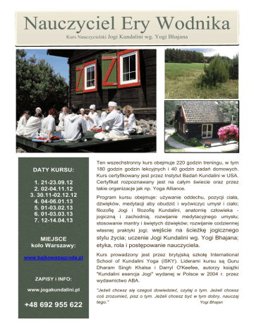 Nauczyciel Ery Wodnika Kurs Nauczycielski Jogi Kundalini wg. Yogi Bhajana DATY KURSU: 1. 21-23.09.12 2. 02-04.11.12 3. 30.11-02.12.12 4. 04-06.01.13 5. 01-03.02.13 6. 01-03.03.13 7. 12-14.04.13 Ten wszechstronny kurs obejmuje 220 godzin treningu, w tym 180 godzin godzin lekcyjnych i 40 godzin zadań domowych. Kurs certyfikowany jest przez Instytut Badań Kundalini w USA. Certyfikat rozpoznawany jest na całym świecie oraz przez takie organizacje jak np. Yoga Alliance. Program kursu obejmuje: używanie oddechu, pozycji ciała, dźwięków, medytacji aby obudzić i wyćwiczyc umysł i ciało; filozofię Jogi i filozofię Kundalini, anatomię człowieka jogiczną i zachodnią; rozwijanie medytacyjnego umysłu; stosowanie mantry i świętych dźwięków; rozwijanie codziennej własnej praktyki jogi; wejście na ścieżkę jogicznego MIEJSCE koło Warszawy: www.bajkowazagroda.pl ZAPISY i INFO: www.jogakundalini.pl +48 692 955 622 stylu życia; uczenie Jogi Kundalini wg. Yogi Bhajana; etyka, rola i postępowanie nauczyciela. Kurs prowadzony jest przez brytyjską szkołę International School of Kundalini Yoga (iSKY). Liderami kursu są Guru Dharam Singh Khalsa i Darryl O'Keefee, autorzy książki "Kundalini esencja Jogi" wydanej w Polsce w 2004 r. przez wydawnictwo ABA. "Jeżeli chcesz się czegoś dowiedzieć, czytaj o tym. Jeżeli chcesz coś zrozumieć, pisz o tym. Jeżeli chcesz być w tym dobry, nauczaj Yogi Bhajan tego."