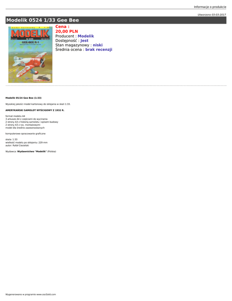 Informacje o produkcie Utworzono 03-03-2017 Modelik 0524 1/33 Gee Bee Cena : 20,00 PLN Producent : Modelik Dostępność : Jest Stan magazynowy : niski Średnia ocena : brak recenzji Modelik 05/24 Gee Bee (1:33) Wysokiej jakości model kartonowy do sklejania w skali 1:33. AMERYKAŃSKI SAMOLOT WYŚCIGOWY Z 1932 R. format modelu A4 3 arkusze A4 z częściami do wycinania 2 strony A3 z historią samolotu i opisem budowy 2 strony A3 z rys. montażowymi model dla średnio zaawansowanych komputerowe opracowanie graficzne skala: 1:33 wielkość modelu po sklejeniu: 229 mm autor: Rafał Ciesielski Wydawca: Wydawnictwo "Modelik" (Polska) Wygenerowano w programie www.oscGold.com