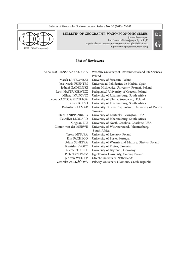 Bulletin of Geography. Socio–economic Series / No. 30 (2015): 7–147 BULLETIN OF GEOGRAPHY. SOCIO–ECONOMIC SERIES ISSN 1732–4254 quarterly journal homepages: http://www.bulletinofgeography.umk.pl/ http://wydawnictwoumk.pl/czasopisma/index.php/BGSS/index http://www.degruyter.com/view/j/bog DE G List of Reviewers Anna BOCHEŃSKA-SKAŁECKA Wrocław University of Environmental and Life Sciences, Poland Marek DUTKOWSKI University of Szczecin, Poland José María FUENTES Universidad Politécnica de Madrid, Spain Jędrzej GADZIŃSKI Adam Mickiewicz University, Poznań, Poland Lech HAYDUKIEWICZ Pedagogical University of Cracow, Poland Milena IVANOVIC University of Johannesburg, South Africa Iwona KANTOR-PIETRAGA University of Silesia, Sosnowiec, Poland Clare KELSO University of Johannesburg, South Africa Radoslav KLAMÁR University of Rzeszów, Poland; University of Prešov, Slovakia Hans KNIPPENBERG University of Kentucky, Lexington, USA Llewellyn LEONARD University of Johannesburg, South Africa Xingjian LIU University of North Carolina, Charlotte, USA Clinton van der MERWE University of Witwatersrand, Johannesburg, South Africa Teresa MITURA University of Rzeszów, Poland Elsa PACHECO University of Porto, Portugal Adam SENETRA University of Warmia and Mazury, Olsztyn, Poland Branislav ŠVORC University of Prešov, Slovakia Nicolai TEUFEL University of Bayreuth, Germany Piotr TRZEPACZ Jagiellonian University, Cracow, Poland Jan van WEESEP Utrecht University, Netherlands Veronika ZUSKÁČOVÁ Palacký University Olomouc, Czech Republic