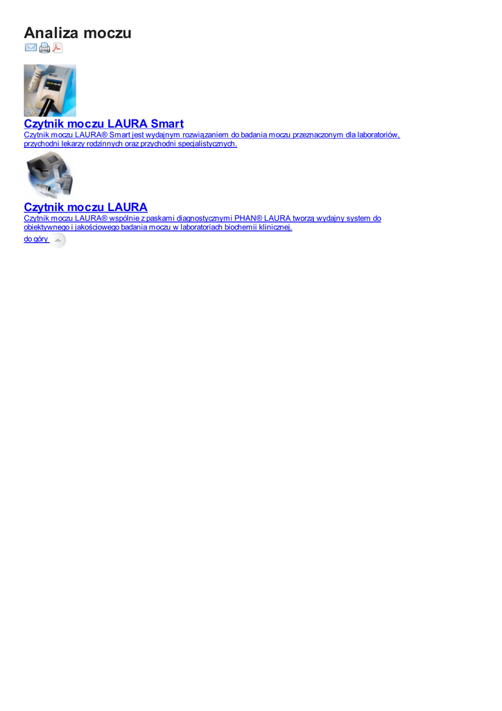 Analiza moczu Czytnik moczu LAURA Smart Czytnik moczu LAURA® Smart jest wydajnym rozwiązaniem do badania moczu przeznaczonym dla laboratoriów, przychodni lekarzy rodzinnych oraz przychodni specjalistycznych. Czytnik moczu LAURA Czytnik moczu LAURA® wspólnie z paskami diagnostycznymi PHAN® LAURA tworzą wydajny system do obiektywnego i jakościowego badania moczu w laboratoriach biochemii klinicznej. do góry