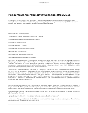 Gmina Subkowy Podsumowanie roku artystycznego 2015/2016 W roku artystycznym 2015/2016 w Dom Kultury prowadzona byłą edukacja kulturalna za równo dla dzieci jak i dorosłych mieszkańców. Wśród zajęć znalazły się warsztaty plastyczne, muzyczne taneczne, rękodzielnicze. Łącznie udział w nich brało 329 osób, na które składało się 20 grup warsztatowych. Wśród tych grup można wymienić: - 10 grup plastycznych, w których uczestniczyło 128 osób - 1 grupa miłośników orgiami modułowego – 7 osób; - 1 grupa teatralna – 13 osób; - 1 grupa muzyczna – 12 osób; - 1 grupa twórcza Sztukmistrzynie – 7 osób; - 4 grupy taneczne – 94 osoby; - 2 grupy ZUMBY dla dorosłych – 68 osób - 1 grupa Gimnastyki Prozdrowotnej – 12 osób Uczestnicy warsztatów tanecznych mogą się pochwalić udziałem w licznych turniejach, uczestnicy warsztatów plastycznych podczas zajęć wykonywali prace na różnorodne konkursy, a wśród nich na ogólnopolski konkurs „Pieniądz Przyszłości”, w którym wyróżnienie otrzymała Olga Koziura. Również uczestnicy warsztatów orgiami modułowego mają swoje sukcesy. Ania Makowska oraz Julia Dębowska wykonały pracę „Mały Głód”, która zajęła pierwsze miejsce w powiatowym konkursie „Serowe przysmaki” Za równo ilość odbiorców edukacji kulturalnej jak i osiągnięcia uczestników są dla nas ogromnym sukcesem, dlatego też w tym roku po raz pierwszy odbyło się uroczyste podsumowanie roku artystycznego. Podczas spotkania, na które zostali zaproszeni wszyscy uczestnicy warsztatów artystycznych, zaprezentowali się uczestnicy warsztatów muzycznych, trzy grupy warsztatów tanecznych oraz grupa teatralna z przedstawieniem „Książę szuka żony”. Na sali przygotowana została wystawa prac z orgiami modułowego oraz drzewko z wizerunkami uczestników warsztatów plastycznych. Ostatnim, ale równie ważnym punktem spotkania było wręczenie pamiątkowych dyplomów wszystkim uczestnikom warsztatów artystycznych. Uczestnicy zajęć odbywających się w Domu Kultury wychodzą również poza ramy edukacji kulturalnej i działają w innych obszarach. W ten sposób zawiązały się trzy grupy nieformalne, które przy pomocy Stowarzyszenia Pomoc za jeden Uśmiech oraz Domu Kultury złożyły wnioski otrzymując dotację na realizację własnych pomysłów. Są to: - nieformalna grupa Klub Zakręconego Gracza z Subków, która otrzymała dofinansowanie na realizację projektu „Coolturalne Popołudnia”, - grupa Creatywne Dzieciaki z Gorzędzieja realizująca projekt „Światłem Malowane” - oraz grupa Pozytywnie Zakręceni, skład której weszli uczestnicy zajęć socjoterapeutycznych w Małym Garcu, realizując projekt „Nadajemy rzeczom drugie życie”. 1 Gmina Subkowy Wszystkim uczestnikom serdecznie dziękujemy za udział w spotkaniu i już dziś zachęcamy do uczestnictwa w Wakacyjnej Kuźni Talentów, a od wrześni zapraszamy ponownie na warsztaty artystyczne do Domu Kultury! 2