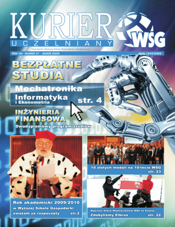 Rok akademicki 2009/2010 w Wyższej Szkole Gospodarki w Bydgoszczy uważam za rozpoczęty „Czas studiów to okres szczególny w życiu człowieka. To w tym okresie człowiek przygotowuje się do aktywności zawodowej, zdobywając wiedzę, postawy i umiejętności niezbędne do podjęcia twórczej pracy, kształtuje swój charakter i zasady, by prowadzić dobre i owocne życie, by w sposób odpowiedzialny spełniać swoje obowiązki obywatelskie. Niezależnie od wybranego kierunku studiów powinien on sięgać dalej i głębiej w swych zainteresowaniach i działaniach, by w możliwie pełny sposób czerpać z zasobów kultury światowej”. prof. WSG dr Kazimierz Marciniak Rektor WSG 2 Chciałabym nie zgodzić się z Katonem Uczelnię tworzą ludzie - głównie studenci, absolwenci i nauczyciele akademiccy. Studenci to grupa szczególnie plastyczna, podlegająca ciągłemu kształtowaniu i przemianom. To oni w rezultacie tworzą wizerunek Uczelni, na który składa się rozwój naukowy, poziom kształcenia, ciągłe podnoszenie jakości bazy dydaktycznej, infrastruktury oraz wskazywanie obszarów przedsiębiorczości. A kreowanie aktywności studenckiej zarówno w obszarze Akademickiej Przestrzeni Kulturalnej, w sporcie, w działaniach społecznych i medialnych to wartości dodane, które ogromnie procentują. Młody człowiek, który oprócz dyplomu WSG, wyniesie z Uczelni potwierdzone certyfikatami dodatkowe umiejętności oraz doświadczenia z działalności studenckiej, staje się człowiekiem bogatszym i bardziej wartościowym. Budujące jest, że nasi studenci i absolwenci mają pełną świadomość konieczności zdobywania wykształcenia i uprawnień w szerokim zakresie, że podejmują równolegle naukę na dwóch kierun- kach, bądź uzupełniają wiedzę na studiach podyplomowych i rozmaitych szkoleniach. Chciałabym nie zgodzić się ze starożytnym mówcą Katonem, który mówił: „Korzenie nauki są gorzkie, ale słodkie są jej owoce”. Moją ideą jest, aby te korzenie były co najmniej łagodne, a najlepiej „smaczne”. Aby studiowanie było przyjemnością, wynikającą z czerpania wiedzy z rozmaitych źródeł. I pasją związaną z tworzeniem nowych wartości. Z dumą przyglądam się metamorfozie wielu młodych ludzi studiujących w WSG. Z radością odbieram ich sukcesy w Studenckiej Strefie Biznesowej, w kołach naukowych, na niwie kultury i sportu… Z rozrzewnieniem wspominam okres moich studiów w Instytucie Fizyki UMK, a szczególnie długie nocne „akademickie dyskusje” w gronie studentów różnych kierunków. Dysputy filozoficzne i twórcze spory, które tak bardzo nas wzbogacały. Czas nauki na Uczelni jest bardzo ważnym okresem, bo przecież - mówiąc za Carlem Saganem - „nauka prowadzi nas do zrozumienia tego, jaki jest świat, a nie tego, jaki chcielibyśmy, by był”. Moim marzeniem na kolejne lata jest, aby nasi studenci jeszcze bardziej wykorzystali możliwości działań okołodydaktycznych i pozadydaktycznych, stwarzanych przez WSG. Aby jeszcze bardziej wykorzystali i docenili drzemiący w nich samych potencjał intelektualny. To wszystko będzie procentowało w ich dalszym życiu. Małgorzata Sikora Dyrektor Generalna WSG na kierunku „mechatronika” zostały objęte specjalnym programem studiów bezpłatnych w ramach Europejskich Funduszy Strukturalnych, a specjalność „inżynieria finansowa” na kierunku „informatyka i ekonometria” skorzysta z finansowania Ministerstwa Nauki i Szkolnictwa Wyższego. WSG wkracza w 11. rok... ... Z NOWYM REKTOREM - W ciągu 9 lat służby Uczelni w roli prorektora ds. kształcenia, pod kierunkiem trzech byłych rektorów, zdobyłem wiele cennych doświadczeń – podkreślił prof. Kazimierz Marciniak, przyjmując nominację na stanowisko rektora WSG. Dziękując swoim poprzednikom za te wszystkie lata, nowy rektor podkreślił, że kontynuując ich dzieło będzie szczególnie dbał o optymalizację kształcenia i jego jakość. ... Z NOWYMI POMYSŁAMI NA LONG LIFE LEARNING Jeszcze dwa lata temu na czterech kierunkach studiów podyplomowych WSG kształciło się ok. 40 osób. Dziś z oferty kilkudziesięciu kierunków korzysta ponad 1000 studentów, a drugie tyle słuchaczy zdobywa nowe uprawnienia na rozmaitych kursach i szkoleniach, oferowanych przez Centrum Kształcenia Podyplomowego i Szkoleń WSG. ... Z NOWYM KIERUNKIEM „Wychowanie fizyczne” jest 15. kierunkiem studiów w ofercie naszej Uczelni, ale za to pierwszym pedagogicznym, który będzie kształcił przyszłych nauczycieli i instruktorów sportu w trzech specjalnościach: „sport osób niepełnosprawnych”, „zarządzanie w sporcie” oraz „fitness – nowoczesne formy gimnastyczno-taneczne”. Otwarcie nowego kierunku zbiegło się z oddaniem do użytku nowocześnie wyposażonej hali sportowej w budynku M, która z pewnością będzie dobrze służyła studentom. ... Z NOWĄ OFERTĄ DLA PÓŁNOCNEJ POLSKI WSG tworzy obecnie kolejną zamiejscową placówkę dydaktyczną. Regionalny Ośrodek Edukacyjny w Słupsku będzie wspierał działalność dydaktyczną i badawczą Uczelni, obejmując opiekę nad uczącą się młodzieżą z regionu. Nie jest to pełna lista planów na najbliższą przyszłość. Wiele do powiedzenia mają poszczególne Wydziały w Bydgoszczy, Malborku i Inowrocławiu, Regionalny Ośrodek Edukacyjny w Ełku, a także poszczególne jednostki ogólnouczelniane, międzywydziałowe i pozawydziałowe, takie jak: Studium Języków Obcych, centra badawcze, laboratoria, pracownie i inne. Będzie o czym pisać na łamach Kuriera w nowym roku akademickim. Elżbieta Szajkiewicz ... Z NOWYMI PROJEKTAMI Na kwotę 20 mln zł opiewają projekty, realizowane przez naszą Uczelnię. Ostatnio wniosek Biura Projektów WSG oraz Pracowni Matematyki i Statystyki przy Instytucie Informatyki Stosowanej przyniósł efekt w postaci ponad 7 mln zł, przeznaczonych na wsparcie procesu nauczania 3600 uczniów szkół średnich z