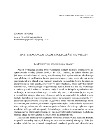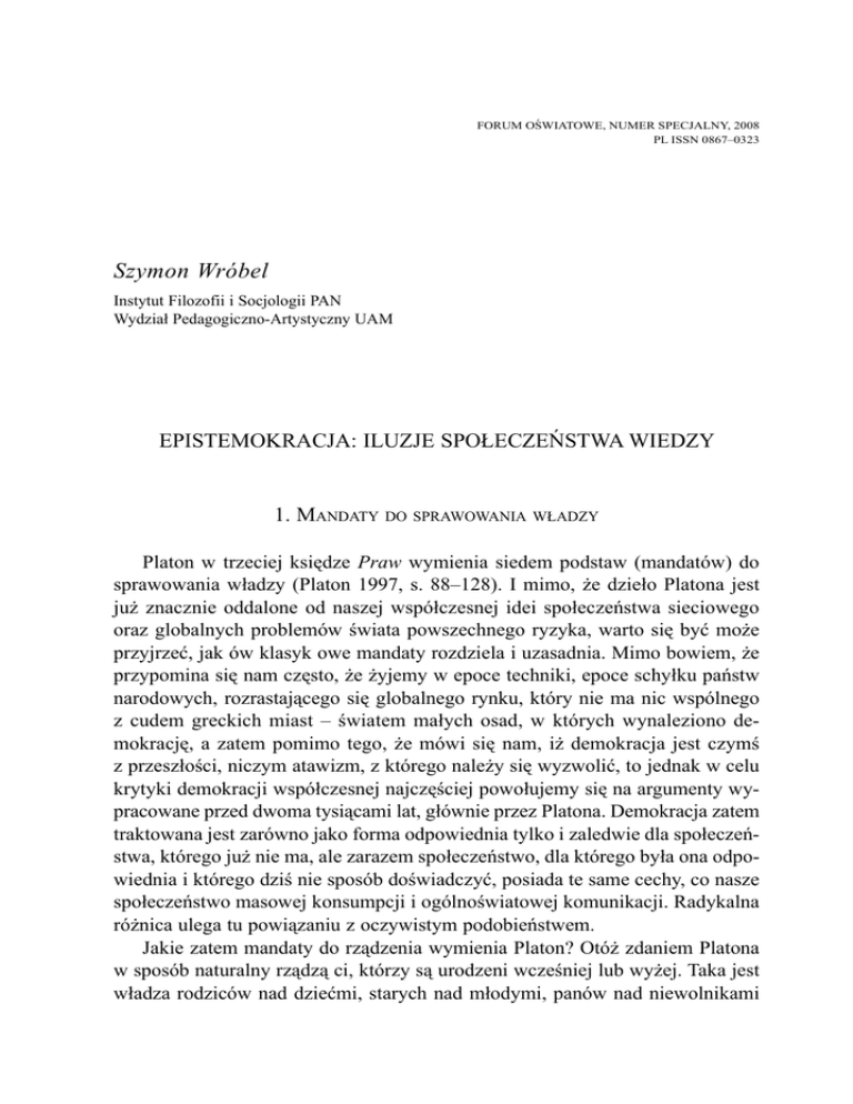FORUM OŚWIATOWE, numer specjalny, 2008 PL ISSN 0867–0323 Szymon Wróbel Instytut Filozofii i Socjologii PAN Wydział Pedagogiczno-Artystyczny UAM Epistemokracja: iluzje społeczeństwa wiedzy 1. Mandaty do sprawowania władzy Platon w trzeciej księdze Praw wymienia siedem podstaw (mandatów) do sprawowania władzy (Platon 1997, s. 88–128). I mimo, że dzieło Platona jest już znacznie oddalone od naszej współczesnej idei społeczeństwa sieciowego oraz globalnych problemów świata powszechnego ryzyka, warto się być może przyjrzeć, jak ów klasyk owe mandaty rozdziela i uzasadnia. Mimo bowiem, że przypomina się nam często, że żyjemy w epoce techniki, epoce schyłku państw narodowych, rozrastającego się globalnego rynku, który nie ma nic wspólnego z cudem greckich miast – światem małych osad, w których wynaleziono demokrację, a zatem pomimo tego, że mówi się nam, iż demokracja jest czymś z przeszłości, niczym atawizm, z którego należy się wyzwolić, to jednak w celu krytyki demokracji współczesnej najczęściej powołujemy się na argumenty wypracowane przed dwoma tysiącami lat, głównie przez Platona. Demokracja zatem traktowana jest zarówno jako forma odpowiednia tylko i zaledwie dla społeczeństwa, którego już nie ma, ale zarazem społeczeństwo, dla którego była ona odpowiednia i którego dziś nie sposób doświadczyć, posiada te same cechy, co nasze społeczeństwo masowej konsumpcji i ogólnoświatowej komunikacji. Radykalna różnica ulega tu powiązaniu z oczywistym podobieństwem. Jakie zatem mandaty do rządzenia wymienia Platon? Otóż zdaniem Platona w sposób naturalny rządzą ci, którzy są urodzeni wcześniej lub wyżej. Taka jest władza rodziców nad dziećmi, starych nad młodymi, panów nad niewolnikami 154 Szymon Wróbel lub też ludzi dobrze urodzonych nad ludźmi nieszlachetnymi. Ta pierwsza rodzi paternokrację, druga – gerontokrację, trzecia – oligarchię, czwarta – arystokrację. Kolejny mandat do rządzenia także ma korzenie naturalne i związany jest z prawem silniejszych wobec słabszych. Przyczyna kontrowersyjności tego prawa wiąże się z tym, iż nie jest do końca jasne kryterium pozwalające zdefiniować najsilniejszych. W Gorgiaszu, gdzie problem ten postawiony jest najmocniej i najjaśniej, wyprowadzono wniosek, że władzę tę można zrozumieć prawidłowo tylko o tyle, o ile utożsami się ją z autorytetem tych, którzy wiedzą. Zatem władza silniejszego (dyktatura) przeradza się w władzę wiedzącego (epistemokrację). Właśnie taki jest szósty mandat do sprawowania władzy: to wiedza pozwala rządzić garstce wtajemniczonych nad ignorantami. Ten argument, przeniesiony do świata, w którym wiedza stanowi dobro szczególne, uzyskuje właściwą wymowę. Skoro wiedza i dostęp do wiedzy staje się dziś stawką większości gier społecznych, to być może groźba epistemokracji jest w dobie współczesnej szczególnie intensywna i wyraźna. Być może też słynny raport o stanie wiedzy Jean-François Lyotarda był pierwszym sygnałem w sprawie rodzącej się epistemokracji. Lyotard w swym słynnym raporcie o stanie wiedzy z roku 1979 pisał przecież: Wiedza w postaci informatycznego towaru nieodzownego dla zdolności produkcyjnych jest już i stanie się główną stawką, być może najważniejszą, światowego wyścigu do władzy. Tak jak poszczególne państwa walczyły, by opanować nowe terytoria, a później, by zapanować nad rozdziałem i eksploatacją surowców i taniej siły roboczej, tak jest do pomyślenia, że będą w przyszłości walczyły, by zapanować nad informacją (Lyotard 1997, s. 32). Lyotard wyobraża sobie, że strumienie informacji mogą kształtować koryto życia tak samo jak strumienie kapitału. W strumieniach kapitału, jedne służą do podejmowania decyzji, a inne do spłacania długów. Podobnie z informacjami: jedne będą zarezerwowane dla decydentów, inne natomiast będą służyły do spłacania wiecznego długu każdego z nas wobec społeczeństwa – długu związanego z procesem socjalizacji i edukacji. Lyotard twierdzi w rezultacie, że uprawomocnienie to procedura, dzięki której prawodawca zostaje upoważniony do ogłoszenia prawa jako normy. Stąd już od Platona kwestia uprawomocnienia nauki okazuje się nierozerwalnie związana z kwestią uprawomocnienia prawodawcy. Stąd też wiedza i władza to dwa oblicza tego samego pytania: kto decyduje o tym, co to jest wiedza i kto wie, jak należy decydować? Wróćmy jeszcze do Platona. Wszystkie wymienione przez Platona uprawnienia do rządzenia spełniają dwa warunki: po pierwsze, każdy z nich definiuje jasno hierarchię; po drugie zaś, definiuje ją przy zachowaniu ciągłości z naturą: Epistemokracja: iluzje społeczeństwa wiedzy 155 w przypadku pierwszych czterech ciągłość ta utrzymana jest za pośrednictwem relacji rodzinnych i społecznych, w kolejnych dwóch chodzi o ciągłość bezpośrednią. Pierwsze cztery ustanawiają porządek państwa/miasta w oparciu o prawa pokrewieństwa. Kolejne domagają się dla tego porządku pewnej wyższej zasady: ci, którzy rządzą, to nie ci, którzy urodzili się wcześniej lub są lepiej urodzeni, ale po prostu ci, którzy są najlepsi. W tym właśnie momencie zaczyna się polityka. Gdy zasada rządów zostaje oddzielona od pokrewieństwa, przy jednoczesnym stwierdzeniu, iż jest ona wymiarem natury, kiedy zatem pewna zasada powołuje się na naturę, którą jednak już nie sposób zidentyfikować z relacjami typu ojciecsyn, Bóg-plemię, pan-niewolnik lub stary-młody zaczyna się polityka rozumiana jako sztuka legitymizacji nietrwałych mandatów do rządzenia. Tu jednak natrafiamy na siódme, najbardziej problematyczne Platońskie kryterium sprawowania władzy. Paradoks tego uprawnienia polega na tym, że nie będąc żadnym jasnym kryterium, sprawia ono wrażenie mandatu najbardziej sprawiedliwego. Jest to władza sprawowana z
