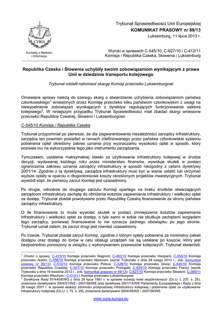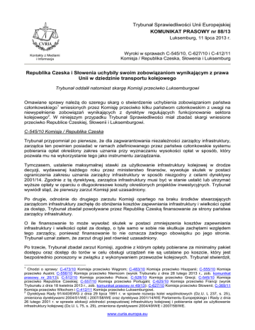 Trybunał Sprawiedliwości Unii Europejskiej KOMUNIKAT PRASOWY nr 88/13 Luksemburg, 11 lipca 2013 r. Kontakty z Mediami i Informacja Wyroki w sprawach C-545/10, C-627/10 i C-412/11 Komisja / Republika Czeska, Słowenia i Luksemburg Republika Czeska i Słowenia uchybiły swoim zobowiązaniom wynikającym z prawa Unii w dziedzinie transportu kolejowego Trybunał oddalił natomiast skargę Komisji przeciwko Luksemburgowi Omawiane sprawy należą do szeregu skarg o stwierdzenie uchybienia zobowiązaniom państwa członkowskiego1 wniesionych przez Komisję przeciwko kilku państwom członkowskim z uwagi na niewypełnienie zobowiązań wynikających z dyrektyw regulujących funkcjonowanie sektora kolejowego2. W niniejszym przypadku Trybunał Sprawiedliwości miał zbadać skargi wniesione przeciwko Republice Czeskiej, Słowenii i Luksemburgowi. C-545/10 Komisja / Republika Czeska Trybunał przypomniał po pierwsze, że dla zagwarantowania niezależności zarządcy infrastruktury, zarządca ten powinien posiadać w ramach zdefiniowanego przez państwa członkowskie systemu pobierania opłat określony zakres uznania przy wyznaczaniu wysokości opłat w sposób, który pozwala mu na wykorzystanie tego jako instrumentu zarządzania. Tymczasem, ustalenie maksymalnej stawki za użytkowanie infrastruktury kolejowej w drodze decyzji, wydawanej każdego roku przez ministerstwo finansów, wywołuje skutek w postaci ograniczenia zakresu uznania zarządcy infrastruktury w sposób niezgodny z celami dyrektywy 2001/14. Zgodnie z tą dyrektywą, zarządca infrastruktury musi być w stanie ustalić lub utrzymać wyższe opłaty w oparciu o długookresowe koszty określonych projektów inwestycyjnych. Trybunał wywiódł stąd, że pierwszy zarzut Komisji jest uzasadniony. Po drugie, odnośnie do drugiego zarzutu Komisji opartego na braku środków stwarzających zarządcom infrastruktury zachętę do obniżenia kosztów zapewniania infrastruktury i wielkości opłat za dostęp, Trybunał zbadał powoływane przez Republikę Czeską finansowanie ze strony państwa zarządcy infrastruktury. O ile finansowanie to może wywołać skutek w postaci zmniejszenia kosztów zapewniania infrastruktury i wielkości opłat za dostęp, o tyle samo w sobie nie skutkuje zachętami względem tego zarządcy, ponieważ finansowanie to nie oznacza żadnego obowiązku po jego stronie. Trybunał uznał zatem, że zarzut drugi jest również uzasadniony. Po trzecie, Trybunał zbadał zarzut Komisji, zgodnie z którym opłaty pobierane za minimalny pakiet dostępu oraz dostęp do torów w celu obsługi urządzeń nie są ustalane po koszcie, który jest bezpośrednio ponoszony w związku z wykonywaniem przewozów kolejowych. Trybunał stwierdził, 1 Chodzi o sprawy: C-473/10 Komisja przeciwko Węgrom; C-483/10 Komisja przeciwko Hiszpanii; C-555/10 Komisja przeciwko Austrii; C-556/10 Komisja przeciwko Niemcom (wyrok Trybunału z dnia 28 lutego 2013 r., zob. komunikat prasowy nr 20/13); C-512/10 Komisja przeciwko Polsce; C-528/10 Komisja przeciwko Grecji; C-545/10 Komisja przeciwko Republice Czeskiej; C-557/10 Komisja przeciwko Portugalii; C-625/10 Komisja przeciwko Francji (wyrok Trybunału z dnia 18 kwietnia 2013 r., zob. komunikat prasowy nr 49/13); C-627/10 Komisja przeciwko Słowenii; C-369/11 Komisja przeciwko Włochom i C-412/11 Komisja przeciwko Luksemburgowi. 2 Dyrektywa Rady 91/440/EWG z dnia 29 lipca 1991 r. w sprawie rozwoju kolei wspólnotowych (Dz.U. L 237, s. 25), zmieniona dyrektywami 2004/51/WE i 2007/58/WE oraz dyrektywa 2001/14/WE Parlamentu Europejskiego i Rady z dnia 26 lutego 2001 r. w sprawie alokacji zdolności przepustowej infrastruktury kolejowej i pobierania opłat za użytkowanie infrastruktury kolejowej (Dz.U. L 75, s. 29), zmieniona dyrektywami 2004/49/WE i 2007/58/WE. www.curia.europa.eu że Komisja nie przedstawiła konkretnych przykładów ukazujących, że opłaty za dostęp są ustalane przez władze czeskie z pominięciem wymogów dyrektywy. W konsekwencji, Trybunał uznał ten zarzut za bezzasadny. Po czwarte, Komisja uważa, że poprzez nieustanowienie planu poprawy wydajności mającego na celu stworzenie zachęty zarówno dla przedsiębiorstw kolejowych, jak i zarządcy infrastruktury do zredukowania do minimum zakłóceń i poprawy wydajności sieci, Republika Czeska uchybiła swoim zobowiązaniom wynikającym z prawa Unii. Z uwagi na fakt, że Trybunał stwierdził, że nie można postrzegać powołanych przez Republikę Czeską przepisów ustawowych i postanowień umów zbiorowych za stanowiące spójną i transparentną całość, którą można zakwalifikować jako „plan poprawy wydajnościˮ, uznał ten zarzut za uzasadniony. Po piąte, Komisja podnosi, że zgodnie z prawem czeskim decyzje urzędu transportu kolejowego mogą być zaskarżane w drodze odwołania administracyjnego do ministerstwa transportu. Tymczasem, takie przedsądowe odwołanie administracyjne byłoby sprzeczne z dyrektywą 2001/14. W tym względzie Trybunał stwierdził, że z tego aktu wynika, że decyzje administracyjne wydane przez organ kontroli mogą być poddane wyłącznie kontroli sądowej i orzekł zatem, że przepisy czeskie naruszają prawo Unii. C-627/10 Komisja / Słowenia Dyrektywa 91/440 stanowi, że dla zagwarantowana sprawiedliwego i niedyskryminującego dostępu do infrastruktury kolejowej, „podstawowe funkcjeˮ należy powierzyć organom lub przedsiębiorstwom, które same nie świadczą żadnych kolejowych usług transportowych. Wśród tych podstawowych funkcji znajduje się w szczególności przydzielanie przedsiębiorstwom transportu kolejowego tras pociągów, czyli przydzielanie określonego czasu na ruch pociągów na części sieci kolejowej. W tym kontekście Komisja zarzuciła przede wszystkim Słowenii, że uchybiła zobowiązaniom w zakresie, w jakim słoweński zarządca infrastruktury, który również dostarcza usługi transportu kolejowego, uczestniczy w ustalaniu rozkładów jazd