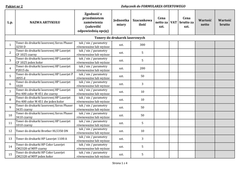 Załącznik do FORMULARZA OFERTOWEGO Pakiet nr 2 L.p. NAZWA ARTYKUŁU Zgodność z przedmiotem zamówienia (zakreślić odpowiednią opcję) Jednostka miary Cena Cena Szacunkowa netto za VAT brutto za ilość szt. szt. Tonery do drukarek laserowych 1 2 3 4 5 6 7 8 9 10 11 Toner do drukarki laserowej Xerox Phaser 3250 D Toner do drukarki laserowej HP Laserjet CP 1025 czarny Toner do drukarki laserowej HP Laserjet CP 1025 jeden kolor Toner do drukarki laserowej HP Laserjet P2015 dn Toner do drukarki laserowej HP Laserjet P 2055 d Toner do drukarki laserowej HP Laserjet 1020 Toner do drukarki laserowej HP Laserjet Pro 400 color M 451 dw czarny Toner do drukarki laserowej HP Laserjet Pro 400 color M 451 dw jeden kolor Toner do drukarki laserowej Xerox Phaser 3435 czarny Toner do drukarki laserowej Xerox Phaser 3410 czarny Toner do drukarki laserowej HP Laserjet 1010 czarny 12 Toner do drukarki Brother HL5350 DN 13 Toner do drukarki HP Laserjet 1100 A 14 15 Toner do drukarki HP Color Laserjet CM2320 nf MFP czarny Toner do drukarki HP Color Laserjet CM2320 nf MFP jeden kolor tak / nie / parametry równoważne lub wyższe tak / nie / parametry równoważne lub wyższe tak / nie / parametry równoważne lub wyższe tak / nie / parametry równoważne lub wyższe tak / nie / parametry równoważne lub wyższe tak / nie / parametry równoważne lub wyższe tak / nie / parametry równoważne lub wyższe tak / nie / parametry równoważne lub wyższe tak / nie / parametry równoważne lub wyższe tak / nie / parametry równoważne lub wyższe tak / nie / parametry równoważne lub wyższe tak / nie / parametry równoważne lub wyższe tak / nie / parametry równoważne lub wyższe tak / nie / parametry równoważne lub wyższe tak / nie / parametry równoważne lub wyższe szt. 300 szt. 5 szt. 5 szt. 200 szt. 50 szt. 3 szt. 10 szt. 10 szt. 50 szt. 50 szt. 5 szt. 10 szt. 3 szt. 5 szt. 5 Strona 1 z 4 Wartość netto Wartość brutto Załącznik do FORMULARZA OFERTOWEGO Pakiet nr 2 L.p. 16 17 18 19 20 21 22 23 24 NAZWA ARTYKUŁU Toner do drukarki laserowej HP Laserjet Pro 400 M 401 dn czarny Toner do drukarki laserowej OKI B 430d czarny Toner do drukarki laserowej Xerox Phaser 3428 Toner do drukarki laserowej CD1028 / DC 2028 Toner do drukarki laserowej Samsung ML 2240 Monio Laser Printer czarny Toner do drukarki HP Office Jet Pro 8000 czarny Toner do drukarki HP Office Jet Pro 8000 kolor Toner do drukarki HP Color Laserjet CP5220 czarny Toner do drukarki HP Color Laserjet CP5220 jeden kolor 25 Toner do drukarki Xerox 7400 jeden kolor 26 Toner do drukarki Xerox 7400 czarny Zgodność z przedmiotem zamówienia (zakreślić odpowiednią opcję) tak / nie / parametry równoważne lub wyższe tak / nie / parametry równoważne lub wyższe tak / nie / parametry równoważne lub wyższe tak / nie / parametry równoważne lub wyższe tak / nie / parametry równoważne lub wyższe tak / nie / parametry równoważne lub wyższe tak / nie / parametry równoważne lub wyższe tak / nie / parametry równoważne lub wyższe tak / nie / parametry równoważne lub wyższe tak / nie / parametry równoważne lub wyższe tak / nie / parametry równoważne lub wyższe Jednostka miary Cena Cena Szacunkowa netto za VAT brutto za ilość szt. szt. szt. 50 szt. 10 szt. 20 szt. 2 szt. 3 szt. 5 szt. 5 szt. 3 szt. 3 szt. 3 szt. 3 Tusze do drukarek atramentowych 27 Tusz do drukarki HP Deskjet 4260 D czarny 28 Tusz do drukarki HP Deskjet 4260 D kolor tak / nie / parametry równoważne lub wyższe tak / nie / parametry równoważne lub wyższe szt. 5 szt. 5 Tonery do kserokopiarek 29 Toner do ksero Canon i R1018 tak / nie / parametry równoważne lub wyższe szt. Strona 2 z 4 3 Wartość netto Wartość brutto Załącznik do FORMULARZA OFERTOWEGO Pakiet nr 2 L.p. 30 31 32 NAZWA ARTYKUŁU Toner do ksero Canon i R2016J Toner do ksero Konica Minolta Bizhub C253 czarny Toner do ksero Konica Minolta Bizhub C253 jeden kolor 33 Toner do ksero Konica Minolta Bizhub 282 34 Toner do ksero Konica Minolta 7022/7028 35 Toner do ksero Konica Minolta page PRO 1380 MF Zgodność z przedmiotem zamówienia (zakreślić odpowiednią opcję) tak / nie / parametry równoważne lub wyższe tak / nie / parametry równoważne lub wyższe tak / nie / parametry równoważne lub wyższe tak / nie / parametry równoważne lub wyższe tak / nie / parametry równoważne lub wyższe tak / nie / parametry równoważne lub wyższe Jednostka miary Cena Cena Szacunkowa netto za VAT brutto za ilość szt. szt. szt. 3 szt. 6 szt. 7 szt. 6 szt. 6 szt. 3 Tonery do faksów 36 Toner do faksu Panasonic KX-FL 613 37 Toner do faksu Canon JX200 czarny 38 Toner do faksu Canon JX200 jeden kolor 39 Toner do faksu Panasonic KX-FT 35 40 Toner do faksu Panasonic KX-FT 986 41 Toner do faksu Panasonic KX-MB 2025 tak / nie / parametry równoważne lub wyższe tak / nie / parametry równoważne lub wyższe tak / nie / parametry równoważne lub wyższe tak / nie / parametry równoważne lub wyższe tak / nie / parametry równoważne lub wyższe tak / nie / parametry równoważne lub wyższe szt. 10 szt. 2 szt. 3 szt. 2 szt. 2 szt. 5 Inne 42 Taśma do drukarki OKI Microline 3320 43 Toner do robota Rimage 2000 i czarny tak / nie / parametry równoważne lub wyższe tak / nie / parametry równoważne lub wyższe szt. 2 szt. 10 Strona 3 z 4 Wartość netto Wartość brutto Załącznik do FORMULARZA OFERTOWEGO Pakiet nr 2 L.p. 44 NAZWA ARTYKUŁU Toner do robota Rimage 2000 i kolor Zgodność z przedmiotem zamówienia (zakreślić odpowiednią opcję) Jednostka miary tak / nie / parametry równoważne lub wyższe szt. SUMA Strona 4 z 4 Cena Cena Szacunkowa netto za VAT brutto za ilość szt. szt. 10 Wartość netto Wartość brutto