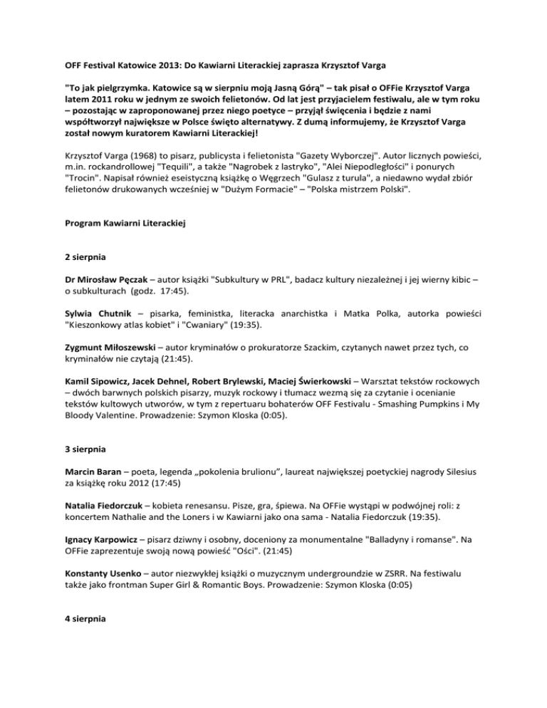 OFF Festival Katowice 2013: Do Kawiarni Literackiej zaprasza Krzysztof Varga "To jak pielgrzymka. Katowice są w sierpniu moją Jasną Górą" – tak pisał o OFFie Krzysztof Varga latem 2011 roku w jednym ze swoich felietonów. Od lat jest przyjacielem festiwalu, ale w tym roku – pozostając w zaproponowanej przez niego poetyce – przyjął święcenia i będzie z nami współtworzył największe w Polsce święto alternatywy. Z dumą informujemy, że Krzysztof Varga został nowym kuratorem Kawiarni Literackiej! Krzysztof Varga (1968) to pisarz, publicysta i felietonista "Gazety Wyborczej". Autor licznych powieści, m.in. rockandrollowej "Tequili", a także "Nagrobek z lastryko", "Alei Niepodległości" i ponurych "Trocin". Napisał również eseistyczną książkę o Węgrzech "Gulasz z turula", a niedawno wydał zbiór felietonów drukowanych wcześniej w "Dużym Formacie" – "Polska mistrzem Polski". Program Kawiarni Literackiej 2 sierpnia Dr Mirosław Pęczak – autor książki "Subkultury w PRL", badacz kultury niezależnej i jej wierny kibic – o subkulturach (godz. 17:45). Sylwia Chutnik – pisarka, feministka, literacka anarchistka i Matka Polka, autorka powieści "Kieszonkowy atlas kobiet" i "Cwaniary" (19:35). Zygmunt Miłoszewski – autor kryminałów o prokuratorze Szackim, czytanych nawet przez tych, co kryminałów nie czytają (21:45). Kamil Sipowicz, Jacek Dehnel, Robert Brylewski, Maciej Świerkowski – Warsztat tekstów rockowych – dwóch barwnych polskich pisarzy, muzyk rockowy i tłumacz wezmą się za czytanie i ocenianie tekstów kultowych utworów, w tym z repertuaru bohaterów OFF Festivalu - Smashing Pumpkins i My Bloody Valentine. Prowadzenie: Szymon Kloska (0:05). 3 sierpnia Marcin Baran – poeta, legenda „pokolenia brulionu”, laureat największej poetyckiej nagrody Silesius za książkę roku 2012 (17:45) Natalia Fiedorczuk – kobieta renesansu. Pisze, gra, śpiewa. Na OFFie wystąpi w podwójnej roli: z koncertem Nathalie and the Loners i w Kawiarni jako ona sama - Natalia Fiedorczuk (19:35). Ignacy Karpowicz – pisarz dziwny i osobny, doceniony za monumentalne "Balladyny i romanse". Na OFFie zaprezentuje swoją nową powieść "Ości". (21:45) Konstanty Usenko – autor niezwykłej książki o muzycznym undergroundzie w ZSRR. Na festiwalu także jako frontman Super Girl & Romantic Boys. Prowadzenie: Szymon Kloska (0:05) 4 sierpnia Piotr Paziński – autor książek "Pensjonat" i "Ptasie ulice", laureat "Paszportu Polityki", redaktor naczelny miesięcznika "Midrasz". Literacki prawnuk Brunona Schulza i Isaaca Singera zarazem. (17:45) Ksiądz Andrzej Draguła – Między sztuką a blasfemią. Ksiądz Draguła bada związki popkultury z religią, rocka z wiarą, skandalu z Bogiem, co opisał w książkach "Copyright na Jesusa" i "Bluźnierstwo. Między grzechem a przestępstwem". (19:35) Jurij Andruchowycz – jeżeli kiedyś Akademia Szwedzka uzna, że trzeba dać wreszcie Nobla Ukrainie, Jurij będzie absolutnym faworytem. Poza tym to ambasador polskiej literatury na Ukrainie i ukraińskiej w Polsce. Prawdziwa gwiazda. (21:45) Krzysztof Siwczyk, Maciej Melecki, Marta Podgórnik, czyli "Śląski beat" - trójka poetów z Mikołowa i Gliwic, strażnicy dziedzictwa Rafała Wojaczka. (0:05)