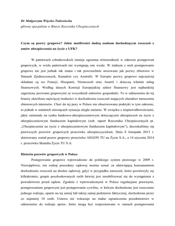Dr Małgorzata Więcko-Tułowiecka główny specjalista w Biurze Rzecznika Ubezpieczonych Czym są pozwy grupowe? Jakie możliwości dadzą osobom dochodzącym roszczeń z umów ubezpieczenia na życie z UFK? W państwach członkowskich istnieje ogromna różnorodność w zakresie postępowań grupowych, w wielu państwach nie występują one wcale. W żadnym z nich postępowanie grupowe nie jest jednak tak znane i tak powszechnie stosowane jak pozwy zbiorowe w Stanach Zjednoczonych, Kanadzie czy Australii. W Europie pozwy grupowe najczęściej składane są we Francji, Hiszpanii, Niemczech oraz Austrii i dotyczą właśnie usług finansowych. Według danych Komisji Europejskiej sektor finansowy jest najbardziej zagrożony pozwami grupowymi ze wszystkich sektorów gospodarki. To w odniesieniu do tej branży określono najwięcej trudności w dochodzeniu roszczeń mających charakter naruszenia zbiorowych interesów. Choć do tej pory w Polsce nie obserwowano praktyki w tym zakresie, to jednak w ostatnich miesiącach sytuacja uległa zmianie. W związku z nieprawidłowościami, jakie zaistniały na rynku bankowo-ubezpieczeniowym dotyczącymi ubezpieczeń na życie z ubezpieczeniowym funduszem kapitałowym (zob. raport Rzecznika Ubezpieczonych pt. „Ubezpieczenia na życie z ubezpieczeniowym funduszem kapitałowym”), doczekaliśmy się pierwszych pozwów grupowych przeciwko ubezpieczycielom. Dnia 8 listopada 2013 r. skierowany został pozew grupowy przeciwko AEGON TU na Życie S.A., a 14 stycznia 2014 r. przeciwko Skandia Życie TU S.A. Historia pozwów grupowych w Polsce Postępowanie grupowe wprowadzono do polskiego system prawnego w 2009 r. Niewątpliwie, ten rodzaj procedury sądowej można uznać za ułatwiającą konsumentom dochodzenie roszczeń na drodze sądowej, gdyż w przypadku naruszeń, które powtórzyły się kilkakrotnie, grupie poszkodowanych osób łatwiej jest zmobilizować się do wystąpienia z powództwem przed sądem. Zgodnie z wprowadzonymi w Polsce regulacjami prawnymi, postępowaniem grupowym jest postępowanie cywilne, w którym dochodzone jest roszczenie jednego rodzaju, oparte na tej samej lub takiej samej podstawie faktycznej, dochodzone przez co najmniej 10 osób. Ustawa nie wskazuje na żadne ograniczenia przedmiotowe w odniesieniu do rodzaju spraw, które mogą być rozpoznawane w ramach postępowania grupowego, jak również nie przewiduje ograniczeń podmiotowych. Powództwo w tym trybie może wytoczyć wyłącznie tzw. reprezentant grupy, który oprócz wszczęcia postępowania ma ponadto obowiązek zebrania grupy, obowiązek wybrania pełnomocnika czy ustalenia wynagrodzenia pełnomocnika. Wyjątkiem od tej zasady jest sytuacja, w której grupa jest reprezentowana przez powiatowego lub miejskiego rzecznika konsumentów. Brak jednak takiej kompetencji w odniesieniu do Rzecznika Ubezpieczonych. Reprezentant grupy prowadzi postępowanie w imieniu własnym, jednak na rzecz wszystkich członków grupy. Aby zabezpieczyć interesy członków grupy, przepisy przewidują możliwość zmiany reprezentanta, a także możliwość kontroli dokonywania przez niego czynności dyspozytywnych. Pozwy grupowe złożone przeciwko ubezpieczycielom spełniają wszystkie powyższe wymogi prawne. Dotyczą grup konsumentów powyżej 100 osób. Ich roszczenia są tego samego rodzaju – są to roszczenia pieniężne, oparte są na tej samej podstawie faktycznej, jak i prawnej, dotyczą bowiem pobrania przez ubezpieczycieli wysokich opłat tzw. likwidacyjnych, wskutek czego konsumenci pozbawieni zostali znacznej części, a nawet całości środków pieniężnych wpłaconych w ramach umowy ubezpieczenia na życie z ubezpieczeniowym funduszem kapitałowym. Jednak kwestia opłat likwidacyjnych była już wielokrotnie analizowana przez sądy, w tym przez Sąd Ochrony Konkurencji i Konsumentów, który uznał następujące klauzule za niedozwolone (Tabela nr 1). Tabela nr 1 Klauzule abuzywne dotyczące opłat likwidacyjnych Nr wpisu w rejestrze Treść niedozwolonej klauzuli Nazwa zakładu ubezpieczeń klauzul niedozwolonych 1749 „Wartość wykupu jest to procent rezerwy ING TU na Życie matematycznej przypadającej na daną umowę S.A. główną z wyłączeniem rezerwy na świadczenie dodatkowe umowy głownej, zgodnie z poniższą tabelą: - Liczba pełnych lat polisowych, za które opłacono wszystkie składki całkowite; - Wartość wykupu jako procent rezerwy matematycznej przypadającej na daną umowę główną z wyłączeniem rezerwy na świadczenie dodatkowe umowy głównej: a) 2 lata - 80 % wartości wykupu, b) 3 lata - 85 % wartości wykupu, c) 4 lata - 90 % wartości wykupu, d) 5 i więcej lat - 95 % wartości wykupu. Wysokość wartości wykupu oblicza się według stanu rezerwy matematycznej przypadającej na umowę główną z wyłączeniem rezerwy na świadczenie dodatkowe umowy głównej, na wcześniejszy z dni (dalej: dzień wartości wykupu): a) dzień następujący po ostatnim dniu opłaconego okresu, tj. termin płatności składki całkowitej najdawniej wymagalnej albo b) dzień rozwiązania lub wygaśnięcia umowy głównej. Wartość wykupu, obliczona zgodnie z postanowieniami ust. 1 i 2, jest pomniejszana o sumę zaległych powiększana całkowitej składek o część należnej za całkowitych opłaconej okres, w lub składki jakim Ubezpieczyciel nie będzie udzielał ochrony ubezpieczeniowej. Gdy składka za umowę główną została opłacona Ubezpieczający jednorazowo, nabywa prawo do wypłaty wartości wykupu dnia następnego, licząc od dnia rozpoczęcia odpowiedzialności. Wartość wykupu stanowi wtedy 95 wyłączeniem % rezerwy rezerwy matematycznej na z świadczenie dodatkowe umowy głównej, przypadającej na daną umowę główną w dniu rozwiązania umowy głównej. Jeżeli dzień wartości wykupu przypada po przekształceniu ubezpieczenie umowy ubezpieczenia bezskłądkowe, to w wartość wykupu stanowi 95 % rezerwy matematycznej z wyłącz