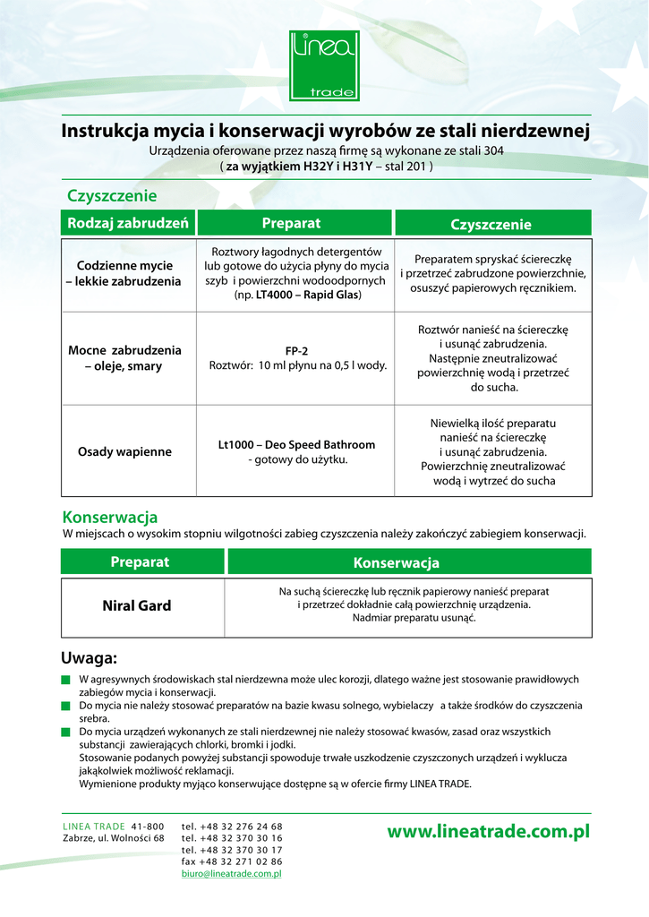 Instrukcja mycia i konserwacji wyrobów ze stali nierdzewnej Urządzenia oferowane przez naszą firmę są wykonane ze stali 304 ( za wyjątkiem H32Y i H31Y – stal 201 ) Czyszczenie Rodzaj zabrudzeń Czyszczenie Roztwory łagodnych detergentów Preparatem spryskać ściereczkę lub gotowe do użycia płyny do mycia i przetrzeć zabrudzone powierzchnie, szyb i powierzchni wodoodpornych osuszyć papierowych ręcznikiem. (np. LT4000 – Rapid Glas) Codzienne mycie – lekkie zabrudzenia Mocne zabrudzenia – oleje, smary Osady wapienne Preparat FP-2 Roztwór: 10 ml płynu na 0,5 l wody. Roztwór nanieść na ściereczkę i usunąć zabrudzenia. Następnie zneutralizować powierzchnię wodą i przetrzeć do sucha. Lt1000 – Deo Speed Bathroom - gotowy do użytku. Niewielką ilość preparatu nanieść na ściereczkę i usunąć zabrudzenia. Powierzchnię zneutralizować wodą i wytrzeć do sucha Konserwacja W miejscach o wysokim stopniu wilgotności zabieg czyszczenia należy zakończyć zabiegiem konserwacji. Preparat Niral Gard Konserwacja Na suchą ściereczkę lub ręcznik papierowy nanieść preparat i przetrzeć dokładnie całą powierzchnię urządzenia. Nadmiar preparatu usunąć. Uwaga: W agresywnych środowiskach stal nierdzewna może ulec korozji, dlatego ważne jest stosowanie prawidłowych zabiegów mycia i konserwacji. Do mycia nie należy stosować preparatów na bazie kwasu solnego, wybielaczy a także środków do czyszczenia srebra. Do mycia urządzeń wykonanych ze stali nierdzewnej nie należy stosować kwasów, zasad oraz wszystkich substancji zawierających chlorki, bromki i jodki. Stosowanie podanych powyżej substancji spowoduje trwałe uszkodzenie czyszczonych urządzeń i wyklucza jakąkolwiek możliwość reklamacji. Wymienione produkty myjąco konserwujące dostępne są w ofercie firmy LINEA TRADE. LINEA TRADE 41-800 Zabrze, ul. Wolności 68 tel. +48 32 276 24 68 tel. +48 32 370 30 16 tel. +48 32 370 30 17 fax +48 32 271 02 86 [email protected] www.lineatrade.com.pl