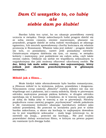 Dam Ci wszystko to, co lubię ale siebie dam po ślubie! Bardzo lubię ten cytat, bo on ukazuje prawidłowy rozwój uczucia w związku. Dwoje zakochanych ludzi pragnie dzielić się ze sobą swoim czasem, swoimi marzeniami, planami na przyszłość, pragnie dzielić ze sobą radość wynikającą ze zdanego egzaminu, lub smutek spowodowany choćby kończącą się właśnie promocją w Rossmanie. Właśnie taka jest miłość – pragnie dzielić się tym, co posiadamy, nawet jeśli posiadamy niewiele. Ostatecznym etapem dzielenia się tym, co mamy, w związku kobiety i mężczyzny, jest podzielenie się całym sobą, czyli także swoim ciałem. Oddanie się siebie we współżyciu seksualnym to najpiękniejszy dar jaki możemy ofiarować ukochanej osobie. To dar, który tak mało sobie cenimy, dar najcenniejszy, który jednak jest skarbem przechowywanym w glinianym naczyniu… Miłość jak z filmu… Może kiedyś takie sformułowanie było bardzo romantyczne, a filmowa miłość to ta wyśniona, jedyna, prawdziwa i dozgonna. Tymczasem coraz częściej „filmowy” rozwój miłości nie ma nic wspólnego ani z pięknem, ani z samą miłością. Kiedy w pierwszym odcinku mężczyzna poznaje piękną kobietę, w drugim odcinku spotykają się w kawiarni, to wiadomo, że w trzeciej scenie pójdą ze sobą do łóżka (oby w trzeciej a nie w pierwszej!). Niestety popkultura coraz częściej pragnie „wychowywać” młode pokolenia w źle rozumianej wolności ukazując karykatury miłości jako miłość prawdziwą. Bo przecież ta serialowa para jest w sobie bardzo zakochana, a skoro się kochają to najlepszym dowodem na to jest współżycie seksualne – mało kogo interesuje to, że niewiele się znają… przecież się kochają… Nie jest trudno przewidzieć dalszy scenariusz filmu, w którym na pewno pojawi się rozstanie tych dwojga ludzi. Niestety wielu ludzi zapomina, że film jest tylko filmem, a aktorzy którzy grają zakochaną parę, po nagraniu wracają do prawdziwego życia osobistego, którego nie budują na chwilowych popędach, ale starają się ułożyć sobie szczęśliwą przyszłość. Film nie pokazuje zranień tych ludzi spowodowanych rozstaniem, to zawsze będą nieudolne próby i namiastki zobrazowania rzekomej tragedii rozstania. W filmie nie ukazuje się bólu rozstania, panuje przekonanie skoro nie ten, to inny; tego kwiatu to pół światu… Zatem dlaczego się okłamuje młodych ludzi poszukujących prawdziwej miłości? Czemu podświadomie przekazuje się im obraz życia w ramach hasła: rób co chcesz, jesteś wolny? To nic złego, popatrz wszyscy tak robią… Rozwój miłości według filmowej popkultury: 1. Scena = Zauroczenie 2. Scena = Silne uczucie 3. Scena = Seks 4. Scena = Rozstanie Biznes ważniejszy niż człowiek Niestety rządza zysku przysłania powinność mówienia prawdy. Jeśli w młodym pokoleniu uda się zaszczepić „filmowy rozwój miłości w związku” to będzie to okazją do zysku dla wielu ludzi, dla wielu ludzi poza tymi nastolatkami, którzy wpadną w pułapkę wielkich koncernów… Dobrze zareklamowane zło często się sprzedaje. A kto korzysta na niewiedzy młodzieży? Otóż np. producenci środków antykoncepcyjnych, bo przecież wczesny seks wymaga dobrego zabezpieczenia. Kto chciałby zostać 14 – letnią mamą…? Nie muszę wspominać, że wypadałoby jakoś wyglądać, przecież „żadna ryba nie chwyci złej przynęty” dlatego należy kupować najnowszej generacji kremy wygładzające cerę i używać najpiękniejszych perfum z feromonami. Pomijam już podkreślające sylwetkę stroje, albo raczej skąpe skrawki materiału… Najlepsze są te, reklamowane w telewizji – przynajmniej tak mniemają Ci, którzy je reklamują… I w taki oto sposób, wydając sporo pieniędzy, możemy zmarnować sobie życie. Ciekawe czy sprzedałaby się reklama: Zmarnuj sobie życie, za jedyne 21,99 zł? Prawidłowy rozwój miłości w związku Film filmem, scenariusz scenariuszem, ale co zrobić, by nie ulec popkulturze i nie dać sobie zrobić wody z mózgu? Jak pokierować rozwojem naszego związku, żeby nie zakończył się dramatycznym rozstaniem już przy czwartym spotkaniu? Każde osiągnięcie w naszym życiu poprzedzone jest odpowiednim wysiłkiem. Tylko to co złe przychodzi samo i nic nas nie kosztuje. Dziecko zanim zacznie chodzić musi się sporo namęczyć, musi wiele razy upaść, musi przezwyciężyć swoje zniechęcenie. Gdy uczymy się jeździć na rowerze jest podobnie. Kiedy chcemy zdobyć złoty medal na turnieju trampkarzy musimy sporo trenować. Nie zdobędziemy szczytu góry, jeśli nie podejmiemy wysiłku wejścia na nią… Tak samo jest z miłością! Nie zbudujemy prawdziwej miłości, jeśli nie będziemy pracowali nad rozwojem naszego związku. Stąd też rozwój miłości w związku nie może być przysłonięty przez zbyt wczesne współżycie seksualne, co tak bardzo promują media. Seks bardzo zbliża ludzi do siebie, ale utrudnia dokonywanie racjonalnych wyborów. Jeśli w pierwszej scenie naszego życia kogoś poznamy, jeśli w drugiej pójdziemy do kawiarni, to w trzeciej powinniśmy spotkać się ze znajomymi, podzielić się pasjami, pójść na wspólną wycieczkę, poznać się lepiej… Pewnością jest, że w naszym związku pojawią się kryzysy, być może będą to tak wielkie różnice poglądowe, że nie pozwolą nam być ze sobą całe życie. Wtedy trzeba podjąć decyzję rozumową, co czynić dalej: być ze sobą, czy zostać przyjaciółmi. Ale racjonalna decyzja jest możliwa tylko wtedy, kiedy nie doszło między nami do współżycia seksualnego. Jeśli oddaliśmy się sobie całkowicie, to lęk przed rozstaniem zaćmi trzeźwość naszego wyboru co może pozbawić nas szczęścia na całe życie. Kryzys możne prowadzić do rozstania, lub umocnić naszą relację, ale tylko świadomy wybór poprowadzi nas do szczęścia! Prawidłowy rozwój miłości w życiu: 1. Za