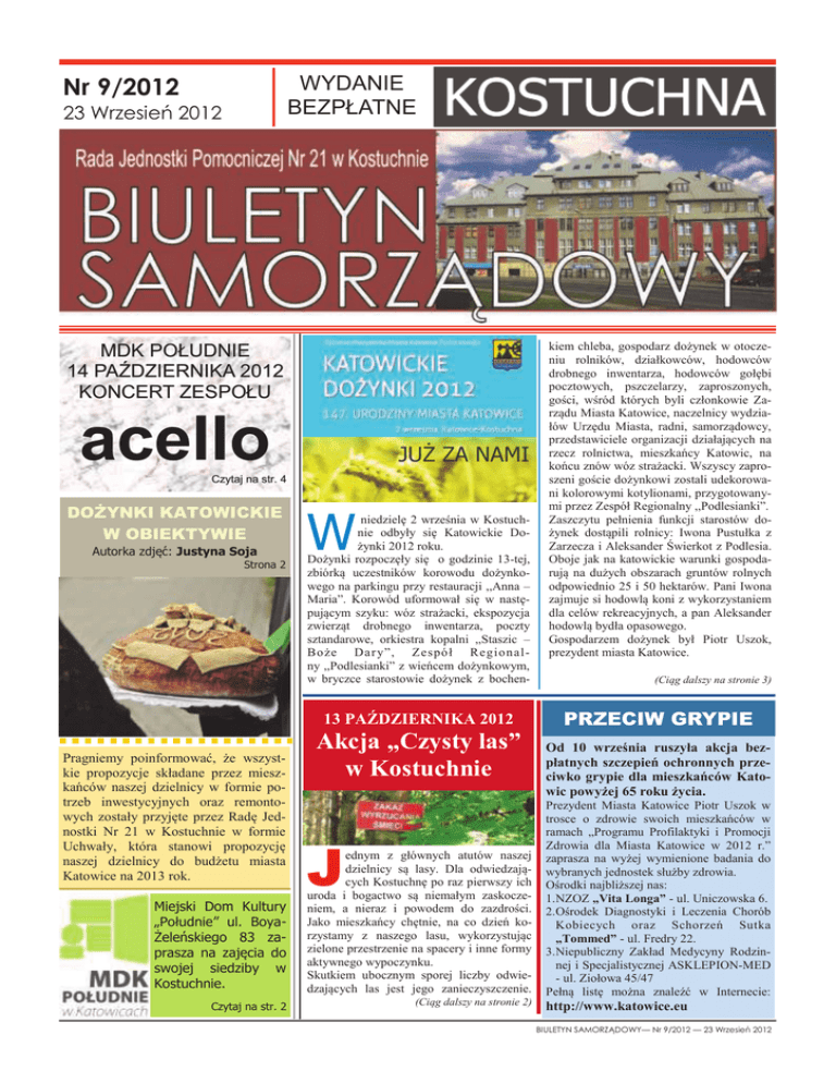 Nr 9/2012 WYDANIE BEZPŁATNE 23 Wrzesień 2012 MDK POŁUDNIE 14 PAŹDZIERNIKA 2012 KONCERT ZESPOŁU acello JUŻ ZA NAMI Czytaj na str. 4 DOŻYNKI KATOWICKIE W OBIEKTYWIE Autorka zdjęć: Justyna Soja Strona 2 W niedzielę 2 września w Kostuchnie odbyły się Katowickie Dożynki 2012 roku. Dożynki rozpoczęły się o godzinie 13-tej, zbiórką uczestników korowodu dożynkowego na parkingu przy restauracji ,,Anna – Maria”. Korowód uformował się w następującym szyku: wóz strażacki, ekspozycja zwierząt drobnego inwentarza, poczty sztandarowe, orkiestra kopalni ,,Staszic – Boże Da r y”, Zespół Regionalny ,,Podlesianki” z wieńcem dożynkowym, w bryczce starostowie dożynek z bochen- 13 PAŹDZIERNIKA 2012 Pragniemy poinformować, że wszystkie propozycje składane przez mieszkańców naszej dzielnicy w formie potrzeb inwestycyjnych oraz remontowych zostały przyjęte przez Radę Jednostki Nr 21 w Kostuchnie w formie Uchwały, która stanowi propozycję naszej dzielnicy do budżetu miasta Katowice na 2013 rok. Akcja „Czysty las” w Kostuchnie J Miejski Dom Kultury „Południe” ul. BoyaŻeleńskiego 83 zaprasza na zajęcia do swojej siedziby w Kostuchnie. ednym z głównych atutów naszej dzielnicy są lasy. Dla odwiedzających Kostuchnę po raz pierwszy ich uroda i bogactwo są niemałym zaskoczeniem, a nieraz i powodem do zazdrości. Jako mieszkańcy chętnie, na co dzień korzystamy z naszego lasu, wykorzystując zielone przestrzenie na spacery i inne formy aktywnego wypoczynku. Skutkiem ubocznym sporej liczby odwiedzających las jest jego zanieczyszczenie. Czytaj na str. 2 (Ciąg dalszy na stronie 2) kiem chleba, gospodarz dożynek w otoczeniu rolników, działkowców, hodowców drobnego inwentarza, hodowców gołębi pocztowych, pszczelarzy, zaproszonych, gości, wśród których byli członkowie Zarządu Miasta Katowice, naczelnicy wydziałów Urzędu Miasta, radni, samorządowcy, przedstawiciele organizacji działających na rzecz rolnictwa, mieszkańcy Katowic, na końcu znów wóz strażacki. Wszyscy zaproszeni goście dożynkowi zostali udekorowani kolorowymi kotylionami, przygotowanymi przez Zespół Regionalny ,,Podlesianki”. Zaszczytu pełnienia funkcji starostów dożynek dostąpili rolnicy: Iwona Pustułka z Zarzecza i Aleksander Świerkot z Podlesia. Oboje jak na katowickie warunki gospodarują na dużych obszarach gruntów rolnych odpowiednio 25 i 50 hektarów. Pani Iwona zajmuje si hodowlą koni z wykorzystaniem dla celów rekreacyjnych, a pan Aleksander hodowlą bydła opasowego. Gospodarzem dożynek był Piotr Uszok, prezydent miasta Katowice. (Ciąg dalszy na stronie 3) PRZECIW GRYPIE Od 10 września ruszyła akcja bezpłatnych szczepień ochronnych przeciwko grypie dla mieszkańców Katowic powyżej 65 roku życia. Prezydent Miasta Katowice Piotr Uszok w trosce o zdrowie swoich mieszkańców w ramach „Programu Profilaktyki i Promocji Zdrowia dla Miasta Katowice w 2012 r.” zaprasza na wyżej wymienione badania do wybranych jednostek służby zdrowia. Ośrodki najbliższej nas: 1.NZOZ „Vita Longa” - ul. Uniczowska 6. 2.Ośrodek Diagnostyki i Leczenia Chorób Kobiecych oraz Schorzeń Sutka „Tommed” - ul. Fredry 22. 3.Niepubliczny Zakład Medycyny Rodzinnej i Specjalistycznej ASKLEPION-MED - ul. Ziołowa 45/47 Pełną listę można znaleźć w Internecie: http://www.katowice.eu BIULETYN SAMORZĄDOWY— Nr 9/2012 — 23 Wrzesień 2012 Strona 2 (Ciąg dalszy ze strony 1) 13 PAŹDZIERNIKA 2012 Akcja „Czysty las” w Kostuchnie Ilość śmieci zalegających w krzakach czasami przeraża. Nie zawsze jest to wynik złej woli, a raczej zaniedbania i lenistwa wielu spośród nas – na spacerze zdarza nam się upuścić papierek po batoniku, czy zostawić puszkę z piwa. Pojedyncze przypadki mogą się wydawać nieszkodliwe, ale pomnożone, składają się na efekt, który zbyt często musimy oglądać na spacerach. W skrajnych wypadkach niestety zdarza się, że las jest traktowany po prostu jako wysypisko, na które z premedytacją wyrzuca się stare opony, worki ze śmieciami, a nawet lodówki, czy telewizory. Dlatego po kończącym się lecie, pragniemy zachęcić, aby poświęcić trochę swojego czasu na włączenie się w akcję sprzątania naszego zielonego azylu. W dniu 13 października o godz. 9.00 zapraszamy wszystkich chętnych do spotkania na terenie tak zwanej polany biwakowej (skrzyżowanie ulic: Szarych Szeregów i Michała Kałuży), skąd rozpoczniemy prace porządkowe. Na miejscu będą zapewnione rękawiczki jednorazowe i worki na śmieci. Warto zaangażować się na ten jeden poranek, aby od wiosny cieszyć się znów pięknem czystego lasu. Aleksander Uszok DOŻYNKI KATOWICKIE W OBIEKTYWIE Autorka zdjęć: Justyna Soja Zapraszamy serdecznie dzieci, młodzież i dorosłych do wzięcia udziału w zajęciach organizowanych we wszystkich filiach MDK „Południe”. Wierzymy, że każdy znajdzie tutaj coś dla siebie, co pomoże mu zrealizować swoje pasje, odpocząć czy też zaczerpnąć trochę zdrowia. Obok przedstawiamy propozycje naszej filii w Kostuchnie. BIULETYN SAMORZĄDOWY— Nr 9/2012 — 23 Wrzesień 2012 Strona 3 JUŻ ZA NAMI (Ciąg dalszy ze strony 1) Barwny korowód, którego przemarsz zabezpieczała policja o godzinie 13:30 udekorowanymi ulicami Szarych Szeregów, Boya Żeleńskiego i Migdałowców wyruszył do kościoła parafialnego pod wezwaniem Trójcy Przenajświętszej. Złożony z tak licznych grup korowód prowadzony w rytmach marszów, prezentował się bardzo okazale. Po dotarciu do kościoła, który na tą okoliczność został pięknie przystrojony, członkinie Zespołu Regionalnego ,,Podlesianki” ustawiły przed ołtarzem okazały wieniec dożynkowy. Przy ołtarzu były już złożone owoce i warzywa z tegorocznych zbiorów, ofiarowane przez działkowców i miód ofiarowany przez pszczelarzy w otoczenie bukietów z słoneczników. Czas do rozpoczęcia Mszy Świętej wypełnił mini koncert c