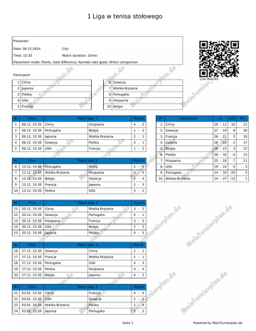 1 Liga w tenisa stołowego Presenter: Date: 06.12.2014 City: Time: 15:30 Match duration: 10min Placement mode: Points, Goal difference, Number own goals, Direct comparison Participant Live Results 1 Chiny 6 Szwecja 2 Japonia 7 Wielka Brytania 3 Polska 8 Portugalia 4 USA 9 Hiszpania 5 Francja 10 Belgia Nr Time 1 06.12. 15:30 Chiny Match day: 1 Hiszpania 4 : 0 Result Pl 1. Chiny Participant 29 : 13 G GD 16 Pts 21 2 06.12. 15:30 Portugalia Belgia 1 : 3 2. Szwecja 27 : 18 9 20 3 06.12. 15:30 Japonia Wielka Brytania 2 : 1 3. Francja 26 : 21 5 20 4 06.12. 15:30 Szwecja Polska 3 : 1 4. Japonia 26 : 24 2 17 5 06.12. 15:30 USA Francja 1 : 2 5. Belgia 26 : 23 3 15 Nr Time 6 13.12. 15:30 7 6. Polska 26 : 30 -4 12 Match day: 2 Result 7. Hiszpania 25 : 18 7 11 Portugalia Chiny 2 : 2 8. USA 19 : 24 -5 5 13.12. 15:30 Wielka Brytania Hiszpania 0 : 4 9. Portugalia 14 : 34 -20 5 8 13.12. 15:30 Belgia Szwecja 2 : 4 14 : 27 -13 1 9 13.12. 15:30 Francja Japonia 2 : 3 10 13.12. 15:30 Polska USA 3 : 2 Nr Time 11 20.12. 15:30 Chiny Wielka Brytania 3 : 2 12 20.12. 15:30 Szwecja Portugalia 4 : 1 13 20.12. 15:30 Hiszpania Francja 3 : 3 14 20.12. 15:30 USA Belgia 2 : 3 15 20.12. 15:30 Japonia Polska 4 : 5 Nr Time 16 27.12. 15:30 17 18 Match day: 3 10. Wielka Brytania Result Match day: 4 Result Szwecja Chiny 2 : 2 27.12. 15:30 Francja Wielka Brytania 2 : 1 27.12. 15:30 Portugalia USA 4 : 3 19 27.12. 15:30 Polska Hiszpania 0 : 4 20 27.12. 15:30 Belgia Japonia 4 : 5 Nr Time 21 03.01. 15:30 Chiny Francja 4 : 4 22 03.01. 15:30 USA Szwecja 1 : 2 23 03.01. 15:30 Wielka Brytania Polska 2 : 4 24 03.01. 15:30 Japonia Portugalia 3 : 2 Match day: 5 Result Seite 1 Powered by MeinTurnierplan.de 1 Liga w tenisa stołowego 25 03.01. 15:30 Hiszpania Belgia 1 : 2 Seite 2 Powered by MeinTurnierplan.de 1 Liga w tenisa stołowego Nr Time Match day: 6 Result 26 10.01. 15:30 USA Chiny 2 : 3 27 10.01. 15:30 Polska Francja 2 : 3 28 10.01. 15:30 Szwecja Japonia 2 : 2 29 10.01. 15:30 Belgia Wielka Brytania 4 : 2 30 10.01. 15:30 Portugalia Hiszpania 0 : 6 Nr Time 31 17.01. 15:30 Chiny Polska 6 : 0 32 17.01. 15:30 Japonia USA 3 : 3 33 17.01. 15:30 Francja Belgia 3 : 2 34 17.01. 15:30 Hiszpania Szwecja 3 : 4 35 17.01. 15:30 Wielka Brytania Portugalia 2 : 2 Match day: 7 Result Nr Time Match day: 8 Result 36 24.01. 15:30 Japonia Chiny 1 : 3 37 24.01. 15:30 Belgia Polska 6 : 3 38 24.01. 15:30 USA Hiszpania 2 : 2 39 24.01. 15:30 Portugalia Francja 2 : 3 40 24.01. 15:30 Szwecja Wielka Brytania 3 : 2 Nr Time 41 31.01. 15:30 42 Match day: 9 Result Belgia Chiny 0 : 2 31.01. 15:30 Hiszpania Japonia 2 : 3 43 31.01. 15:30 Polska Portugalia 8 : 0 44 31.01. 15:30 Wielka Brytania USA 2 : 3 45 31.01. 15:30 Francja Szwecja 4 : 3 Seite 3 Powered by MeinTurnierplan.de