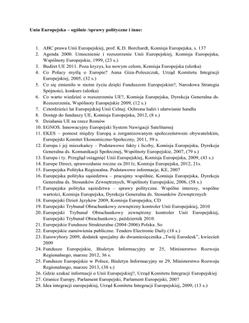 Unia Europejska – ogólnie /sprawy polityczne i inne: 1. ABC prawa Unii Europejskiej, prof. K.D. Borchardt, Komisja Europejska, s. 137 2. Agenda 2000. Umocnienie i rozszerzenie Unii Europejskiej, Komisja Europejska, Wspólnoty Europejskie, 1999, (23 s.) 3. Budżet UE 2011. Poza kryzys, ku nowym celom, Komisja Europejska (ulotka) 4. Co Polacy myślą o Europie? Anna Giza-Poleszczuk, Urząd Komitetu Integracji Europejskiej, 2005, (32 s.) 5. Co się zmieniło w moim życiu dzięki Funduszom Europejskim?, Narodowa Strategia Spójności, konkurs (ulotka) 6. Co warto wiedzieć o rozszerzeniu UE?, Komisja Europejska, Dyrekcja Generalna ds. Rozszerzenia, Wspólnoty Europejskie 2009, (12 s.) 7. Czterdzieści lat Europejskiej Unii Celnej. Ochrona ludzi i ułatwianie handlu 8. Dostęp do funduszy UE, Komisja Europejska, 2012, (8 s.) 9. Działania UE na rzecz Romów 10. EGNOS. Innowacyjny Europejski System Nawigacji Satelitarnej 11. EKES – pomost między Europą a zorganizowanym społeczeństwem obywatelskim, Europejski Komitet Ekonomiczno-Społeczny, 2011, 59 s. 12. Europa i jej mieszkańcy – Podstawowe fakty i liczby, Komisja Europejska, Dyrekcja Generalna ds. Komunikacji Społecznej, Wspólnoty Europejskie, 2007, (79 s.) 13. Europa i ty. Przegląd osiągnięć Unii Europejskiej, Komisja Europejska, 2009, (43 s.) 14. Europe Direct, sprawozdanie roczne za 2011r, Komisja Europejska, 2012, 21s. 15. Europejska Polityka Regionalna. Podstawowe informacje, KE, 2007 16. Europejska polityka sąsiedztwa – pracujmy wspólnie, Komisja Europejska, Dyrekcja Generalna ds. Stosunków Zewnętrznych, Wspólnoty Europejskie, 2006, (58 s.) 17. Europejska polityka sąsiedztwa – sprawy polityczne. Wspólne interesy, wspólne wartości, Komisja Europejska, Dyrekcja Generalna ds. Stosunków Zewnętrznych 18. Europejski Dzień Języków 2009, Komisja Europejska, CD 19. Europejski Trybunał Obrachunkowy zewnętrzny kontroler Unii Europejskiej, 2010 20. Europejski Trybunał Obrachunkowy zewnętrzny kontroler Unii Europejskiej, Europejski Trybunał Obrachunkowy, październik 2010. 21. Europejskie Fundusze Strukturalne (2004-2006) Polska. So 22. Europejskie zamówienia publiczne. Tenders Electronic Daily (18 s.) 23. Eurowybory 2009, dodatek specjalny do dwumiesięcznika „Twój Eurodesk”, kwiecień 2009 24. Fundusze Europejskie, Biuletyn Informacyjny nr 25, Ministerstwo Rozwoju Regionalnego, marzec 2012, 36 s. 25. Fundusze Europejskie w Polsce, Biuletyn Informacyjny nr 29, Ministerstwo Rozwoju Regionalnego, marzec 2013, (38 s.) 26. Gdzie szukać informacji o Unii Europejskiej?, Urząd Komitetu Integracji Europejskiej 27. Granice Europy, Parlament Europejski, Parlament Europejski, 2007 28. Idea integracji europejskiej, Urząd Komitetu Integracji Europejskiej, 2009, (13 s.) 29. Instrument pomocy przedakcesyjnej – Nowy wymiar pomocy UE w procesie rozszerzenia, Komisja Europejska – Dyrekcja Generalna ds. Rozszerzenia, Dział A2: Informacja i komunikacja (20 s.) 30. Instytucje Unii Europejskiej, Urząd Komitetu Integracji Europejskiej, 2009, (27 s.) 31. Jak działa Unia Europejska. Przewodnik po instytucjach unijnych, Komisja Europejska, Wspólnoty Europejskie, 2007, (46 s.) 32. Jak pisać zrozumiale, Komisja Europejska, 2010, (15 s.) 33. Jedna waluta dla jednej europy, Komisja Europejska, 2012, 20s. 34. Key publications of the European Union, Publications Office, 2011, (107 s.) 35. Key publications of the European Union, Publications Office, 2012, (109 s.) 36. Komisja Europejska 2010-2014. Profile i priorytety, Komisja Europejska, 2010, (59 s.) 37. Komitet Regionów i polska prezydencja w Radzie Unii Europejskiej, Komitet Regionów, 42 s. 38. Konstytucja dla Europy 39. Kontakt z UE. Zadaj pytanie – wyraź swoją opinię, Komisja Europejska, Dyrekcja Generalna ds. Komunikacji Społecznej, Wspólnoty Europejskie, 2007, (14 s.) 40. Kontrola połowów, Komisja Europejska, Gospodarka Morska i Rybołówstwo 41. Mały przewodnik po euro, Komisja Europejska, 2011. 42. Mapa Unii Europejskiej, Urząd Komitetu Integracji Europejskiej, 2009 43. Miejsce Polski w Europie. Polska na arenie międzynarodowej. Bezpieczeństwo energetyczne kraju, Przedstawicielstwo Komisji Europejskiej w Polsce, (14 s.) 44. N- Lex. Wspólny portal prawa krajowego, Urząd Publikacji, (4 s.) 45. Nowe spojrzenie na Europę: telewizja internetowa Parlamentu Europejskiego 46. Odkryj Europejski Komitet Ekonomiczno-Społeczny, Europejski Komitet Ekonomiczno-Społeczny, 2011 47. Okres programowania 2007-2013. Ekspertyzy, Tom I, Ministerstwo Rozwoju Regionalnego, 2006, (67 s.) 48. Panorama Unii Europejskiej – mapa, Komisja Europejska, 2007 49. Panorama Unii Europejskiej, Komisja Europejska, Wspólnoty Europejskie, 2002 50. Parlament Europejski – Biuro Informacyjne w Polsce 51. Parlament Europejski bez tajemnic, 2008, CD 52. Parlament Europejski, Dyrekcja Generalna ds. Komunikacji Parlamentu Europejskiego, 2009, (47 s.) 53. Parlament Europejski, Urząd Komitetu Integracji Europejskiej, 2009, (20 s.) 54. Partnerski proces budowania Europy. Stanowisko Komitetu Regionów na temat najważniejszych kierunków polityki UE październik 2009, Komitet Regionów, 2009, (21 s.) 55. PHARE. Rozwój instytucjonalny – co się zmieniło na lepsze, Urząd Komitetu Integracji Europejskiej, 2007, (24 s.) 56. Pięć lat członkostwa Polski w Unii Europejskiej w perspektywie społecznej, Praca zbiorowa pod redakcją dr Elżbiety Skotnickiej-Illasiewicz, Urząd Komitetu Integracji Europejskiej, 2009, (286 s.) 57. Pięć lat w Unii Europejskiej. Bilans członkowstwa Polski, Urząd Komitetu Integracji Europejskiej, 2009, (15 s.) 58. Pięćdziesiąt ścieżek w kierunku największych sukcesów Europy, Komisja Europejska, Wspólnoty Europejskie, 2007, (50 s.) 59. Po europejsku. Języki w Unii Europejskiej, Komisja Europejska, Wspólnoty Europejskie, 2008, (16 s.) 60. Podróże po Europie 2008, Komisja Europejska, 2008 61. Polska prezydencja w Radzie Unii Europejskiej, portal 