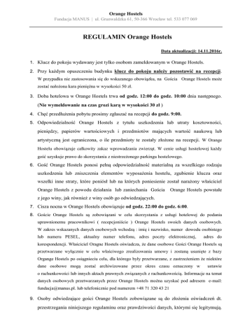 Orange Hostels Fundacja MANUS | ul. Grunwaldzka 61, 50-366 Wrocław tel. 533 077 069 REGULAMIN Orange Hostels Data aktualizacji: 14.11.2016r. 1. Klucz do pokoju wydawany jest tylko osobom zameldowanym w Orange Hostels. 2. Przy każdym opuszczeniu budynku klucz do pokoju należy pozostawić na recepcji. W przypadku nie zastosowania się do wskazanego obowiązku, na Gościa Orange Hostels może zostać nałożona kara pieniężna w wysokości 50 zł. 3. Doba hotelowa w Orange Hostels trwa od godz. 12:00 do godz. 10:00 dnia następnego. (Nie wymeldowanie na czas grozi karą w wysokości 30 zł ) 4. Chęć przedłużenia pobytu prosimy zgłaszać na recepcji do godz. 9:00. 5. Odpowiedzialność Orange Hostels z tytułu uszkodzenia lub utraty kosztowności, pieniędzy, papierów wartościowych i przedmiotów mających wartość naukową lub artystyczną jest ograniczona, o ile przedmioty te zostały złożone na recepcji. W Orange Hostelu obowiązuje całkowity zakaz wprowadzania zwierząt. W cenie usługi hostelowej każdy gość uzyskuje prawo do skorzystania z niestrzeżonego parkingu hostelowego. 6. Gość Orange Hostels ponosi pełną odpowiedzialność materialną za wszelkiego rodzaju uszkodzenia lub zniszczenia elementów wyposażenia hostelu, zgubienie klucza oraz wszelki inne straty, które poniósł lub na których poniesienie został narażony właściciel Orange Hostels z powodu działania lub zaniechania Gościa Orange Hostels powstałe z jego winy, jak również z winy osób go odwiedzających. 7. Cisza nocna w Orange Hostels obowiązuje od godz. 22:00 do godz. 6:00. 8. Goście Orange Hostels są zobowiązani w celu skorzystania z usługi hotelowej do podania uprawnionemu pracownikowi ( recepcjoniście ) Orange Hostels swoich danych osobowych. W zakres wskazanych danych osobowych wchodzą : imię i nazwisko, numer dowodu osobistego lub numeru PESEL, aktualny numer telefonu, adres poczty elektronicznej, adres do korespondencji. Właściciel Oragne Hostels oświadcza, że dane osobowe Gości Orange Hostels są przetwarzane wyłącznie w celu właściwego zrealizowania umowy i zostaną usunięte z bazy Organge Hostels po osiągnieciu celu, dla którego były przetwarzane, z zastrzeżeniem że niektóre dane osobowe mogą zostać archiwizowane przez okres czasu oznaczony w ustawie o rachunkowości lub innych aktach prawnych związanych z rachunkowością. Informacje na temat danych osobowych przetwarzanych przez Orange Hostels można uzyskać pod adresem e-mail: [email protected]. lub telefonicznie pod numerem +48 71 320 43 21 9. Osoby odwiedzające gości Orange Hostels zobowiązane są do złożenia oświadczeń dt. przestrzegania niniejszego regulaminu oraz prawdziwości danych, którymi się legitymują. Orange Hostels Fundacja MANUS | ul. Grunwaldzka 61, 50-366 Wrocław tel. 533 077 069 Informacje dotyczące ochrony danych osobowych zawarte w pkt 8 mają zastosowanie również do osób odwiedzających Gości Orange Hostels. 10. Po godz. 23:00 w pokojach Orange Hostels mogą przebywać osoby tylko zameldowane. 11. W przypadku pozostania na noc osoby odwiedzającej gości Orange Hostels, rano przy opuszczaniu budynku zostanie od tej osoby pobrana opłata za nocleg w wysokości 60 zł. 12. Pobieranie takich akcesoriów jak: czajnik, ręcznik, garnki, patelnie jest możliwe na recepcji po wpłaceniu kaucji zwrotnej w wysokości 25zł i okazaniu się dokumentem tożsamości, którego numer zostanie wpisany do ewidencji prowadzonej przez upoważnionego pracownika Orange Hostels. Osoba pobierająca ponosi odpowiedzialność za użyczone rzeczy. Jeżeli osoba pobierająca zwróci użyczone akcesoria w stanie uszkodzenia, które powstało podczas trwania stosunku użyczenia, wówczas kaucja nie podlega zwrotowi a zostaje zaliczona na poczet naprawienia szkody, powstałej z powodu uszkodzenia rzeczy wypożyczonej. 13. Rezygnację z usług hotelowych należy zgłosić z minimum 7 dniowym wyprzedzeniem pisemnie w recepcji lub drogą mailową na adres [email protected] 14. Zwrot opłaty za usługi hotelowe, z których klient zrezygnował zostanie dokonany przez Orange Hostels tylko w przypadku zachowania 7-dniowego terminu rezygnacji. 15. Zwrot opłaty za usługi hotelowe, z których klient zrezygnował jest możliwy tylko na podstawie paragonu, faktury bądź potwierdzenia płatności. 16. Reklamacje związane z usługami hotelowymi świadczonymi przez Orange Hostels przyjmowane są w formie pisemnej przez Recepcję lub za pośrednictwem poczty elektronicznej. Z zastrzeżeniem, że drogą elektroniczną przyjmujemy skany pism odręcznie podpisanych jak również reklamacje podmiotów dysponujących elektronicznym podpisem kwalifikowanym z certyfikatem bezpieczeństwa. Pisma będą rozpatrywane w ciągu 14 dni od daty wpłynięcia reklamacji. 17. W przypadku pozytywnego rozpatrzenia reklamacji, zwrot opłaty za usługi hotelowe jest możliwy tylko na podstawie potwierdzenia płatności dysponowanym przez Klienta (paragon, potwierdzenie płatności lub potwierdzenie przelewu) 18. Do kwestii nieuregulowanych w niniejszym regulaminie mają zastosowanie przepisy Kodeksu Cywilnego. Zarząd Fundacji MANUS