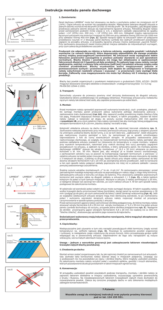 Instrukcja montażu panela dachowego 1. Zamówienie: rys.1A ® LAMBDA® Krokiew Kontrłata Deskowanie Mata dystansowa folia / membrana paroprzepuszczalna rys.1B 200 200 LAMBDA® Producent nie odpowiada za różnice w kolorze odcienia, wyglądzie powłoki i odchyłach wymiarów (w ramach tolerancji, które dopuszczają odpowiednie dla danego produktu normy) między poszczególnymi zamówieniami. Na arkuszach może występować lekkie falowanie powierzchni (szczególnie w powłoce poliester standard) co jest zjawiskiem normalnym. Blachy Aluzinc i powlekane nie mogą być składowane w opakowaniach fabrycznych dłużej niż 3 tygodnie od daty produkcji. Po upływie tego czasu należy rozciąć opakowanie, zedrzeć z arkuszy folię ochronną (jeśli jest) i przełożyć arkusze między sobą cienkimi przekładkami. Blachy ocynkowane wolno magazynować jedynie w pomieszczeniach suchych i przewiewnych. Jeśli dojdzie do zawilgocenia w transporcie należy natychmiast rozdzielić arkusze i wysuszyć - w przeciwnym razie wystąpi biała korozja. Całkowity czas magazynowania nie może być dłuższy niż 5 miesięcy od daty produkcji. mm mm mm 200 Krokiew Kontrłata folia / membrana paroprzepuszczalna Łata o Panel dachowy LAMBDA może być stosowany na dachy o pochyleniu połaci nie mniejszym niż 8 (14%). Cięcie arkuszy na wymiar nie uwzględnia skosów. Maksymalna zalecana długość arkusza w jednym odcinku wynosi 8 mb dla profili 25 oraz 10 mb dla profili 38. W przypadku, gdy długość spadu przekracza zalecane odcinki stosuje się naprzemienne łączenie arkuszy. Potrzebną długość należy przed zamówieniem podzielić mniej więcej w 1/3, z dodaniem zakładki odpowiedniej do spadku połaci: >14o (25%) min. 200 mm, ≤ 14o (25%) min. 400 mm. Odległość między naprzemiennie łączonymi arkuszami nie może być mniejsza niż 500 mm przy zakładce równej 200 mm lub 1000 mm przy zakładce równej 400 mm (rys. 2). Sposób nacięcia rąbka na arkuszach celem ich połączanie przedstawia rysunek nr 2 Stosując panel dachowy Lambda bez żadnych przetłoczeń posiadający zagięcie na początku arkusza, w przypadku łączenia arkuszy można zastosować „Łącznik Paneli”. Przy zachowaniu powyższych zasad można dobrać miejsca zakładów do indywidualnych wymagań, przy czym zaleca się je dodatkowo uszczelnić. Blachy bez powłok organicznych z powłokami metalicznymi o grubościach Z200, AZ150 i ZA255 mogą być stosowane wewnątrz obiektów w środowiskach o kategorii korozyjności C1 i C2 wg PN-EN ISO 12944-2:2001. rys.2 2. Transport: Samochody używane do przewozu powinny mieć skrzynię dostosowaną do długości arkuszy. Uszkodzenia lakieru podkładowego nie podlegają reklamacji. Przenosząc arkusze przy rozładunku ręcznym należy tak dobrać ilość osób, aby zapobiec przesuwaniu po sobie blach. 3 3. Montaż: Przed montażem należy sprawdzić poprawność wykonania konstrukcji, czyli: przekątne, płaskość. Do samego montażu paneli producent zaleca wykonanie pełnego deskowania pokrycia i zastosowanie maty dystansowej (rys 1A). Aby zapewnić pustkę powietrzną między blachą a folią lub papą, Producent dopuszcza montaż paneli na łatach, w takim przypadku, rozstaw łat które należy nabijać w kolejności od okapu do szczytu wynosi maksymalnie 200 mm zgodnie z rysunkiem 1B, przy czym ostatnie 2 łaty należy rozmieścić tak aby montując listwę podgąsiorową wkrętami farmerskimi 4,8 x 20 mm „blacha z blachą” nie trafić w łatę. 4 a,b 2 5 3 1 a = 500 mm b = 1000 mm 1 Kolejność układania arkuszy na dachu obrazuje rys. 2, natomiast kierunek układania rys. 3. Zachowanie należytej staranności przy montażu pierwszych arkuszy (kąt prosty z okapem) pozwoli na uniknięcie uciekania blachy do/od rynny, a co za tym idzie tzw. „ząbkowania”. Jeżeli stosujemy pas nadrynnowy musimy pamiętać o tym, by zamontować go w sposób umożliwiający odprowadzanie z folii do rynny ewentualnych skroplin. W przypadku zastosowania pasa nadrynnowego startowego, ze względu na rozszerzalność termiczną blachy należy pamiętać aby podczas zakładania arkuszy zostawić luz (stosownie do temperatury w czasie montażu: większy przy wysokich temperaturach, natomiast przy niskich docisnąć bez luzu) pomiędzy zagięciem początkowym na arkuszu, a ząbkiem na obróbce, o który zahaczamy panel. Do montażu panelu dachowego LAMBDA® stosuje się wkręty montażowe „L” (4,2 x 30 mm) wkręcane za pomocą końcówki o dł. min. 50 mm. Ważne jest, aby wkręcać je w środek otworu montażowego, z zachowaniem odrobiny luzu co pozwoli na kompensację naprężeń termicznych. 2 pierwsze i 2 ostatnie arkusze na każdej połaci mocujemy do każdej łaty. Pozostałe arkusze mocujemy do każdej z 3 kolejnych od okapu, a później co drugą. Każdy arkusz przy okapie należy zamocować do łaty dwoma wkrętami farmerskimi 4,8 x 20 mm po zewnętrznej stronie przetłoczeń. Jeśli to konieczne w ten sam sposób należy połączyć zakłady poprzeczne nie niżej niż w połowie zakładki i zawsze powyżej zastosowanego uszczelnienia. rys.3 2 ® ® ® LAMBDA LAMBDA LAMBDA 3 2 1 W zależności od szerokości połaci ostatni arkusz może wymagać docięcia. W takim wypadku należy wzdłuż krawędzi dachu przymocować listwę (kontrłata), dociąć panel na wymiar powiększony o 30 mm i podgiąć go do góry, po czym zamocować do listwy i całość zamknąć wiatrownicą (rys. 4). Jeśli ze względów estetycznych arkusze skrajne mają mieć identyczną szerokość, to po rozmierzeniu połaci i wyliczeniu szerokości skrajnych arkuszy należy rozpocząć montaż od przycięcia i przymocowania w sposób opisany powyżej 1 arkusza. Przed zamocowaniem gąsiora należy zamontować obróbkę podgąsiorową, do której montażu należy stosować wkręty farmerskie 4,8 x 20 mm lub wkręty montażowe „L” 4,2 x 30 mm (na jeden arkusz panelu Lambda dochodzący do szczytu, przypada jedna