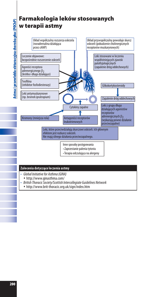 Astma i przewlekła obturacyjna choroba płuc (POChP) Farmakologia leków stosowanych w terapii astmy Układ współczulny rozszerza oskrzela (noradrenalina działająca przez cAMP) Układ przywspółczulny powoduje skurcz oskrzeli (pobudzenie cholinergicznych receptorów muskarynowych) Leki stosowane w leczeniu współistniejących zjawisk patofizjologicznych (zapalenie dróg oddechowych) Leczenie objawowe: bezpośrednie rozszerzenie oskrzeli Agoniści receptora adrenergicznego β2 (krótko i długo działające) Teofilina (inhibitor fosfodiesterazy) Glikokortykosteroidy Leki antymuskarynowe (np. bromek ipratropium) Zapalenie dróg oddechowych Cytokiny zapalne Kromony (mniejsza rola) Antagoniści receptorów leukotrienowych Leki z grupy długo działających agonistów receptorów adrenergicznych β2 (wykazują pewne działanie przeciwzapalne) Leki, które przeciwdziałają skurczowi oskrzeli. Ich głównym efektem jest rozkurcz oskrzeli. Nie mają silnego działania przeciwzapalnego. Inne sposoby postępowania • Zaprzestanie palenia tytoniu • Terapia odczulająca na alergeny Zalecenia dotyczące leczenia astmy • Global Initiative for Asthma (GINA) http://www.ginasthma.com/ • British Thoracic Society/Scottish Intercollegiate Guidelines Network http://www.brit-thoracic.org.uk/sign/index.htm 200 • Global Initiative for Chronic Obstructive Lung Disease (GOLD). Zalecenia na stronie http://www.goldcopd.com/ • POChP charakteryzuje się przewlekłym utrudnieniem przepływu powietrza przez drogi oddechowe, które nie jest całkowicie odwracalne. • Badanie czynności płuc wykazuje: Stosunek FEV1/FVC jest mniejszy niż 70%. FEV1 po podaniu leków rozszerzających oskrzela jest mniejsza niż 80% wartości przewidywanej. • Najczęstszą przyczyną zapalenia, które prowadzi do POChP jest ekspozycja na dym tytoniowy, istotne mogą być również narażenia zawodowe. • Cechą charakterystyczną dla POChP jest nieodwracalne i postępujące zmniejszenie czynności płuc z powodu zapalenia dróg oddechowych. Żaden z obecnie stosowanych leków nie może zapobiec dalszemu rozwojowi choroby, więc farmakoterapia ma za zadanie ograniczenie objawów i powikłań. • Zaprzestanie palenia jest jedynym postępowaniem, które ogranicza pogarszanie się funkcji płuc. Dlatego zerwanie z nałogiem jest kluczowym elementem terapii. Wskazówki dotyczące rzucania palenia znajdują się dalej w tym rozdziale: „Nikotyna”. 3. Układ oddechowy Zasady leczenia przewleklej obturacyjnej choroby płuc (POChP) Leczenie objawowe • Leczenie oparte jest głównie na wziewnych lekach z grupy antagonistów receptorów muskarynowych oraz agonistach receptorów adrenergicznych β2 (β2-mimetyki). Długo działające, wziewne β2-mimetyki są skuteczniejsze i wygodniejsze w użyciu niż krótko działające preparaty, ale za to droższe. • Teofilina jest stosowana jako dodatkowy lek rozszerzający oskrzela u pacjentów z zaawansowaną chorobą; prawdopodobnie może ona wykazywać pewne działanie przeciwzapalnie. • Wziewne kortykosteroidy nie są uważane za bardzo skuteczne i poleca się je jedynie u chorych z obniżeniem FEV1 poniżej 50% oczekiwanych wartości. Ostatnio prowadzone badania wykazały korzystne efekty skojarzonego podawania leków wziewnie (kortykosteroidy + długo działający agoniści receptorów adrenergicznych β2). Należy unikać przewlekłej steroidoterapii; bilans działań pożądanych i szkodliwych jest niekorzystny. Inne metody leczenia • Tlenoterapia odgrywa ważną rolę w ciężkich postaciach choroby; patrz dalej w tym rozdziale: „Tlen”, w celu uzyskania szerszych informacji. • Pacjenci z POChP powinni być co roku szczepieni przeciw grypie, aby zmniejszyć częstość zaostrzeń choroby. • Nie udowodniono, by leczenie mukolityczne przynosiło znaczące korzyści. • Podawanie antyoksydantów może odgrywać pewną rolę w terapii, ale zagadnienie to jest jeszcze w trakcie badań. • Kaszel może być męczącym objawem, ale stanowi ważny mechanizm oczyszczania dróg oddechowych ze śluzu; nie powinno się więc stosować leków przeciwkaszlowych. • Leki stymulujące oddychanie nie są przydatne w przewlekłym leczeniu POChP. Patrz w tym rozdziale: „Doksapram” w celu uzyskania szerszych informacji. 201 Astma i przewlekła obturacyjna choroba płuc (POChP) Krótko działąjące β2-mimetyki Selektywni agoniści receptorów adrenergicznych β2 Pobudzenie receptorów β2 powoduje liczne następstwa (patrz w rozdz. 2: „Agoniści receptorów adrenergicznych”. Klinicznie ważne są: rozszerzenie oskrzeli i rozkurczowe działanie na macicę. Przy podawaniu dużych dawek dochodzi do utraty selektywnego działania na receptory β2, co powoduje tachykardię i drżenie. rozkurczowo zarówno w stanach • Działają ostrych, jak i przewlekłych. Leki w tej klasie Stosowane w celu zniesienia skurczu oskrzeli • Salbutamol • Terbutalina Inne • Bambuterol • Fenoterol • Rimiterol Nie istnieją znaczące różnice między tymi lekami. Najczęściej używane są salbutamol i terbutalina. Stosowane do zahamowania porodu przedwczesnego • Działają tokolitycznie (hamują poród przedwczesny). • Nie istnieją specyficzne przeciwwskaza• Salbutamol nia. • Uczulenia na krótko działające β2-mime- • Ritodryna tyki występują rzadko. • Leki te mogą być stosowane do usuwania odwracalnego zwężenia dróg oddechowych u pacjentów z POChP. Choroba jest tylko w nieznacznym stopniu odwracalna, dlatego efekt działania tych leków pozostaje ograniczony. • W okresie, gdy pacjent stan pacjenta jest dobry, należy przeprowadzić badanie czynności płuc oraz określić stopień odwracalności zmian. • Leki te mogą być stosowane przez kobiety w ciąży. Należy pamiętać o ich działaniu tokolitycznym. • Zwykle nie ma potrzeby zmiany dawkowania w niewydolności nerek lub wątroby. Ostry skurcz oskrzeli • W leczeniu ostrego skurczu oskrzeli zwykl